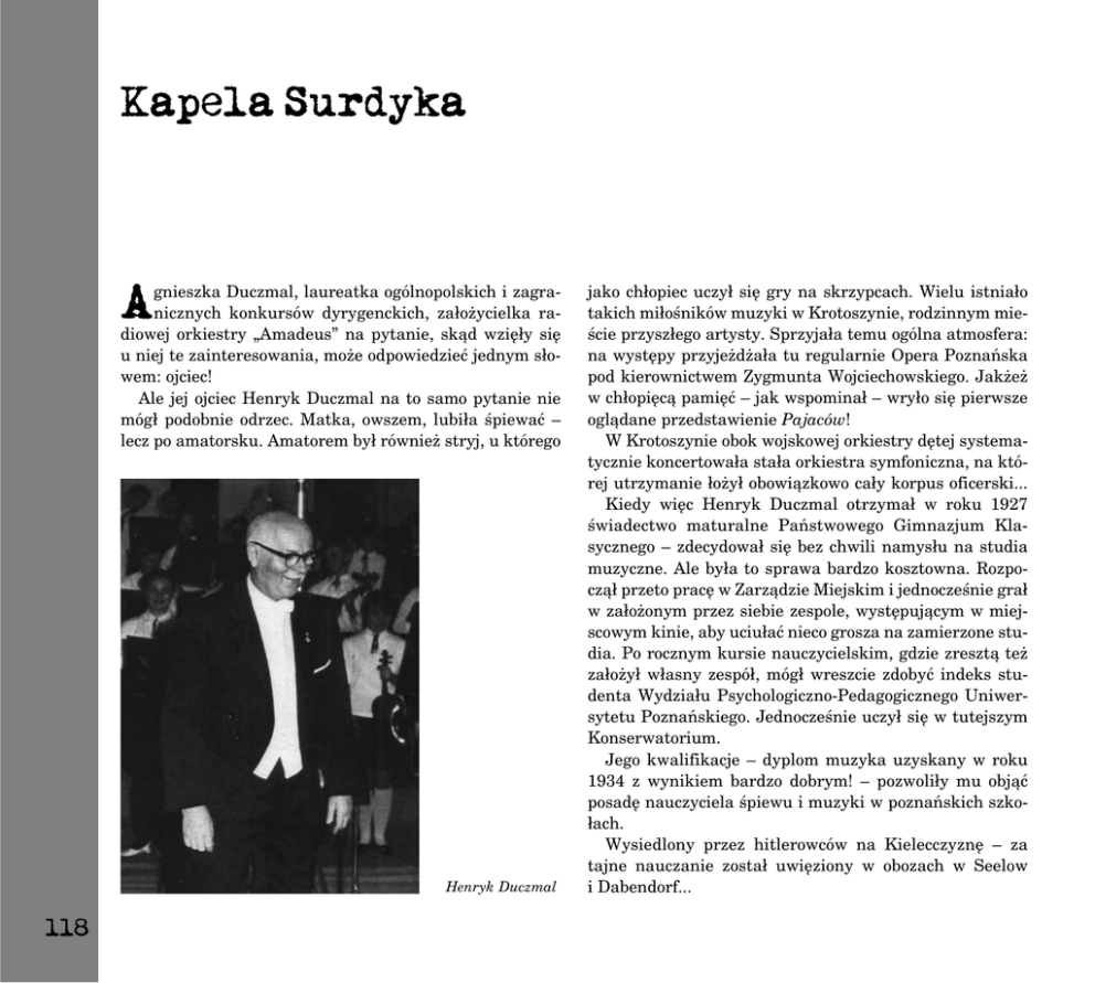 Kapela Surdyka A gnieszka Duczmal, laureatka ogólnopolskich i zagranicznych konkursów dyrygenckich, założycielka radiowej orkiestry „Amadeus” na pytanie, skąd wzięły się u niej te zainteresowania, może odpowiedzieć jednym słowem: ojciec! Ale jej ojciec Henryk Duczmal na to samo pytanie nie mógł podobnie odrzec. Matka, owszem, lubiła śpiewać – lecz po amatorsku. Amatorem był również stryj, u którego Henryk Duczmal 118 jako chłopiec uczył się gry na skrzypcach. Wielu istniało takich miłośników muzyki w Krotoszynie, rodzinnym mieście przyszłego artysty. Sprzyjała temu ogólna atmosfera: na występy przyjeżdżała tu regularnie Opera Poznańska pod kierownictwem Zygmunta Wojciechowskiego. Jakżeż w chłopięcą pamięć – jak wspominał – wryło się pierwsze oglądane przedstawienie Pajaców! W Krotoszynie obok wojskowej orkiestry dętej systematycznie koncertowała stała orkiestra symfoniczna, na której utrzymanie łożył obowiązkowo cały korpus oficerski... Kiedy więc Henryk Duczmal otrzymał w roku 1927 świadectwo maturalne Państwowego Gimnazjum Klasycznego – zdecydował się bez chwili namysłu na studia muzyczne. Ale była to sprawa bardzo kosztowna. Rozpoczął przeto pracę w Zarządzie Miejskim i jednocześnie grał w założonym przez siebie zespole, występującym w miejscowym kinie, aby uciułać nieco grosza na zamierzone studia. Po rocznym kursie nauczycielskim, gdzie zresztą też założył własny zespół, mógł wreszcie zdobyć indeks studenta Wydziału Psychologiczno-Pedagogicznego Uniwersytetu Poznańskiego. Jednocześnie uczył się w tutejszym Konserwatorium. Jego kwalifikacje – dyplom muzyka uzyskany w roku 1934 z wynikiem bardzo dobrym! – pozwoliły mu objąć posadę nauczyciela śpiewu i muzyki w poznańskich szkołach. Wysiedlony przez hitlerowców na Kielecczyznę – za tajne nauczanie został uwięziony w obozach w Seelow i Dabendorf... Dyrektor Opery Poznańskiej – Zdzisław Górzyński i Henryk Duczmal zamieniają się dla żartu swoimi kapeluszami, aby sobie unaocznić, czyja głowa jest większa! Kapela Surdyka Nasza stolikowa znajomość z Kantaka – z Klubu Związku Zawodowego Pracowników Kultury – i ze „Smakosza” zamieniła się w przyjaźń, gdy w czasie jednego z tournée koncertowego Chóru Kurczewskiego po Niemczech odwiedziłem wraz z nim właśnie te miejscowości. On zaś zrobił wraz ze mną wypad do Güstrow w Meklenburgii, gdzie mój ojciec Adam przez pięć i pół roku był więziony w Stalagu II C jako jeniec, polski żołnierz Września 1939... Natychmiast po wyzwoleniu Henryk Duczmal przyjechał do Poznania, lecz nie miał gdzie zamieszkać. Musiał powrócić do rodzinnego Krotoszyna. Jego pobyt w tym mieście – aż do roku 1949 – pozostawił trwałe ślady w kulturze tamtego regionu. Był bowiem nie tylko nauczycielem śpiewu i założycielem kilku zespołów chóralnych i muzycznych – pełnił również funkcję kierownika Referatu Kultury i Sztuki, zanim został dyrektorem stworzonej przez siebie Miejskiej Szkoły Umuzykalniającej, pozostając aż do swojego wyjazdu członkiem Powiatowej Rady Narodowej. Ucząc harmonii i instrumentoznawstwa w Państwowej Szkole Muzycznej w Poznaniu i później także w Szkole Baletowej, przystąpił w roku 1950 do współorganizowania Wielkopolskiej Symfonicznej Orkiestry Objazdowej, zostając jej dyrektorem. Potrafił to stanowisko świetnie godzić z kierowaniem Redakcją Muzyczną Rozgłośni Poznańskiej. Wtedy właśnie założył słynną Kapelę Wojciecha Surdyka: taki sobie upodobał ludowy pseudonim! Nagrał z tą kapelą ponad 250 opracowanych przez siebie melodii wielkopolskich. Weszły na trwałe do skarbnicy tutejszego folkloru. Następne lata, począwszy od pamiętnego roku 1956, wiążą Henryka Duczmala z kilkoma kolejnymi instytucjami Poznania. Kierowano go tam, aby nadał im odpowiednio wysoką rangę artystyczną. Przez dwa lata był dyrektorem „Estrady”, następnie, do roku 1962 kierował Operetką Poznańską, potem objął stanowisko zastępcy dyrektora Opery Poznańskiej, aby wreszcie powrócić do szkolnictwa. Aż do emerytury w roku 1970 – przez sześć lat był dyrektorem Państwowej Szkoły Muzycznej im. H. Wieniawskiego. W tym czasie orkiestra szkolna osiągnęła taki poziom, że zaczęła wyjeżdżać również na zagraniczne występy! Przeglądając dorobek artystyczny tego muzyka, trudno wręcz doliczyć się jego audycji, opracowań chóralnych i instrumentalnych, wykładów oraz podejmowanych inicjatyw. W pewnym sensie obrazują te dokonania – liczne nagrody i odznaczenia: Zasłużony Działacz Kultury, Odznaka Honorowa Miasta Poznania, Krzyż Kawalerski Orderu Odrodzenia Polski, Złota Odznaka Honorowa z Laurem Zjednoczenia Polskich Zespołów Chóralnych i Instrumentalnych. I, rzadkość, medal za wybitną działalność artystyczną, przyznany przez niemieckie miasto Dahme. 119 Nie nazywam się Ryś! D yrektor Bronisław Dąbrowski opowiadał, że w czasie majowych rozmów przedsezonowych z aktorami, z którymi teatry wtedy się rozstają albo ich angażują – z Jeleniej Góry przyjechała w roku 1946 do Teatru Starego w Krakowie para Zofia Rysiówna i Adam Hanuszkiewicz. Najpierw zaprosił do swojego gabinetu aktorkę. Rozmowa się przeciągała. Kiedy wreszcie poprosił czekającego w sekretariacie aktora – ten wszedł poirytowany i na powitanie oznajmił: Adam Hanuszkiewicz jako najmłodszy wtedy w Europie „Hamlet” 140 – Najpierw chciałem powiedzieć, że nie nazywam się Ryś, jestem Adam Hanuszkiewicz! Urodził się we Lwowie w roku 1924. Uczył się od roku 1945 w Szkole Dramatycznej w Rzeszowie, gdzie też grał, zanim wyjechał do Jeleniej Góry i zdał rok później egzamin eksternistyczny w Państwowej Wyższej Szkole Aktorskiej w Łodzi. Dyplom reżyserski uzyskał w Państwowej Wyższej Szkole Teatralnej w Warszawie, gdzie wcześniej w sezonach 1949–52 występo