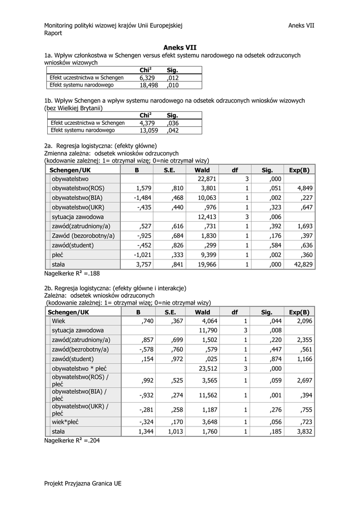 Monitoring polityki wizowej krajów Unii Europejskiej Raport Aneks VII Aneks VII 1a. Wpływ członkostwa w Schengen versus efekt systemu narodowego na odsetek odrzuconych wniosków wizowych Chi2 Sig. Efekt uczestnictwa w Schengen 6,329 ,012 Efekt systemu narodowego 18,498 ,010 1b. Wpływ Schengen a wpływ systemu narodowego na odsetek odrzuconych wniosków wizowych (bez Wielkiej Brytanii) Chi2 Sig. Efekt uczestnictwa w Schengen 4,379 ,036 Efekt systemu narodowego 13,059 ,042 2a. Regresja logistyczna: (efekty główne) Zmienna zależna: odsetek wniosków odrzuconych (kodowanie zależnej: 1= otrzymał wizę; 0=nie otrzymał wizy) Schengen/UK obywatelstwo B S.E. Wald 22,871 df 3 Sig. ,000 Exp(B) obywatelstwo(ROS) 1,579 ,810 3,801 1 ,051 4,849 obywatelstwo(BIA) -1,484 ,468 10,063 1 ,002 ,227 obywatelstwo(UKR) -,435 ,440 ,976 1 ,323 ,647 12,413 3 ,006 sytuacja zawodowa zawód(zatrudniony/a) ,527 ,616 ,731 1 ,392 1,693 Zawód (bezorobotny/a) -,925 ,684 1,830 1 ,176 ,397 zawód(student) -,452 ,826 ,299 1 ,584 ,636 -1,021 ,333 9,399 1 ,002 ,360 3,757 ,841 19,966 1 ,000 42,829 1 Sig. ,044 Exp(B) 2,096 11,790 3 ,008 płeć stała Nagelkerke R2 =.188 2b. Regresja logistyczna: (efekty główne i interakcje) Zależna: odsetek wniosków odrzuconych (kodowanie zależnej: 1= otrzymał wizę; 0=nie otrzymał wizy) Schengen/UK Wiek B ,740 S.E. ,367 sytuacja zawodowa Wald 4,064 df zawód(zatrudniony/a) ,857 ,699 1,502 1 ,220 2,355 zawód(bezrobotny/a) -,578 ,760 ,579 1 ,447 ,561 ,154 ,972 ,025 1 ,874 1,166 23,512 3 ,000 zawód(student) obywatelstwo * płeć obywatelstwo(ROS) / płeć obywatelstwo(BIA) / płeć obywatelstwo(UKR) / płeć wiek*płeć stała Nagelkerke R2 =.204 Projekt Przyjazna Granica UE ,992 ,525 3,565 1 ,059 2,697 -,932 ,274 11,562 1 ,001 ,394 -,281 ,258 1,187 1 ,276 ,755 -,324 ,170 3,648 1 ,056 ,723 1,344 1,013 1,760 1 ,185 3,832