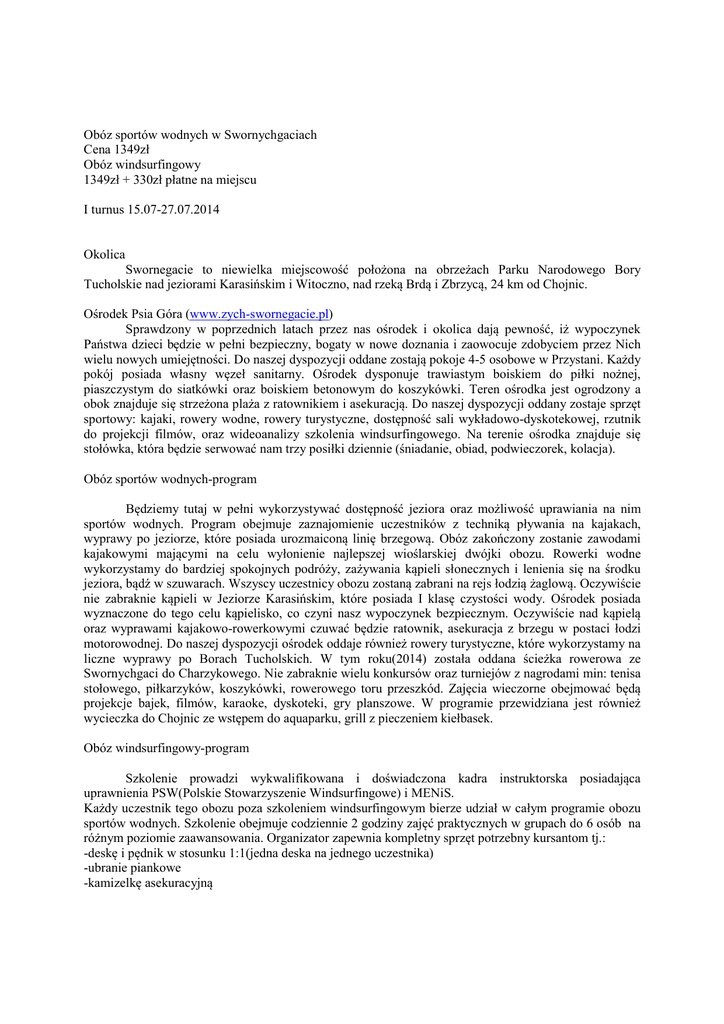 Obóz sportów wodnych w Swornychgaciach Cena 1349zł Obóz windsurfingowy 1349zł + 330zł płatne na miejscu I turnus 15.07-27.07.2014 Okolica Swornegacie to niewielka miejscowość położona na obrzeżach Parku Narodowego Bory Tucholskie nad jeziorami Karasińskim i Witoczno, nad rzeką Brdą i Zbrzycą, 24 km od Chojnic. Ośrodek Psia Góra (www.zych-swornegacie.pl) Sprawdzony w poprzednich latach przez nas ośrodek i okolica dają pewność, iż wypoczynek Państwa dzieci będzie w pełni bezpieczny, bogaty w nowe doznania i zaowocuje zdobyciem przez Nich wielu nowych umiejętności. Do naszej dyspozycji oddane zostają pokoje 4-5 osobowe w Przystani. Każdy pokój posiada własny węzeł sanitarny. Ośrodek dysponuje trawiastym boiskiem do piłki nożnej, piaszczystym do siatkówki oraz boiskiem betonowym do koszykówki. Teren ośrodka jest ogrodzony a obok znajduje się strzeżona plaża z ratownikiem i asekuracją. Do naszej dyspozycji oddany zostaje sprzęt sportowy: kajaki, rowery wodne, rowery turystyczne, dostępność sali wykładowo-dyskotekowej, rzutnik do projekcji filmów, oraz wideoanalizy szkolenia windsurfingowego. Na terenie ośrodka znajduje się stołówka, która będzie serwować nam trzy posiłki dziennie (śniadanie, obiad, podwieczorek, kolacja). Obóz sportów wodnych-program Będziemy tutaj w pełni wykorzystywać dostępność jeziora oraz możliwość uprawiania na nim sportów wodnych. Program obejmuje zaznajomienie uczestników z techniką pływania na kajakach, wyprawy po jeziorze, które posiada urozmaiconą linię brzegową. Obóz zakończony zostanie zawodami kajakowymi mającymi na celu wyłonienie najlepszej wioślarskiej dwójki obozu. Rowerki wodne wykorzystamy do bardziej spokojnych podróży, zażywania kąpieli słonecznych i lenienia się na środku jeziora, bądź w szuwarach. Wszyscy uczestnicy obozu zostaną zabrani na rejs łodzią żaglową. Oczywiście nie zabraknie kąpieli w Jeziorze Karasińskim, które posiada I klasę czystości wody. Ośrodek posiada wyznaczone do tego celu kąpielisko, co czyni nasz wypoczynek bezpiecznym. Oczywiście nad kąpielą oraz wyprawami kajakowo-rowerkowymi czuwać będzie ratownik, asekuracja z brzegu w postaci łodzi motorowodnej. Do naszej dyspozycji ośrodek oddaje również rowery turystyczne, które wykorzystamy na liczne wyprawy po Borach Tucholskich. W tym roku(2014) została oddana ścieżka rowerowa ze Swornychgaci do Charzykowego. Nie zabraknie wielu konkursów oraz turniejów z nagrodami min: tenisa stołowego, piłkarzyków, koszykówki, rowerowego toru przeszkód. Zajęcia wieczorne obejmować będą projekcje bajek, filmów, karaoke, dyskoteki, gry planszowe. W programie przewidziana jest również wycieczka do Chojnic ze wstępem do aquaparku, grill z pieczeniem kiełbasek. Obóz windsurfingowy-program Szkolenie prowadzi wykwalifikowana i doświadczona kadra instruktorska posiadająca uprawnienia PSW(Polskie Stowarzyszenie Windsurfingowe) i MENiS. Każdy uczestnik tego obozu poza szkoleniem windsurfingowym bierze udział w całym programie obozu sportów wodnych. Szkolenie obejmuje codziennie 2 godziny zajęć praktycznych w grupach do 6 osób na różnym poziomie zaawansowania. Organizator zapewnia kompletny sprzęt potrzebny kursantom tj.: -deskę i pędnik w stosunku 1:1(jedna deska na jednego uczestnika) -ubranie piankowe -kamizelkę asekuracyjną Wszystko odpowiednio dobrane do warunków fizycznych uczestnika. Program obejmuje również zajęcia teoretyczne: -wideoanalizę -codzienne wykłady -projekcje najnowszych ekstremalnych filmów windsurfingowych Celem szkolenia jest zdobycie techniki swobodnego żeglowania, czyli: -umiejętność ostrzenia, odpadania, -robienia zwrotów przez wiatr i z wiatrem -pływanie wszystkimi kursami względem wiatru a dla zaawansowanych: -pływanie w trapezie -elementy Freestyle Przedostatniego dnia kursu przewidziana jest wycieczka windsurfingowa, a w ostatnim dniu regaty windsurfingowe z pucharami i ciekawymi nagrodami. Warunkiem wzięcia udziału w kursie windsurfingowym jest umiejętność swobodnego pływania. Istnieje możliwość zdobycia klas windsurfingowych PSW. Dokładne informacje podane zostaną na spotkaniu organizacyjnym. Istnieje możliwość uczestniczenia w samym szkoleniu windsurfingowym (wówczas cena 400zł), w celu uzyskania więcej informacji prosimy o kontakt. Jeśli uczestnik obozu będzie brał udział w szkoleniu windsurfingowym w tytule przelewu proszę dopisać „obóz windsurfingowy”. Przejazd Wyjazd z Tychów autokarem spod Lodowiska 15.07 w godzinach wieczornych, powrót 27.07 w godzinach wieczornych. Dokładne godziny zostaną podane na stronie internetowej tydzień przed wyjazdem. Cena zawiera: wyżej wymienione świadczenia oraz: -ubezpieczenie NNW -opiekę lekarską na miejscu(lekarz na telefon) Warunki uczestnictwa: Warunkiem uczestnictwa jest wpłacenie zaliczki w wysokości 400zł do dnia 31.05, oraz pozostałej części kwoty do 15.06. Dane do przelewu : Usługi turystyczno-przewozowe ANDATUR B. Krzemień, St. Ślusarczyk 32-332 Bukowno, ul. Sławkowska 61 NIP: 6371007502 REGON: 272771904 ING Bank Śląski: 52 1050 1618 1000 0023 2767 7692 w tytule proszę podać imię i nazwisko uczestnika, PESEL telefon i mail kontaktowy do rodziców, datę i rodzaj obozu. Karta uczestnika obozu do ściągnięcia ze strony: http://fununiversity.pl/new/pliki.html Organizatorem imprezy jest ANDATUR Więcej info i kontakt: [email protected], [email protected], [email protected]
