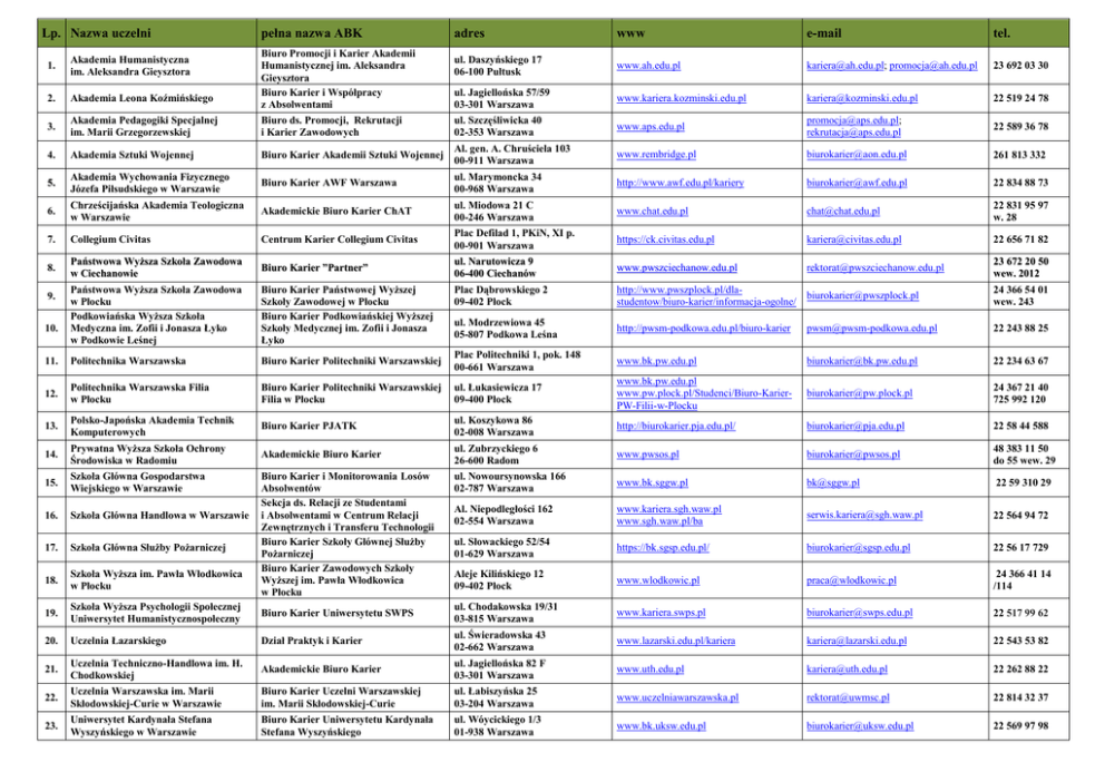 Lp. Nazwa uczelni pełna nazwa ABK adres www e-mail tel. Biuro Promocji i Karier Akademii Humanistycznej im. Aleksandra Gieysztora Biuro Karier i Współpracy z Absolwentami ul. Daszyńskiego 17 06-100 Pułtusk www.ah.edu.pl [email protected]; [email protected] 23 692 03 30 ul. Jagiellońska 57/59 03-301 Warszawa www.kariera.kozminski.edu.pl [email protected] 22 519 24 78 1. Akademia Humanistyczna im. Aleksandra Gieysztora 2. Akademia Leona Koźmińskiego 3. Akademia Pedagogiki Specjalnej im. Marii Grzegorzewskiej Biuro ds. Promocji, Rekrutacji i Karier Zawodowych ul. Szczęśliwicka 40 02-353 Warszawa www.aps.edu.pl [email protected]; [email protected] 22 589 36 78 4. Akademia Sztuki Wojennej Biuro Karier Akademii Sztuki Wojennej Al. gen. A. Chruściela 103 00-911 Warszawa www.rembridge.pl [email protected] 261 813 332 5. Akademia Wychowania Fizycznego Józefa Piłsudskiego w Warszawie Biuro Karier AWF Warszawa ul. Marymoncka 34 00-968 Warszawa http://www.awf.edu.pl/kariery [email protected] 22 834 88 73 6. Chrześcijańska Akademia Teologiczna w Warszawie Akademickie Biuro Karier ChAT ul. Miodowa 21 C 00-246 Warszawa www.chat.edu.pl [email protected] 22 831 95 97 w. 28 7. Collegium Civitas Centrum Karier Collegium Civitas Plac Defilad 1, PKiN, XI p. 00-901 Warszawa https://ck.civitas.edu.pl [email protected] 22 656 71 82 www.pwszciechanow.edu.pl [email protected] 8. 9. 10. Państwowa Wyższa Szkoła Zawodowa w Ciechanowie Państwowa Wyższa Szkoła Zawodowa w Płocku Podkowiańska Wyższa Szkoła Medyczna im. Zofii i Jonasza Łyko w Podkowie Leśnej Biuro Karier ”Partner” Biuro Karier Państwowej Wyższej Szkoły Zawodowej w Płocku Biuro Karier Podkowiańskiej Wyższej Szkoły Medycznej im. Zofii i Jonasza Łyko ul. Narutowicza 9 06-400 Ciechanów Plac Dąbrowskiego 2 09-402 Płock http://www.pwszplock.pl/[email protected] studentow/biuro-karier/informacja-ogolne/ 23 672 20 50 wew. 2012 24 366 54 01 wew. 243 ul. Modrzewiowa 45 05-807 Podkowa Leśna http://pwsm-podkowa.edu.pl/biuro-karier [email protected] 22 243 88 25 11. Politechnika Warszawska Biuro Karier Politechniki Warszawskiej Plac Politechniki 1, pok. 148 00-661 Warszawa www.bk.pw.edu.pl [email protected] 22 234 63 67 12. Politechnika Warszawska Filia w Płocku Biuro Karier Politechniki Warszawskiej Filia w Płocku ul. Łukasiewicza 17 09-400 Płock www.bk.pw.edu.pl www.pw.plock.pl/Studenci/Biuro-KarierPW-Filii-w-Plocku [email protected] 24 367 21 40 725 992 120 13. Polsko-Japońska Akademia Technik Komputerowych Biuro Karier PJATK ul. Koszykowa 86 02-008 Warszawa http://biurokarier.pja.edu.pl/ [email protected] 22 58 44 588 14. Prywatna Wyższa Szkoła Ochrony Środowiska w Radomiu Akademickie Biuro Karier ul. Zubrzyckiego 6 26-600 Radom www.pwsos.pl [email protected] 48 383 11 50 do 55 wew. 29 15. Szkoła Główna Gospodarstwa Wiejskiego w Warszawie ul. Nowoursynowska 166 02-787 Warszawa www.bk.sggw.pl [email protected] 22 59 310 29 16. Szkoła Główna Handlowa w Warszawie Al. Niepodległości 162 02-554 Warszawa www.kariera.sgh.waw.pl www.sgh.waw.pl/ba [email protected] 22 564 94 72 17. Szkoła Główna Służby Pożarniczej ul. Słowackiego 52/54 01-629 Warszawa https://bk.sgsp.edu.pl/ [email protected] 22 56 17 729 18. Szkoła Wyższa im. Pawła Włodkowica w Płocku Aleje Kilińskiego 12 09-402 Płock www.wlodkowic.pl [email protected] 24 366 41 14 /114 19. Szkoła Wyższa Psychologii Społecznej Uniwersytet Humanistycznospołeczny Biuro Karier Uniwersytetu SWPS ul. Chodakowska 19/31 03-815 Warszawa www.kariera.swps.pl [email protected] 22 517 99 62 20. Uczelnia Łazarskiego Dział Praktyk i Karier ul. Świeradowska 43 02-662 Warszawa www.lazarski.edu.pl/kariera [email protected] 22 543 53 82 21. Uczelnia Techniczno-Handlowa im. H. Chodkowskiej Akademickie Biuro Karier ul. Jagiellońska 82 F 03-301 Warszawa www.uth.edu.pl [email protected] 22 262 88 22 22. Uczelnia Warszawska im. Marii Skłodowskiej-Curie w Warszawie Biuro Karier Uczelni Warszawskiej im. Marii Skłodowskiej-Curie ul. Łabiszyńska 25 03-204 Warszawa www.uczelniawarszawska.pl [email protected] 22 814 32 37 23. Uniwersytet Kardynała Stefana Wyszyńskiego w Warszawie Biuro Karier Uniwersytetu Kardynała Stefana Wyszyńskiego ul. Wóycickiego 1/3 01-938 Warszawa www.bk.uksw.edu.pl [email protected] 22 569 97 98 Biuro Karier i Monitorowania Losów Absolwentów Sekcja ds. Relacji ze Studentami i Absolwentami w Centrum Relacji Zewnętrznych i Transferu Technologii Biuro Karier Szkoły Głównej Służby Pożarniczej Biuro Karier Zawodowych Szkoły Wyższej im. Pawła Włodkowica w Płocku Lp. Nazwa uczelni pełna nazwa ABK adres www e-mail tel. Centrum Szkoleń i Doradztwa Zawodowego UKSW Biuro Karier Uniwersytetu Przyrodniczo-Humanistycznego w Siedlcach Biuro Zawodowej Promocji Studentów i Absolwentów UW, sekcja: Biuro Karier ul. Wóycickiego 1/3 01-938 Warszawa www.szkolenia.uksw.edu.pl [email protected] [email protected] 22 569 97 97 ul. 3 Maja 49 pok. 18 i 19 08-110 Siedlce www.biurokarier.uph.edu.pl [email protected] 25 643 11 90 ul. Krakowskie Przedmieście 32 00-927 Warszawa www.biurokarier.uw.edu.pl [email protected] 22 55 20 763 ul. Siedmiogrodzka 3A 01-204 Warszawa www.wsz-sw.edu.pl [email protected] 795 990 822 ul. Księcia Trojdena 2a 02-109 Warszawa www.biurokarier.wum.edu.pl [email protected] 22 57 20 909 ul. gen. Sylwestra Kaliskiego 2 00-908 Warszawa http://kariera.wat.edu.pl/ [email protected] 261 837 381 24. Uniwersytet Kardynała Stefana Wyszyńskiego w Warszawie 25. Uniwersytet PrzyrodniczoHumanistyczny w Siedlcach 26. Uniwersytet Warszawski 27. Warszawska Szkoła Zarządzania Szkoła Wyższa 28. Warszawski Uniwersytet Medyczny 29. Wojskowa Akademia Techniczna im. Jarosława Dąbrowskiego 30. Wszechnica Polska Szkoła Wyższa w Warszawie Biuro Karier Wszechnicy Polskiej Plac Defilad 1, VII piętro, p. 811 00-901 Warszawa www.wszechnicapolska.edu.pl [email protected] 22 656 61 78 31. Wyższa Inżynierska Szkoła Bezpieczeństwa i Orga