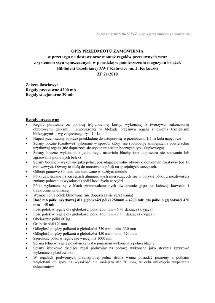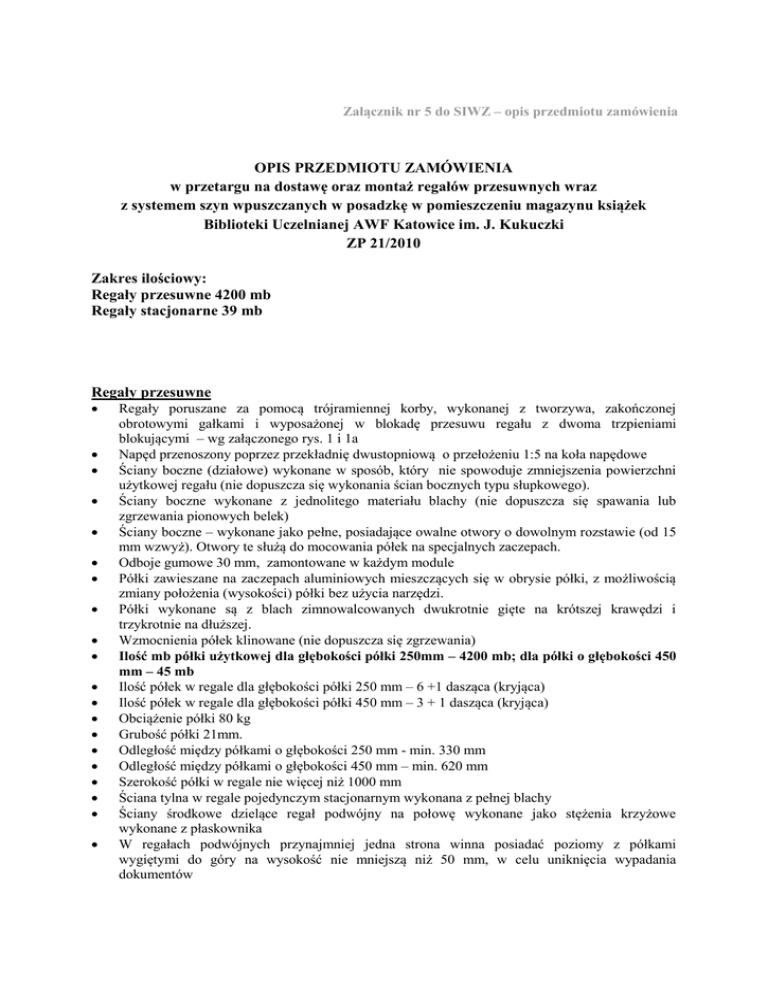 Załącznik nr 5 do SIWZ – opis przedmiotu zamówienia OPIS PRZEDMIOTU ZAMÓWIENIA w przetargu na dostawę oraz montaż regałów przesuwnych wraz z systemem szyn wpuszczanych w posadzkę w pomieszczeniu magazynu książek Biblioteki Uczelnianej AWF Katowice im. J. Kukuczki ZP 21/2010 Zakres ilościowy: Regały przesuwne 4200 mb Regały stacjonarne 39 mb Regały przesuwne Regały poruszane za pomocą trójramiennej korby, wykonanej z tworzywa, zakończonej obrotowymi gałkami i wyposażonej w blokadę przesuwu regału z dwoma trzpieniami blokującymi – wg załączonego rys. 1 i 1a Napęd przenoszony poprzez przekładnię dwustopniową o przełożeniu 1:5 na koła napędowe Ściany boczne (działowe) wykonane w sposób, który nie spowoduje zmniejszenia powierzchni użytkowej regału (nie dopuszcza się wykonania ścian bocznych typu słupkowego). Ściany boczne wykonane z jednolitego materiału blachy (nie dopuszcza się spawania lub zgrzewania pionowych belek) Ściany boczne – wykonane jako pełne, posiadające owalne otwory o dowolnym rozstawie (od 15 mm wzwyż). Otwory te służą do mocowania półek na specjalnych zaczepach. Odboje gumowe 30 mm, zamontowane w każdym module Półki zawieszane na zaczepach aluminiowych mieszczących się w obrysie półki, z możliwością zmiany położenia (wysokości) półki bez użycia narzędzi. Półki wykonane są z blach zimnowalcowanych dwukrotnie gięte na krótszej krawędzi i trzykrotnie na dłuższej. Wzmocnienia półek klinowane (nie dopuszcza się zgrzewania) Ilość mb półki użytkowej dla głębokości półki 250mm – 4200 mb; dla półki o głębokości 450 mm – 45 mb Ilość półek w regale dla głębokości półki 250 mm – 6 +1 dasząca (kryjąca) Ilość półek w regale dla głębokości półki 450 mm – 3 + 1 dasząca (kryjąca) Obciążenie półki 80 kg Grubość półki 21mm. Odległość między półkami o głębokości 250 mm - min. 330 mm Odległość między półkami o głębokości 450 mm – min. 620 mm Szerokość półki w regale nie więcej niż 1000 mm Ściana tylna w regale pojedynczym stacjonarnym wykonana z pełnej blachy Ściany środkowe dzielące regał podwójny na połowę wykonane jako stężenia krzyżowe wykonane z płaskownika W regałach podwójnych przynajmniej jedna strona winna posiadać poziomy z półkami wygiętymi do góry na wysokość nie mniejszą niż 50 mm, w celu uniknięcia wypadania dokumentów Panel osłonowy (czołowy) na całej szerokości i wysokości regału o ściance zamkniętej pełnej oraz krawędziach trapezowych Na każdym panelu osłonowym zamontowana listwa opisowa Regały malowane lakierami epoksydowymi lub mieszanką poliestrowo-epoksydową po wcześniejszym procesie fosforanowania powierzchni malowanej na kolor popielaty (RAL 7035) Panel osłonowy (czołowy) w kolorze określonym w trakcie realizacji zamówienia Podstawa regałów – profil gięty z blachy o grubości 2,0 mm, wysokość podstawy max 105 mm. Koła żeliwne o średnicy 105 mm. Koła żeliwne na łożyskach kulowych zamkniętych Montaż elementów podstawy za pomocą wyprofilowanych elementów poprzecznych, zapewniających odpowiednią sztywność podstawy w miejscu połączenia i uniemożliwiających przesuwanie się elementów względem siebie Tor jezdny (szyna) w 100% wykonana ze stopu aluminium, wpuszczana w podłoże, wysokość toru 16-22 mm. Wózki składane z części (nie dopuszcza się spawanych wózków w całość, ze względu na transport) w miejscu montażu Ciągi komunikacyjne i przejścia miedzy regałami min.1000 mm Co najmniej trzy przejścia między blokami regałów Po 8 regałach przesuwnych wstawić regał stacjonarny Przekładki (podpórki, zastawki) do książek wykonane z mocnej blachy stalowej, lakierowane proszkowo w kolorze popielatym (RAL 7035), odporne na zarysowania, z gumowymi podkładkami o wys. 140 mm w ilości 700 szt. oraz wys. 290 mm w ilości 300 szt. Regały stacjonarne metalowe Wysokość regału nie mniej niż 1900 mm Wysokość między półkami 620 mm Głębokość półki 450 mm Grubość półki 21 mm Szerokość półki w regale nie więcej niż 1000 mm Obciążenie półki 80 kg Ilość półek 3 + 1 dasząca (kryjąca) Ściany boczne (działowe) wykonane w sposób, który nie spowoduje zmniejszenia powierzchni użytkowej regału (nie dopuszcza się wykonania ścian bocznych typu słupkowego). Ściany boczne wykonane z jednolitego materiału blachy (nie dopuszcza się spawania lub zgrzewania pionowych belek) Ściany boczne – wykonane jako pełne, posiadające owalne otwory o dowolnym rozstawie (od 15 mm wzwyż). Otwory te służą do mocowania półek na specjalnych zaczepach Półki zawieszane na zaczepach aluminiowych mieszczących się w obrysie półki, z możliwością zmiany położenia (wysokości) półki bez użycia narzędzi. Półki wykonane są z blach zimnowalcowanych dwukrotnie gięte na krótszej krawędzi i trzykrotnie na dłuższej. Wzmocnienia półek klinowane (nie dopuszcza się zgrzewania) Panel osłonowy (czołowy) na całej szerokości i wysokości regału o ściance zamkniętej pełnej oraz krawędziach trapezowych Rodzaje regałów: regał pojedynczy - długość 5000 mm, ściana tylna wykonana z pełnej blachy; regał podwójny – długość 4000 mm, ściany środkowe dzielące regał podwójny na połowę wykonane jako stężenia krzyżowe wykonane z płaskownika Regały malowane lakierami epoksydowymi lub mieszanką poliestrowo-epoksydową po wcześniejszym procesie fosforanowania powierzchni malowanej na kolor popielaty (RAL 7035) Panel osłonowy (czołowy) w kolorze określonym w trakcie realizacji zamówienia Rysunek nr 1 Rysunek 1a