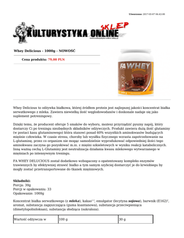 Utworzono: 2017-03-07 04:42:08 Whey Delicious - 1000g - NOWOŚĆ Cena produktu: 79,00 PLN Whey Delicious to odżywka białkowa, której źródłem protein jest najlepszej jakości koncentrat białka serwatkowego z mleka. Zawiera niewielką ilość węglodowodanów i doskonale nadaje się jako suplement potreningowy. Dzięki temu, że producent oferuje 5 smaków do wyboru, możesz przyrządzić pyszny napój, który dostarczy Ci po treningu niezbędnych składników odżywczych. Produkt zawiera dużą ilość glutaminy (w postaci kasu glutaminowego) która stanowi ponad 60% wszystkich aminokwasów budujących mięśnie człowieka. W czasie stresu, choroby lub wysiłku fizycznego wzrasta zapotrzebowanie na L-glutaminę, przez co organizm nie mogąc samodzielnie wyprodukować odpowiedniej ilości tego aminokwasu zaczyna go pozyskiwać m.in. z mięśni szkieletowych w wyniku reakcji katabolicznych. Inną ważną cechą L-Glutaminy jest neutralizacja działania kwasu mlekowego wytwarzanego w mięśniach po intensywnym treningu. FA WHEY DELUCIOUS został dodatkowo wzbogacony o opatentowany kompleks enzymów trawiennych by efektywniej strawić białko a tym samym szybciej dostarczyć je do krwiobiegu by mogły zostać przetransportowane do tkanek mięśniowych. Składniki: Porcja: 30g Porcji w opakowaniu: 33 Opakowanie: 1000g Koncentrat białka serwatkowego (z mleka), kakao1,3, emulgator (lecytyna sojowa), barwnik (E162)2, aromat, substancja zagęszczająca (guma ksantanowa), substancja przeciwpieniąca (dimetylopolisiloksan), substancja słodząca (sukraloza). Wartość odżywcza w 100 g 30 g Wartość energetyczna 1567 kJ / 370 kcal1, 1642 kJ / 387 kcal2,4,5, 1606 kJ / 380 kcal3 468 kJ / 111 kcal1, 494 kJ / 117 kcal2,4,5, 481 kJ / 114 kcal3 Tłuszcz 4,1 g1, 3,6 g2,4,5, 4,7 g3 1,2 g1, 1,1 g2,4,5, 1,4 g3 w tym kwasy tłuszczowe nasycone 0,4 g1, 0,6 g2,3,4,5 0,1 g1, 0,2 g2,3,4,5 Węglowodany 13,8 g1, 17,0 g2,4,5, 13,4 g3 4,1 g1, 5,1 g2,4,5, 4,0 g3 w tym cukry 12,2 g1, 15,3 g2,4,5, 11,5 g3 3,7 g1, 4,6 g2,4,5, 3,5 g3 Błonnik 0,9 g1, 0,3 g2,4,5, 1,8 g3 0,3 g1, 0,1 g2,4,5, 0,5 g3 Białko 69 g1, 71,6 g2,4,5, 70 g3 20,7 g1, 21,5 g2,4,5, 21 g3 Sól 0,5 g1,3, 0,2 g2,4,5 0,2 g1,3, 0,1 g2,4,5 Smaki: Masło orzechowe1, Truskawkowy2, Czekoladowy3, Ciastka z kremem4, Waniliowy5 Sposób użycia: Zmieszać 1 miarkę proszku (30 g) z 200 ml wody, mleka lub soku. Spożywać przed treningiem oraz bezpośrednio po treningu. Uwagi: Nie stosować w przypadku uczulenia na którykolwiek ze składników produktu. Produkt nie może być stosowany przez kobiety w ciąży i matki karmiące. Zalecany jest zrównoważony sposób żywienia i zdrowy tryb życia. Przechowywać w suchym i chłodnym miejscu niedostępnym dla dzieci. Chronić przed bezpośrednim działaniem promieni słonecznych. Adres: http://www.ko.sklep.pl/ Telefon: kom. 782 010 880 Email: [email protected]