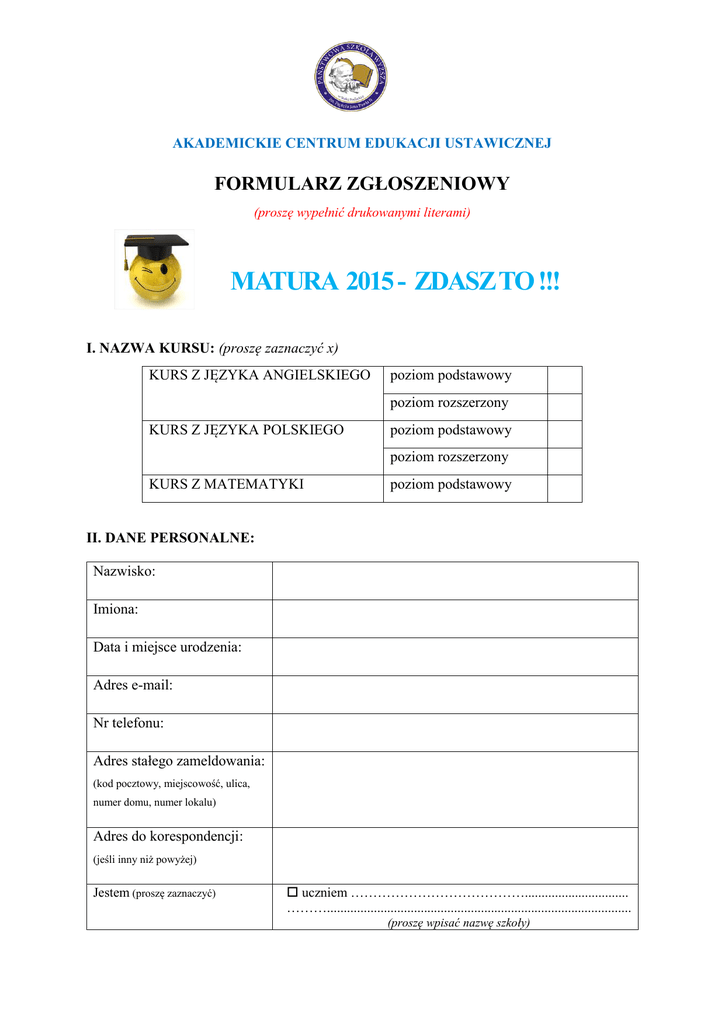 AKADEMICKIE CENTRUM EDUKACJI USTAWICZNEJ FORMULARZ ZGŁOSZENIOWY (proszę wypełnić drukowanymi literami) MATURA 2015 - ZDASZ TO !!! I. NAZWA KURSU: (proszę zaznaczyć x) KURS Z JĘZYKA ANGIELSKIEGO poziom podstawowy poziom rozszerzony KURS Z JĘZYKA POLSKIEGO poziom podstawowy poziom rozszerzony KURS Z MATEMATYKI poziom podstawowy II. DANE PERSONALNE: Nazwisko: Imiona: Data i miejsce urodzenia: Adres e-mail: Nr telefonu: Adres stałego zameldowania: (kod pocztowy, miejscowość, ulica, numer domu, numer lokalu) Adres do korespondencji: (jeśli inny niż powyżej) Jestem (proszę zaznaczyć) uczniem …………………………………............................... ………........................................................................................... (proszę wpisać nazwę szkoły) III. Do formularza zgłoszeniowego proszę dołączyć dowód wpłaty za kurs: Wpłaty za kurs należy dokonać na następujący numer konta: Bank Zachodni WBK o/Biała Podlaska 45 1500 1331 1213 3001 7949 0000 z dopiskiem nazwy kursu. Błędy danych: Przyjmuję do wiadomości, że Państwowa Szkoła Wyższa im. Papieża Jana Pawła II w Białej Podlaskiej nie ponosi odpowiedzialności za podanie przeze mnie błędnych danych. Przetwarzanie danych: Wyrażam zgodę na przetwarzanie moich danych osobowych przez Państwową Szkołę Wyższą im. Papieża Jana Pawła II w Białej Podlaskiej na potrzeby organizacji kursu. …………………………………… data i podpis kandydata W przypadku nieuruchomienia kursu proszę o zwrot wpłaconej przeze mnie wpłaty w wysokości ………………. (słownie ……………………………….) w formie przelewu bankowego na konto Właściciel Nazwa bankowe: konta: banku, ………………………………………………………………… ……………………………………………………………………………….. oddział: …………………………………………………………………………. Numer rachunku bankowego: ………………………………………………………………………...….. …………………………………… data i podpis kandydata