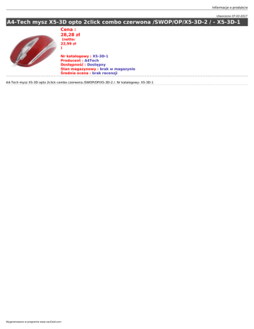 Informacje o produkcie Utworzono 07-03-2017 A4-Tech mysz X5-3D opto 2click combo czerwona /SWOP/OP/X5-3D-2 / - X5-3D-1 Cena : 28,28 zł (netto: 22,99 zł ) Nr katalogowy : X5-3D-1 Producent : A4Tech Dostępność : Dostępny Stan magazynowy : brak w magazynie Średnia ocena : brak recenzji A4-Tech mysz X5-3D opto 2click combo czerwona /SWOP/OP/X5-3D-2 /. Nr katalogowy: X5-3D-1 Wygenerowano w programie www.oscGold.com