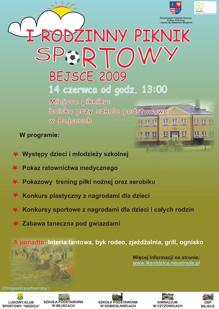 Œwiêtokrzyski Program Rozwoju Kultury Fizycznej i Sportu Na Obszarach Wiejskich W programie: Wystêpy dzieci i m³odzie¿y szkolnej Pokaz ratownictwa medycznego Pokazowy trening pi³ki no¿nej oraz aerobiku Konkurs plastyczny z nagrodami dla dzieci Konkursy sportowe z nagrodami dla dzieci i ca³ych rodzin Zabawa taneczna pod gwiazdami A ponadto: loteria fantowa, byk rodeo, zje¿d¿alnia, grill, ognisko Wiêcej informacji na stronie: www.lksnidzica.neostrada.pl Organizatorzy: LUDOWY KLUB SPORTOWY “NIDZICA” SZKO£A PODSTAWOWA W BEJSCACH SZKO£A PODSTAWOWA W DOBIES£AWICACH GIMNAZJUM W CZY¯OWICACH OSP BEJSCE