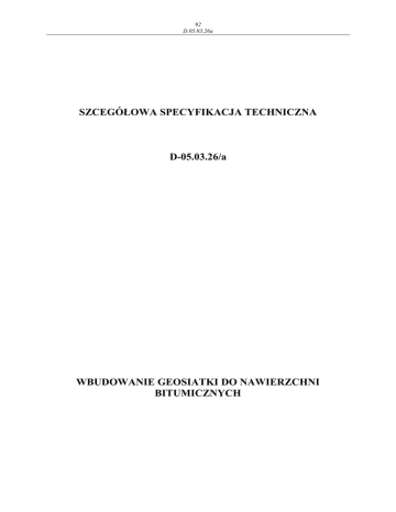 92 D.05.03.26a SZCEGÓŁOWA SPECYFIKACJA TECHNICZNA D-05.03.26/a WBUDOWANIE GEOSIATKI DO NAWIERZCHNI BITUMICZNYCH 93 D.05.03.26a 1. WSTĘP 1.1. Przedmiot ST Przedmiotem niniejszej specyfikacji technicznej są wymagania dotyczące wykonania i odbioru robót związanych z wykonaniem zabezpieczenia geosiatką nawierzchni asfaltowych przed spękaniami odbitymi w ramach remontu nawierzchni asfaltowej ulic Dworcowej i Zielonej w m. Owińska (na odcinku od ul. Kolejowej do ul. Ks. A. Piotrowskiego). 1.2. Zakres stosowania ST Specyfikacja Techniczna jest stosowana jako dokument realizacji robót wymienionych w punkcie 1.1. przetargowy i kontraktowy przy zlecaniu i 1.3. Zakres robót objętych ST Ustalenia zawarte w niniejszej specyfikacji dotyczą zasad prowadzenia robót związanych z wbudowanie geosiatki do nawierzchni bitumicznych i obejmują: − ułoŜenie geosiatki pod warstwą ścieralną - siatka powlekana bitumem. 1.4. Określenia podstawowe 1.4.1. Kompozyt – powinien być wykonany z poliestru i jednostronnie zespolony z polipropylenową włókniną zapewniającą dokładne przylgnięcie kompozytu do nawierzchni. Włókna i sploty kompozytu powinny być nasączone warstwą bitumu nadającą mu barwę czarną. 1.4.2. Pozostałe określenia podstawowe są zgodne z odpowiednimi polskimi normami i z definicjami podanymi w ST D-M-00.00.00 „Wymagania ogólne” pkt 1.4. 1.5. Ogólne wymagania dotyczące robót Ogólne wymagania dotyczące robót podano w ST D-M-00.00.00 „Wymagania ogólne” pkt 1.5. 2. MATERIAŁY 2.1. Ogólne wymagania dotyczące materiałów Ogólne wymagania dotyczące materiałów, ich pozyskiwania i składowania, podano w ST D-M-00.00.00 „Wymagania ogólne” pkt 2. 2.2. Kompozyt NaleŜy zastosować kompozyt wykonany w formie siatki z pęków włókien poliestrowych zespolonych w płaskie, podłuŜne sploty, przeplatane w węzłach siatki, połączonej z polipropylenową włókniną zapewniającą dokładne przylgnięcie kompozytu do nawierzchni. Włókna i sploty kompozytu powinny być nasączone warstwą bitumu nadającą mu barwę czarną. Nie dopuszcza się geosyntetyków wykonanych z włókien szklanych, węglowych oraz bazaltowych (ze względu na ich kruchość pod działaniem mrozu oraz brak odporności na działanie sił skierowanych prostopadle do płaszczyzny konstrukcji nawierzchni drogowej). Parametry techniczne kompozytu: Właściwości Wytrzymałość wyrobu na rozciąganie: - wzdłuŜ pasma wyrobu: - wszerz pasma wyrobu: WydłuŜenie przy zerwaniu: - wzdłuŜ pasma wyrobu: - wszerz pasma wyrobu: Nominalna wielkość oczek: Temperatura topnienia: Temperatura stosowania: Skurcz w temperaturze +190°C po 15 minutach: Surowiec: - siatka - włóknina Powłoka: Jednostka Wartość min. kN/m 50 50 max % ok. ok. max mm °C °C % 12,0 12,0 40/40 +256 +190 1,0 poliester polipropylen bitumiczna – nadająca siatce barwę czarną 94 D.05.03.26a Parametry zaopatrzeniowe: Wymiary standardowe Masa powierzchniowa: szerokość – korzystnie: długość – korzystnie: Jednostka g/m2 m mb Wartość 360 1,0; 2,0; 3,0; 4,0; 5,0 150,00 Informacje uzupełniające dla wykonawców: Wykonawca powinien od swojego dostawcy wymagać, aby na kaŜdym opakowaniu dostarczanego kompozytu była umieszczona etykieta zawierająca, co najmniej, następujące dane: - typ wyrobu oraz nazwę, adres producenta i datę produkcji; - parametry zaopatrzeniowe; - znak „B” względnie informację, iŜ wyrób posiada waŜną Aprobatę Techniczną, lub indywidualny certyfikat instytutu naukowo – badawczego nadzorującego wdraŜanie wyrobu w warunkach przemysłowych i jego numer. Kompozyt powinien być składowany w magazynach zadaszonych chroniących materiał przed deszczem i działaniem promieniowania UV (minimum wiata). Rolki kompozytu powinny być ułoŜone poziomo na wyrównanym podłoŜu. Dopuszcza się układanie rolek w warstwach jedna na drugiej maksymalnie do 4 warstw. Rolki naleŜy układać równolegle do siebie by wykluczyć moŜliwość powstania niepoŜądanych deformacji. Na przechowywanych rolkach nie naleŜy układać Ŝadnych dodatkowych obciąŜeń. Folii chroniącej kompozyt nie naleŜy zdejmować. W Ŝadnym wypadku materiał ten nie powinien być naraŜony na bezpośrednie działanie promieni słonecznych na opakowaną rolkę. W przypadku wyłoŜenia materiału wzdłuŜ frontu robót dopuszcza się pozostawienie rolek, fabrycznie opakowanych w folię, bezpośrednio na słońcu na okres nie dłuŜszy niŜ 5 dni. Przy składowaniu kompozytu naleŜy przestrzegać zaleceń dostawcy. 2.3. Lepiszcza do przyklejania kompozytu Do przyklejenia kompozytu naleŜy stosować: kationową emulsję asfaltową szybkorozpadową wg EmA-99, posiadającą aprobatę techniczną IBDiM; zgodnie z zaleceniami dostawcy geosyntetyku. 2.4. Materiały do uszczelnienia pęknięć Do uszczelnienia pęknięć i szczelin nawierzchni istniejącej naleŜy stosować: - zalewę asfaltową „na gorąco” lub masę uszczelniającą na zimno, - ew. gruntownik, sznur uszczelniający itd. 2.5. Materiały do robót nawierzchniowych Materiały do wykonania warstwy lub warstw asfaltowych powinny odpowiadać wymaganiom ST właściwym dla ustalonego rodzaju nawierzchni, przykrywającego kompozyt. 3. SPRZĘT 3.1. Ogólne wymagania dotyczące sprzętu Ogólne wymagania dotyczące sprzętu podano w ST D-M-00.00.00 „Wymagania ogólne” pkt 3. 3.2. Sprzęt do wykonania zabezpieczenia kompozytem nawierzchni asfaltowych przed spękaniami odbitymi Wykonawca przystępujący do wykonania zabezpieczenia kompozytem nawierzchni asfaltowych przed spękaniami odbitymi powinien wykazać się moŜliwością korzystania z następującego sprzętu, zaakceptowanego przez InŜyniera: − − − − − − − przecinarek do asfaltu; spręŜarek; szczotek mechanicznych; odkurzaczy przemysłowych; frezarek; układarek do kompozytu; skrapiarek; 95 D.05.03.26a 4. TRANSPORT 4.1. Ogólne wymagania dotyczące transportu Ogólne ogóln