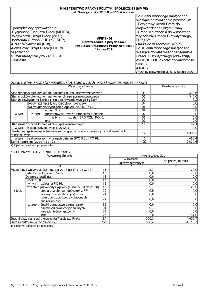 MINISTERSTWO PRACY I POLITYKI SPOŁECZNEJ (MPiPS) ul. Nowogrodzka 1/3/5 00 - 513 Warszawa Sporządzający sprawozdanie: -Dysponent Funduszu Pracy (MPiPS), -Wojewódzki Urząd Pracy (WUP), -Komenda Główna OHP (KG OHP), -Urząd Wojewódzki (UW), -Powiatowy Urząd Pracy (PUP) w Międzychód Numer identyfikacyjny - REGON 210038968 Do 8 dnia roboczego następnego miesiąca sprawozdanie przekazują: - Powiatowy Urząd Pracy do Wojewódzkiego Urzędu Pracy, - Urząd Wojewódzki do właściwego terytorialnie Urzędu Statystycznego, MPiPS - 02 PUP,UW Sprawozdanie o przychodach i wydatkach Funduszu Pracy za miesiąc - także do wiadomości MPiPS. Do 10 dnia roboczego następnego 12 roku 2011 miesiąca do właściwego terytorialnie Urzędu Statystycznego przekazują: -WUP, KG OHP - oraz do wiadomości MPiPS, -MPiPS Wszyscy powyżej do U. S. w Bydgoszczy DZIAŁ 1. STAN ŚRODKÓW PIENIĘŻNYCH, ZOBOWIĄZAŃ I NALEŻNOŚCI FUNDUSZU PRACY Wyszczególnienie Kwota w tys. zł. a) 0 1 Stan środków pieniężnych na początek okresu sprawozdawczego Stan środków pieniężnych na koniec okresu sprawozdawczego Stan zobowiązań na koniec okresu sprawozdawczego ogółem zobowiązania z tytułu kredytów i pożyczek zobowiązania wymagalne ogółem (w. 06, 07 i 09) wobec ZUS w tym z tego programów na rzecz promocji zatrudnienia w tym działań SPO RZL i PO KL inne Stan należności na koniec okresu sprawozdawczego w tym z tytułu udzielonych pożyczek Kwota zaangażowanych środków na programy na rzecz promocji zatrudnienia, w tym młodocianych w tym realizowanych w ramach działań SPO RZL i PO KL Suma kontrolna (w. od 1 do 13) 01 02 03 04 05 06 07 08 09 10 11 410,6 311,0 3,2 0,0 0,0 0,0 0,0 0,0 0,0 27,1 0,0 12 1 399,3 13 122 480,4 2 631,6 a) Z jednym znakiem po przecinku Dział 2. PRZYCHODY FUNDUSZU PRACY Wyszczególnienie 0 Przychody i wpływy ogółem (suma w. 15 do 17 oraz w. 19) 14 Składka na Fundusz Pracy 15 Dotacje z budżetu 16 Środki z UE 17 w tym działania PO KL 18 Pozostałe przychody i wpływy (suma w. 20 do w. 26) 19 z tego spłata udzielonych pożyczek z FP 20 wpływy z odsetek od pożyczek 21 refundacja zasiłków wypłaconych 22 cudzoziemcom z tego środki pomocowe zagraniczne 23 odsetki od środków pieniężnych 24 kary pieniężne i grzywny 25 inne 26 Środki otrzymane od dysponenta Funduszu Pracy 27 Suma kontrolna (w. od 14 do 27) 123 Kwota w tys. zł. a) w miesiącu od początku roku sprawozdawczym 1 2 2,7 0,0 0,0 0,0 0,0 2,7 0,0 0,0 0,0 0,0 0,0 0,7 0,0 2,0 360,3 368,4 0,0 6,0 0,0 14,0 4 053,7 4 113,7 a) Z jednym znakiem po przecinku Syriusz: 30140 - Międzychód - wyk. Jacek Lehmann dn. 29.03.2012 20,0 0,0 0,0 0,0 0,0 20,0 0,0 0,0 Strona 1 Dział 3. WYDATKI FUNDUSZU PRACY Wyszczególnienie Wykonanie - kwota w tys. zł. Liczba osób/miejsc 0 Wydatki ogółem (suma w. 29, 36 do 39 oraz w. 79 do 108) Zasiłek dla bezrobotnych ze składkami (suma w. 30 do 35) podstawowe obniżone z podwyższone tego składki na ubezpieczenia społeczne świadcz. za poszukujących pracy za granicą wypłacone cudzoziemcom z UE Zasiłki przedemerytalne i świadczenia przedemerytalne Dodatki aktywizacyjne Świadczenia integracyjne Programy na rzecz promocji zatrudnienia ogółem (suma w. 40, 47 do 52, 54, 60 do 78) Koszty szkoleń ogółem kwoty należne instytucjom szkoleniowym kwoty szkolenia refundowane z tego pracodawcom pożyczki szkoleniowe koszty studiów podyplomowych koszty egzaminów i uzyskania licencji inne Prace interwencyjne Roboty publiczne Prace społecznie użyteczne Zatrudnienie wspierane Refundacja kosztów wyposażenia i doposażenia stanowiska pracy z Środki na podjęcia działalności gospodarczej tego w tym w ramach spółdzielni socjalnej Stypendia i składki na ubezpieczenia społeczne za okres szkolenia za okres studiów podyplomowych za okres stażu za okres przygotowania zawodowego z tego dorosłych za okres kontynuowania nauki Refundacja składek na ubezpieczenie społeczne Koszty przejazdu zakwaterowania i wyżywienia Opieka nad dzieckiem lub osobą zależną Przygotowanie zawodowe dorosłych (art. 53 l ust. 1) z tego Koszty kształcenia młodocianych pracowników Staże podyplomowe lekarzy, dentystów i pielęgniarek Przygotowanie zawodowe młodocianych Koszty badań bezrobotnych Koszty umów z agencją zatrudnienia (art. 61b) Składki na ubezpieczenie społeczne rolników Świadczenia związane z usuwaniem skutków powodzi Dofinansowanie przedsiębiorcy kosztów szkoleń pracowników Dofinans. przedsiębiorcy kosztów studiów podyplomowych Dofin. przed-cy kosztów stypendiów i skł. na ubezp. społeczne Wynagrodzenia i koszty osobowe członków spółdzielni socjaln. Restrukturyzacja zatrudnienia Projekty pilotażowe Programy specjalne Inne instrumenty rynku pracy (z wiersza 39) Koszty wezwań, zawiadomień, przekazywania świadczeń itp. Liczba a) 1 28 29 w m-cu od początku osób w roku b) sprawozdaw. roku 2 3 4 462,6 4 425,6 237,6 2 378,8 716,1 340,3 834,0 481,0 0,0 7,4 0,0 56,5 446,7 341,0 206,0 265,0 30 31 32 33 34 35 36 37 38 77,0 35,0 94,0 20,0 28,0 59,6 21,0 85,3 71,7 0,0 0,0 0,0 6,1 26,6 39 181,0 145,7 1 399,3 608,0 40 5,0 6,7 72,8 44,0 41 5,0 6,7 65,5 40,0 42 0,0 0,0 0,0 0,0 43 44 45 46 47 48 49 50 0,0 0,0 0,0 0,0 23,0 0,0 83,0 0,0 0,0 0,0 0,0 0,0 15,1 0,0 16,1 0,0 0,0 7,3 0,0 0,0 240,3 0,0 102,1 0,0 0,0 4,0 0,0 0,0 54,0 0,0 155,0 0,0 51 0,0 0,0 0,0 0,0 52 53 1,0 0,0 20,5 0,0 194,2 0,0 10,0 0,0 54 69,0 87,3 779,0 276,0 55 56 57 10,0 0,0 59,0 7,4 0,0 79,9 57,7 5,3 716,0 67,0 7,0 202,0 58 0,0 0,0 0,0 0,0 59 0,0 0,0 0,0 0,0 60 0,0 0,0 0,0 0,0 61 62 0,0 0,0 0,0 0,0 7,0 0,0 24,0 0,0 63 0,0 0,0 0,0 0,0 64 0,0 0,0 65 0,0 0,0 0,0 0,0 84,0 103,0 66 67 68 69 0,0 0,0 0,0 0,0 0,0 0,0 0,0 0,0 0,0 3,9 0,0 0,0 0,0 45,0 0,0 0,0 70 0,0 0,0 0,0 0,0 71 0,0 0,0 0,0 0,0 72 0,0 0,0 0,0 0,0 73 0,0 0,0 0,0 0,0 74 0,0 0,0 0,0 0,0 75 76 77 78 0,0 0,0 0,0 0,0 0,0 0,0 0,0 0,0 0,0 0,0 1,8 34,8 79 0,0 a) Z jednym znakiem po przecinku. b) W niezaciemnionych wierszach rubryki 4 należy ujmo