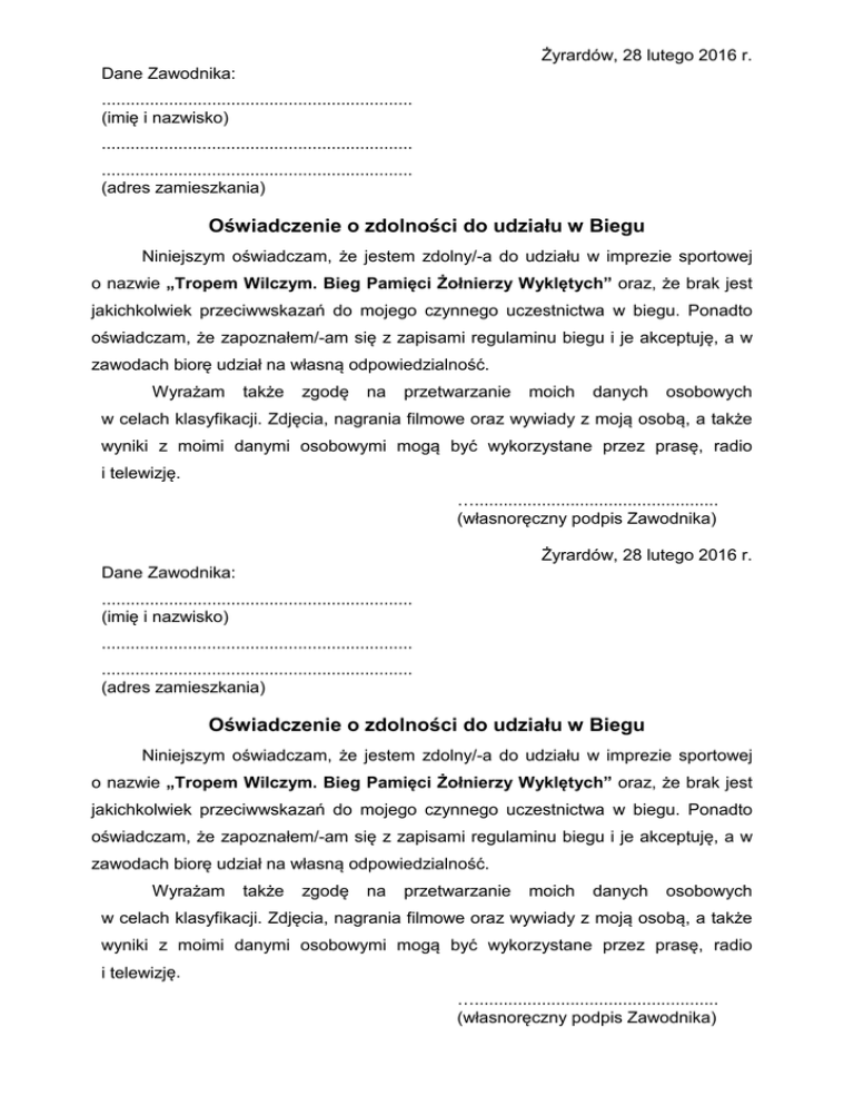 Żyrardów, 28 lutego 2016 r. Dane Zawodnika: ................................................................. (imię i nazwisko) ................................................................. ................................................................. (adres zamieszkania) Oświadczenie o zdolności do udziału w Biegu Niniejszym oświadczam, że jestem zdolny/-a do udziału w imprezie sportowej o nazwie „Tropem Wilczym. Bieg Pamięci Żołnierzy Wyklętych” oraz, że brak jest jakichkolwiek przeciwwskazań do mojego czynnego uczestnictwa w biegu. Ponadto oświadczam, że zapoznałem/-am się z zapisami regulaminu biegu i je akceptuję, a w zawodach biorę udział na własną odpowiedzialność. Wyrażam także zgodę na przetwarzanie moich danych osobowych w celach klasyfikacji. Zdjęcia, nagrania filmowe oraz wywiady z moją osobą, a także wyniki z moimi danymi osobowymi mogą być wykorzystane przez prasę, radio i telewizję. …................................................... (własnoręczny podpis Zawodnika) Żyrardów, 28 lutego 2016 r. Dane Zawodnika: ................................................................. (imię i nazwisko) ................................................................. ................................................................. (adres zamieszkania) Oświadczenie o zdolności do udziału w Biegu Niniejszym oświadczam, że jestem zdolny/-a do udziału w imprezie sportowej o nazwie „Tropem Wilczym. Bieg Pamięci Żołnierzy Wyklętych” oraz, że brak jest jakichkolwiek przeciwwskazań do mojego czynnego uczestnictwa w biegu. Ponadto oświadczam, że zapoznałem/-am się z zapisami regulaminu biegu i je akceptuję, a w zawodach biorę udział na własną odpowiedzialność. Wyrażam także zgodę na przetwarzanie moich danych osobowych w celach klasyfikacji. Zdjęcia, nagrania filmowe oraz wywiady z moją osobą, a także wyniki z moimi danymi osobowymi mogą być wykorzystane przez prasę, radio i telewizję. …................................................... (własnoręczny podpis Zawodnika)
