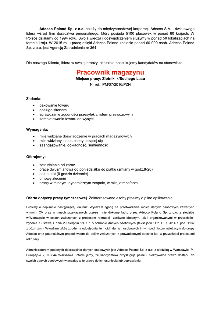 Adecco Poland Sp. z o.o. należy do międzynarodowej korporacji Adecco S.A. - światowego lidera wśród firm doradztwa personalnego, który posiada 5100 placówek w ponad 60 krajach. W Polsce działamy od 1994 roku. Swoją wiedzą i doświadczeniem służymy w ponad 50 lokalizacjach na terenie kraju. W 2015 roku pracę dzięki Adecco Poland znalazło ponad 60 000 osób. Adecco Poland Sp. z o.o. jest Agencją Zatrudnienia nr 364. Dla naszego Klienta, lidera w swojej branży, aktualnie poszukujemy kandydatów na stanowisko: Pracownik magazynu Miejsce pracy: Złotniki k/Suchego Lasu Nr ref.: PM/07/2016/PZN Zadania: pakowanie towaru obsługa skanera sprawdzanie zgodności przesyłek z listem przewozowym kompletowanie towaru do wysyłki Wymagania: mile widziane doświadczenie w pracach magazynowych mile widziany status osoby uczącej się zaangażowanie, dokładność, sumienność Oferujemy: zatrudnienie od zaraz pracę dwuzmianową od poniedziałku do piątku (zmiany w godz.8-20) pełen etat (8 godzin dziennie) umowę zlecenie pracę w młodym, dynamicznym zespole, w miłej atmosferze Oferta dotyczy pracy tymczasowej. Zainteresowane osoby prosimy o pilne aplikowanie. Prosimy o dopisanie następującej klauzuli: Wyrażam zgodę na przetwarzanie moich danych osobowych zawartych w moim CV oraz w innych przekazanych przeze mnie dokumentach, przez Adecco Poland Sp. z o.o. z siedzibą w Warszawie w celach związanych z procesem rekrutacji, zarówno obecnym, jak i organizowanymi w przyszłości, zgodnie z ustawą z dnia 29 sierpnia 1997 r. o ochronie danych osobowych (tekst jedn.: Dz. U. z 2014 r. poz. 1182 z późn. zm.). Wyrażam także zgodę na udostępnianie moich danych osobowych innym podmiotom należącym do grupy Adecco oraz potencjalnym pracodawcom do celów związanych z prowadzonymi obecnie lub w przyszłości procesami rekrutacji. Administratorem podanych dobrowolnie danych osobowych jest Adecco Poland Sp. z o.o. z siedzibą w Warszawie, Pl. Europejski 2, 00-844 Warszawa. Informujemy, że kandydatowi przysługuje pełne i niezbywalne prawo dostępu do swoich danych osobowych włączając w to prawo do ich usunięcia lub poprawiania.