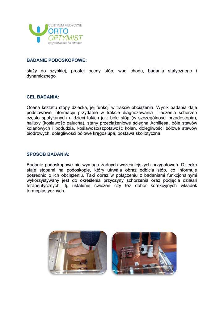 BADANIE PODOSKOPOWE: służy do szybkiej, prostej oceny stóp, wad chodu, badania statycznego i dynamicznego CEL BADANIA: Ocena kształtu stopy dziecka, jej funkcji w trakcie obciążenia. Wynik badania daje podstawowe informacje przydatne w trakcie diagnozowania i leczenia schorzeń często spotykanych u dzieci takich jak: bóle stóp (w szczególności przodostopia), halluxy (koślawość palucha), stany przeciążeniowe ścięgna Achillesa, bóle stawów kolanowych i podudzia, koślawość/szpotawość kolan, dolegliwości bólowe stawów biodrowych, dolegliwości bólowe kręgosłupa, postawa skoliotyczna SPOSÓB BADANIA: Badanie podoskopowe nie wymaga żadnych wcześniejszych przygotowań. Dziecko staje stopami na podoskopie, który utrwala obraz odbicia stóp, co informuje pośrednio o ich obciążeniu. Taki obraz w połączeniu z badaniami funkcjonalnymi wykorzystywany jest do określenia przyczyny schorzenia oraz podjęcia działań terapeutycznych, tj. ustalenie ćwiczeń czy też dobór korekcyjnych wkładek termoplastycznych.