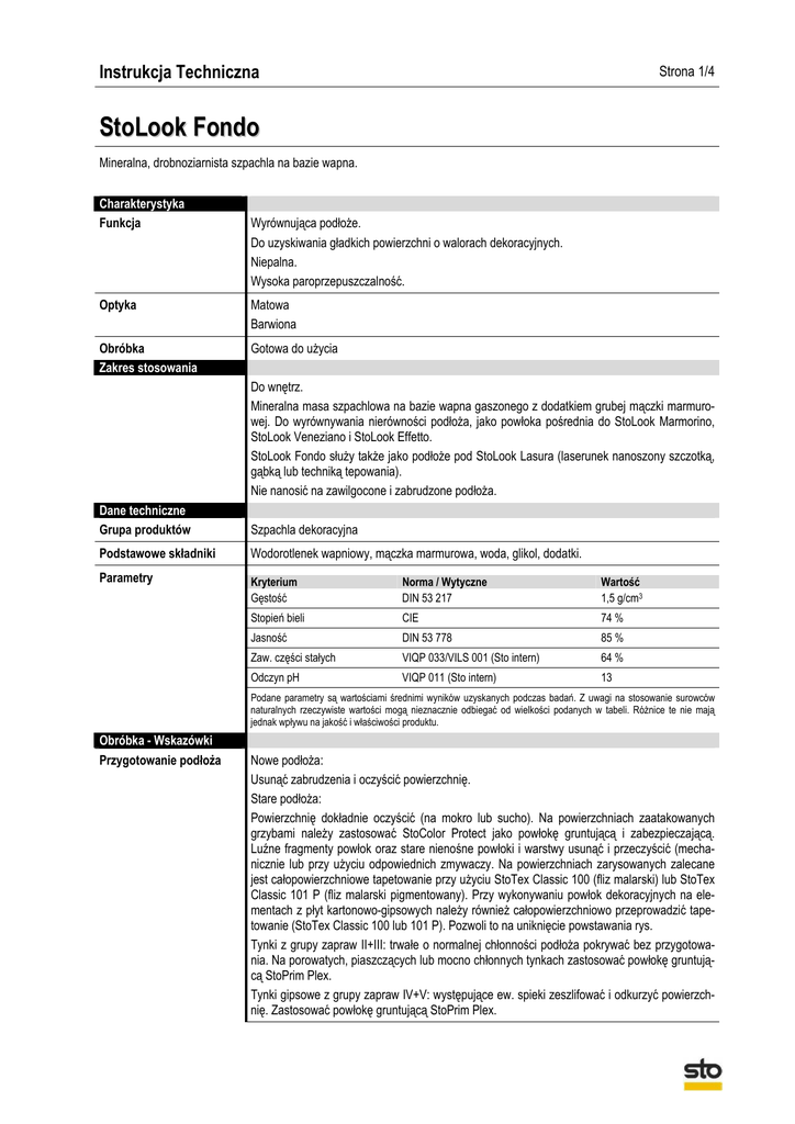 Instrukcja Techniczna Strona 1/4 StoLook Fondo Mineralna, drobnoziarnista szpachla na bazie wapna. Charakterystyka Funkcja Wyrównująca podłoże. Do uzyskiwania gładkich powierzchni o walorach dekoracyjnych. Niepalna. Wysoka paroprzepuszczalność. Optyka Matowa Barwiona Obróbka Zakres stosowania Gotowa do użycia Do wnętrz. Mineralna masa szpachlowa na bazie wapna gaszonego z dodatkiem grubej mączki marmurowej. Do wyrównywania nierówności podłoża, jako powłoka pośrednia do StoLook Marmorino, StoLook Veneziano i StoLook Effetto. StoLook Fondo służy także jako podłoże pod StoLook Lasura (laserunek nanoszony szczotką, gąbką lub techniką tepowania). Nie nanosić na zawilgocone i zabrudzone podłoża. Dane techniczne Grupa produktów Szpachla dekoracyjna Podstawowe składniki Wodorotlenek wapniowy, mączka marmurowa, woda, glikol, dodatki. Parametry Kryterium Gęstość Norma / Wytyczne DIN 53 217 Wartość 1,5 g/cm3 Stopień bieli CIE 74 % Jasność DIN 53 778 85 % Zaw. części stałych VIQP 033/VILS 001 (Sto intern) 64 % Odczyn pH VIQP 011 (Sto intern) 13 Podane parametry są wartościami średnimi wyników uzyskanych podczas badań. Z uwagi na stosowanie surowców naturalnych rzeczywiste wartości mogą nieznacznie odbiegać od wielkości podanych w tabeli. Różnice te nie mają jednak wpływu na jakość i właściwości produktu. Obróbka - Wskazówki Przygotowanie podłoża Nowe podłoża: Usunąć zabrudzenia i oczyścić powierzchnię. Stare podłoża: Powierzchnię dokładnie oczyścić (na mokro lub sucho). Na powierzchniach zaatakowanych grzybami należy zastosować StoColor Protect jako powłokę gruntującą i zabezpieczającą. Luźne fragmenty powłok oraz stare nienośne powłoki i warstwy usunąć i przeczyścić (mechanicznie lub przy użyciu odpowiednich zmywaczy. Na powierzchniach zarysowanych zalecane jest całopowierzchniowe tapetowanie przy użyciu StoTex Classic 100 (fliz malarski) lub StoTex Classic 101 P (fliz malarski pigmentowany). Przy wykonywaniu powłok dekoracyjnych na elementach z płyt kartonowo-gipsowych należy również całopowierzchniowo przeprowadzić tapetowanie (StoTex Classic 100 lub 101 P). Pozwoli to na uniknięcie powstawania rys. Tynki z grupy zapraw II+III: trwałe o normalnej chłonności podłoża pokrywać bez przygotowania. Na porowatych, piaszczących lub mocno chłonnych tynkach zastosować powłokę gruntującą StoPrim Plex. Tynki gipsowe z grupy zapraw IV+V: występujące ew. spieki zeszlifować i odkurzyć powierzchnię. Zastosować powłokę gruntującą StoPrim Plex. Instrukcja Techniczna Strona 2/4 StoLook Fondo Mineralna, drobnoziarnista szpachla na bazie wapna. Płyty gipsowe: płyty o wysokiej chłonności zagruntować StoPrim Plex Płyty kartonowo-gipsowe: dokładnie wyszlifować miejsca szpachlowania styków, zagruntować StoPrim Plex. W przypadku ryzyka wystąpienia wykwitów należy zagruntować powłoką StoPrim LP. Beton: pozostałości oleju szalunkowego, smaru lub wosku usunąć parą pod ciśnieniem. Niewielkie ubytki naprawić StoLevell Plan Z. Zagruntować przy użyciu StoPrim Plex. Porobeton: zagruntować StoPrim Plex i wyszpachlować na gładko. Mur licowy z cegły: przemyć i odpylić, zagruntować StoPrim Plex. Płyty z materiałów drewnopochodnych: płyty przygotować odpowiednio dla danego rodzaju, zagruntować StoPrim Plex lub Sto-Aquagrund. Nośne powłoki: matowe, mało chłonne powłoki pokrywać bez przygotowania. Błyszczące powierzchnie i lakiery uszortnić/zmatowić. Gruntowanie StoPrim Plex (tylko przy mocno chłonnych starych powłokach dyspersyjnych). Powłoki nienośne: nienośne lakiery i powłoki dyspersyjne całkowicie usunąć. Zagruntować StoPrim Plex. Stare powłoki wapienne i mineralne: usunąć mechanicznie i odpylić powierzchnię. Zagruntować StoPrim Plex. Farby klejowe: dokładnie zmyć, zastosować grunt odpowiedni do podłoża. Tapety: dokładnie usunąć, zmyć resztki kleju i makulatury. Ubytki uzupełnić masą szpachlową odpowiednią dla danego podłoża. Powierzchnie zagrzybione: wykwity grzybów zmyć na mokro (szorowanie). Następnie przemalować StoColor Protect, dalsze przygotowanie podłoża w zależności od rodzaju i stanu. Powierzchnie z plamami z nikotyny, wody, kurzu lub tłuszczu: zmyć powierzchnię wodą z dodatkiem domowych środków czyszczących, po dokładnym wyschnięciu przetrzeć szczotką. Nanieść powłokę izolującą StoPrim Isol lub StoPrim LP. Temperatura obróbki Minimalna temperatura obróbki +5°C Układ warstw Gruntowanie: W zależności od podłoża Nanieść równomiernie StoPrep In Warstwa pośrednia: StoLook Fondo Warstwa końcowa: StoLook Fondo Przez zastosowanie różnych technik obróbki dostępne są następujące efekty: StoLook Fondo classico (patrz Obróbka) StoLook Fondo travertino* StoLook Fondo rustico* StoLook Fondo antico* * szczegółowe informacje dot. obróbki u przedstawiciela Sto-ispo Kolejne powłoki mogą być wykonywane ze StoLook Marmorino, StoLook Veneziano, StoLook Lasura i StoLook Wax. Przygotowanie materiału Gotowy do obróbki Zużycie Zastosowanie classico – 1 cykl roboczy Zużycie ok. 0,8-1,0 kg/m2 classico – 2 cykl roboczy 0,8-1,0 kg/m2 Instrukcja Techniczna Strona 3/4 StoLook Fondo Mineralna, drobnoziarnista szpachla na bazie wapna. travertino – 1 cykl roboczy 0,8-1,0 kg/m2 travertino – 2 cykl roboczy 0,8-1,0 kg/m2 rustico – 1 cykl roboczy 0,8-1,0 kg/m2 rustico – 2 cykl roboczy 0,8-1,0 kg/m2 antico – 1 cykl roboczy 0,8-1,0 kg/m2 antico – 2 cykl roboczy 0,8-1,0 kg/m2 Zużycie zależne jest od podłoża i techniki nanoszenia. Podana wartość jest wielkością orientacyjną. Dokładne wartości zużycia należy ustalić dla danego podłoża. Obróbka StoLook Fondo classico Zależnie od podłoża (chropowatości) naciągnąć 1 – 2 - krotnie na całą powierzchnię na grubość ziarna (czas schnięcia 12 godzin). Wierzchnią warstwę StoLook Fondo należy po dostatecznym zwi