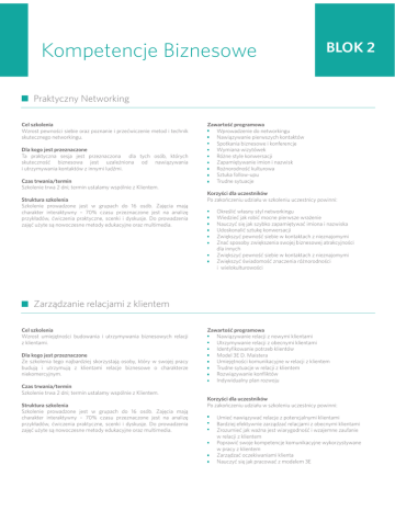 Kompetencje Biznesowe BLOK 2 Praktyczny Networking Cel szkolenia Wzrost pewności siebie oraz poznanie i przećwiczenie metod i technik skutecznego networkingu. Dla kogo jest przeznaczone Ta praktyczna sesja jest przeznaczona dla tych osób, których skuteczność biznesowa jest uzależniona od nawiązywania i utrzymywania kontaktów z innymi ludźmi. Czas trwania/termin Szkolenie trwa 2 dni; termin ustalamy wspólnie z Klientem. Struktura szkolenia Szkolenie prowadzone jest w grupach do 16 osób. Zajęcia mają charakter interaktywny – 70% czasu przeznaczone jest na analizę przykładów, ćwiczenia praktyczne, scenki i dyskusje. Do prowadzenia zajęć użyte są nowoczesne metody edukacyjne oraz multimedia. Zawartość programowa Wprowadzenie do networkingu Nawiązywanie pierwszych kontaktów Spotkania biznesowe i konferencje Wymiana wizytówek Różne style konwersacji Zapamiętywanie imion i nazwisk Rożnorodność kulturowa Sztuka follow-upu Trudne sytuacje Korzyści dla uczestników Po zakończeniu udziału w szkoleniu uczestnicy powinni: Określić własny styl networkingu Wiedzieć jak robić mocne pierwsze wrażenie Nauczyć się jak szybko zapamiętywać imiona i nazwiska Udoskonalić sztukę konwersacji Zwiększyć pewność siebie w kontaktach z nieznajomymi Znać sposoby zwiększenia swojej biznesowej atrakcyjności dla innych Zwiększyć pewność siebie w kontaktach z nieznajomymi Zwiększyć świadomość znaczenia różnorodności i wielokulturowości Zarządzanie relacjami z klientem Cel szkolenia Wzrost umiejętności budowania i utrzymywania biznesowych relacji z klientami. Dla kogo jest przeznaczone Ze szkolenia tego najbardziej skorzystają osoby, który w swojej pracy budują i utrzymują z klientami relacje biznesowe o charakterze niekomercyjnym. Zawartość programowa Nawiązywanie relacji z nowymi klientami Utrzymywanie relacji z obecnymi klientami Identyfikowanie potrzeb klientów Model 3E D. Maistera Umiejętności komunikacyjne w relacji z klientem Trudne sytuacje w relacji z klientem Rozwiązywanie konfliktów Indywidualny plan rozwoju Czas trwania/termin Szkolenie trwa 2 dni; termin ustalamy wspólnie z Klientem. Struktura szkolenia Szkolenie prowadzone jest w grupach do 16 osób. Zajęcia mają charakter interaktywny – 70% czasu przeznaczone jest na analizę przykładów, ćwiczenia praktyczne, scenki i dyskusje. Do prowadzenia zajęć użyte są nowoczesne metody edukacyjne oraz multimedia. Korzyści dla uczestników Po zakończeniu udziału w szkoleniu uczestnicy powinni: Umieć nawiązywać relacje z potencjalnymi klientami Bardziej efektywnie zarządzać relacjami z obecnymi klientami Zrozumieć jak ważna jest wiarygodność i wzajemne zaufanie w relacji z klientem Poprawić swoje kompetencje komunikacyjne wykorzystywane w pracy z klientem Zarządzać oczekiwaniami klienta Nauczyć się jak pracować z modelem 3E