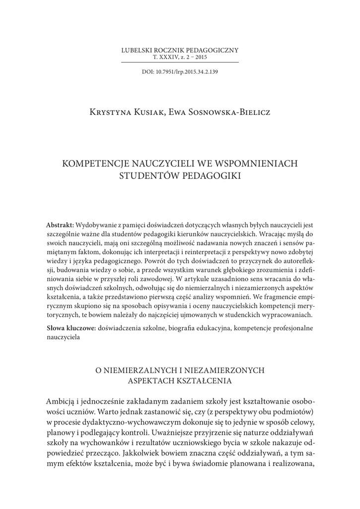 Lubelski rocznik pedagogiczny t. XXXIV, z. 2 – 2015 DOI: 10.7951/lrp.2015.34.2.139 Krystyna Kusiak, Ewa Sosnowska-Bielicz Kompetencje nauczycieli we wspomnieniach studentów pedagogiki Abstrakt: Wydobywanie z pamięci doświadczeń dotyczących własnych byłych nauczycieli jest szczególnie ważne dla studentów pedagogiki kierunków nauczycielskich. Wracając myślą do swoich nauczycieli, mają oni szczególną możliwość nadawania nowych znaczeń i sensów pamiętanym faktom, dokonując ich interpretacji i reinterpretacji z perspektywy nowo zdobytej wiedzy i języka pedagogicznego. Powrót do tych doświadczeń to przyczynek do autorefleksji, budowania wiedzy o sobie, a przede wszystkim warunek głębokiego zrozumienia i zdefiniowania siebie w przyszłej roli zawodowej. W artykule uzasadniono sens wracania do własnych doświadczeń szkolnych, odwołując się do niemierzalnych i niezamierzonych aspektów kształcenia, a także przedstawiono pierwszą część analizy wspomnień. We fragmencie empirycznym skupiono się na sposobach opisywania i oceny nauczycielskich kompetencji merytorycznych, te bowiem należały do najczęściej ujmowanych w studenckich wypracowaniach. Słowa kluczowe: doświadczenia szkolne, biografia edukacyjna, kompetencje profesjonalne nauczyciela O niemierzalnych i niezamierzonych aspektach kształcenia Ambicją i jednocześnie zakładanym zadaniem szkoły jest kształtowanie osobowości uczniów. Warto jednak zastanowić się, czy (z perspektywy obu podmiotów) w procesie dydaktyczno-wychowawczym dokonuje się to jedynie w sposób celowy, planowy i podlegający kontroli. Uważniejsze przyjrzenie się naturze oddziaływań szkoły na wychowanków i rezultatów uczniowskiego bycia w szkole nakazuje odpowiedzieć przecząco. Jakkolwiek bowiem znaczna część oddziaływań, a tym samym efektów kształcenia, może być i bywa świadomie planowana i realizowana, 140 Krystyna Kusiak, Ewa Sosnowska-Bielicz to inne są skutkiem tego, co szkoła przekazuje uczniowi jako niezakładaną i niepodlegającą kontroli informację, wydobywającą się niejako z drugiego planu jej funkcjonowania jako instytucji1. Można to wiązać między innymi z właściwościami wychowania, które – jak pisze B. Śliwerski – „[…] nie jest jakąś czynnością czy procesem, który można zaplanować, wdrożyć panując nad wszystkimi z możliwych jego determinant, poddać je kontroli, ocenić jego zgodność z modelem i ogłosić ostateczny efekt w kategoriach niezaprzeczalnego sukcesu lub porażki, gdyż ono się nigdy nie kończy” (2001, s. 71). Można także łączyć z istotą kompetencji nauczycielskich, a dokładniej z naturą ich emocjonalno-motywacyjnego składnika. Motywacja, rozumienia i pragnienia, świadomość i odpowiedzialność, na które zwraca uwagę M. Czerepaniak-Walczak (1994, s. 137) w definicji pojęcia, nie poddają się pełnej operacjonalizacji, to znaczy sprowadzeniu do mierzalnych i obserwowalnych kategorii, i tym samym nie podlegają wprost zewnętrznej czy nawet pełnej wewnętrznej kontroli. Podobnie rzecz się ma, jeśli chodzi o uczniowski wymiar uczestnictwa w procesie kształcenia. Co do części rezultatów, jakie ono przynosi (czy to bieżących, czy tych, o których można orzekać po czasie), uczniowie są ich świadomi i mogą je kontrolować. Inne natomiast można nazwać niejawnymi i nieświadomymi. Wynika to – najprościej rzecz ujmując – z natury wiedzy, która nie jest prostą sumą wiadomości czy doświadczeń, ale funkcjonuje jak złożona sieć, system konstytuujący się dzięki względnie odrębnym, ale wzajemnie współzależnym i dopełniającym się typom wiedzy: deklaratywnej, proceduralnej i kontekstowej (Kozielecki 1997; Tennyson 1991). W tej dynamicznej strukturze informacje nie muszą być dokładnie pamiętane, by dobrze funkcjonować (Tomaszewski 1982, s. 26), a więc uczeń nie musi zdawać sobie sprawy ze wszystkich elementów stanowiących podstawę jego rozumowania. Tak pojmowana wiedza nie jest również jedynie ostatecznym i statycznym skutkiem, lecz także początkiem możliwości (dyspozycją) samodzielnego uczenia się, podejmowania rozumowań, wnioskowania, reinterpretacji, myślenia krytycznego, twórczego itp. w dowolnej sytuacji i na dowolnym materiale. Przyjmując perspektywę ucznia, możemy zatem mówić, że tak jak w niektórych obszarach nauczyciele i szkoła oddziałują na niego w niepoddawany i ze względu na swą naturę niepoddający się kontroli sposób, tak i wychowanek nie zawsze wie, co i jak na niego działa. Nie poddaje tego świadomej obróbce, to jest nie tylko nie werbalizuje swoich odczuć i doświadczeń, ale też niekoniecznie potrafi wskazać źródło swych przekonań czy decyzji. Natura wiedzy i nieświadomości (zob. Pervin 2002, s. 211 i in.) sprawiają, że w takich razach wnioskowanie o przyczynach 1 W literaturze przedmiotu zjawisko to poddawane jest analizie jako program ukryty szkoły, por. Kyriacou 1997, s. 35; Meighan 1993, s. 71 i n. Kompetencje nauczycieli we wspomnieniach studentów pedagogiki 141 ze skutków nie tylko nie bywa potrzebne, ale też ma charakter, obarczonego znacznym błędem, domniemywania. Wracanie do własnych doświadczeń szkolnych Czy wobec powyższego istnieją sytuacje, w których warto wracać do doświadczeń i prowokować do ich przechodzenia z postaci niejawnej do jawnej? Tak, pod warunkiem, że czemuś to służy. Najogólniej rzecz ujmując, zwykle uważa się, że służy to uczeniu się z własnego życia. Warto jednak zauważyć, że oddziaływanie przeszłości na teraźniejszość i przyszłość nie jest prostą zależnością i z pewnością nie ma wyłącznie liniowego charakteru. Jest raczej – jak w kręgu hermeneutycznym – ciągłym uzasadnianiem się i współdopełnianiem teraźniejszości w przeszłości, a przeszłości w teraźniejszości. Po pierwsze dlatego, że wspominanie nie polega na wiernym odbijaniu prze