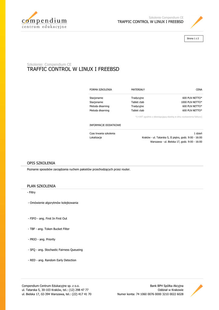 Szkolenie Compendium CE TRAFFIC CONTROL W LINUX I FREEBSD Strona 1 z 2 Szkolenie: Compendium CE TRAFFIC CONTROL W LINUX I FREEBSD FORMA SZKOLENIA MATERIAŁY CENA Stacjonarne Tradycyjne 600 PLN NETTO* Stacjonarne Tablet ctab 1000 PLN NETTO* Metoda dlearning Tradycyjne 600 PLN NETTO* Metoda dlearning Tablet ctab 600 PLN NETTO* *(+VAT zgodnie z obowiązującą stawką w dniu wystawienia faktury) INFORMACJE DODATKOWE Czas trwania szkolenia 1 dzień Lokalizacje Kraków - ul. Tatarska 5, II piętro, godz. 9:00 - 16:00 Warszawa - ul. Bielska 17, godz. 9:00 - 16:00 OPIS SZKOLENIA Poznanie sposobów zarządzania ruchem pakietów przechodzących przez router. PLAN SZKOLENIA - Filtry - Omówienie algorytmów kolejkowania - FIFO - ang. First In First Out - TBF - ang. Token Bucket Filter - PRIO - ang. Priority - SFQ - ang. Stochastic Fairness Queueing - RED - ang. Random Early Detection Compendium Centrum Edukacyjne sp. z o.o. ul. Tatarska 5, 30-103 Kraków, tel.: (12) 298 47 77 ul. Bielska 17, 02-394 Warszawa, tel.: (22) 417 41 70 Bank BPH Spółka Akcyjna Oddział w Krakowie Numer konta: 74 1060 0076 0000 3210 0022 6028 Szkolenie Compendium CE TRAFFIC CONTROL W LINUX I FREEBSD Strona 2 z 2 - CBQ - ang. Class Based Queueing - ALTQ - alternatywne kolejkowanie dla systemów BSD WYMAGANIA DLA UCZESTNIKA Znajomość sieci TCP/IP oraz Linux?a. CERTYFIKATY Uczestnicy szkolenia otrzymują certyfikat wystawiony imiennie oraz na firmę, sygnowany przez Compendium - Centrum Edukacyjne Veracomp SA PROWADZĄCY Wykładowca Compendium CE Compendium Centrum Edukacyjne sp. z o.o. ul. Tatarska 5, 30-103 Kraków, tel.: (12) 298 47 77 ul. Bielska 17, 02-394 Warszawa, tel.: (22) 417 41 70 Bank BPH Spółka Akcyjna Oddział w Krakowie Numer konta: 74 1060 0076 0000 3210 0022 6028