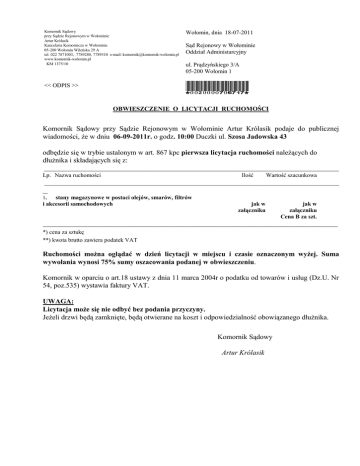 Komornik Sądowy przy Sądzie Rejonowym w Wołominie Artur Królasik Kancelaria Komornicza w Wołominie 05-200 Wołomin Wileńska 29 A tel. 022 7871003, 7789280, 7789310 e-mail: [email protected] www.komornik-wolomin.pl KM 1375/10 Wołomin, dnia 18-07-2011 << ODPIS >> *0020000706717* Sąd Rejonowy w Wołominie Oddział Administarcyjny ul. Prądzyńskiego 3/A 05-200 Wołomin 1 OBWIESZCZENIE O LICYTACJI RUCHOMOŚCI Komornik Sądowy przy Sądzie Rejonowym w Wołominie Artur Królasik podaje do publicznej wiadomości, że w dniu 06-09-2011r. o godz. 10:00 Duczki ul. Szosa Jadowska 43 odbędzie się w trybie ustalonym w art. 867 kpc pierwsza licytacja ruchomości należących do dłużnika i składających się z: _______________________________________________________________________________________________________________________ Lp. Nazwa ruchomości Ilość Wartość szacunkowa _______________________________________________________________________________________________________________________ __ 1. stany magazynowe w postaci olejów, smarów, filtrów i akcesorii samochodowych jak w załączniku jak w załączniku Cena B za szt. _______________________________________________________________________________________________________________________ *) cena za sztukę **) kwota brutto zawiera podatek VAT Ruchomości można oglądać w dzień licytacji w miejscu i czasie oznaczonym wyżej. Suma wywołania wynosi 75% sumy oszacowania podanej w obwieszczeniu. Komornik w oparciu o art.18 ustawy z dnia 11 marca 2004r o podatku od towarów i usług (Dz.U. Nr 54, poz.535) wystawia faktury VAT. UWAGA: Licytacja może się nie odbyć bez podania przyczyny. Jeżeli drzwi będą zamknięte, będą otwierane na koszt i odpowiedzialność obowiązanego dłużnika. Komornik Sądowy Artur Królasik Adresat oryginału: Michał Wiesław Skoczeń Do wiadomości: 1. RADCA PRAWNY ARTUR KLIMKIEWICZ, 20-022 Lublin 2. Sąd Rejonowy w Wołominie Oddział Administarcyjny, 05-200 Wołomin 1 3. Kancelaria "INKASSING" Adwokat Izabela Tyszkiewicz, 90-554 Łódź 4. Kancelaria Radcy Prawnego Artur Klimkiewicz, 20-022 Lublin 5. Kancelaria Prawna Radca Prawny Ewa Batko-Matczewska, 30-535 Kraków 6. a/a