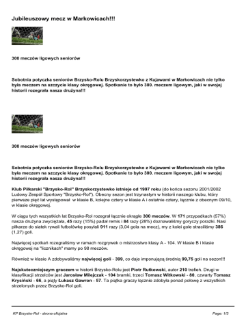 Jubileuszowy mecz w Markowicach!!! 300 meczów ligowych seniorów Sobotnia potyczka seniorów Brzysko-Rolu Brzyskorzystewko z Kujawami w Markowicach nie tylko była meczem na szczycie klasy okręgowej. Spotkanie to było 300. meczem ligowym, jaki w swojej historii rozegrała nasza drużyna!!! 300 meczów ligowych seniorów Sobotnia potyczka seniorów Brzysko-Rolu Brzyskorzystewko z Kujawami w Markowicach nie tylko była meczem na szczycie klasy okręgowej. Spotkanie to było 300. meczem ligowym, jaki w swojej historii rozegrała nasza drużyna!!! Klub Piłkarski "Brzysko-Rol" Brzyskorzystewko istnieje od 1997 roku (do końca sezonu 2001/2002 Ludowy Zespół Sportowy "Brzysko-Rol"). Obecny sezon jest trzynastym w historii naszego klubu, który pierwsze pięć lat występował w klasie B, kolejne cztery w klasie A i ostatnie cztery, łącznie z obecnym 09/10, w klasie okręgowej. W ciągu tych wszystkich lat Brzysko-Rol rozegrał łącznie okrągłe 300 meczów. W 171 przypadkach (57%) nasza drużyna zwyciężała, 45 razy (15%) padał remis i 84 razy (28%) doznawaliśmy goryczy porażki. Nasi piłkarze do siatek rywali futbolówkę posyłali 911 razy (3,04 gola na mecz), my z kolei gole straciliśmy 386 (1,27) goli. Najwięcej spotkań rozegraliśmy w ramach rozgrywek o mistrzostwo klasy A - 104. W klasie B i klasie okręgowej na "licznikach" mamy po 98 meczów. Również w klasie A zdobywaliśmy najwięcej goli - 399, co daje imponującą średnią 99,75 goli na sezon!!! Najskuteczniejszym graczem w historii Brzysko-Rolu jest Piotr Rutkowski, autor 210 trafień. Drugi w klasyfikacji strzelców jest Jarosław Milejczak - 104 bramki, trzeci Tomasz Witkowski - 80, czwarty Tomasz Krysiński - 66, a piąty Łukasz Gawron - 57. Ta piątka graczy łącznie zdobyła ponad połowę z wszystkich strzelonych przez Brzysko-Rol goli. KP Brzysko-Rol - strona oficjalna Page: 1/3 Przez trzynaście sezonów, łącznie z obecnym, na boisku w barwach Brzysko-Rolu oglądać mogliśmy i nadal możemy aż 97 piłkarzy. Są wśród nich tacy, którzy mają na koncie kilka sezonów, ale znajdziemy też graczy, mających za sobą krótkie epizody w klubie z Brzyskorzystewka. Najwięcej rozegranych sezonów mają: 1. Piotr Rutkowski - 11 sezonów 2. Jarosław Milejczak - 10 sezonów 3. Karol Klucz - 9 sezonów 4. Tomasz Witkowski - 8 sezonów -. Rafał Krygier - 8 sezonów Jeśli chodzi o szkoleniowców, prowadzących pierwszą drużynę w poszczególnych sezonach, to przez 13 sezonów było ich zaledwie trzech. Od początku istnienia klubu - sezon 1997/1998, do końca sezonu 1998/1999 drużynę prowadził Janusz Nowak. Przez rundę jesienną sezonu 1999/2000 trenerem był Włodzimierz Cytlak. Od rundy wiosennej jednak drużynę ponownie przejął Janusz Nowak, który na stanowisku pozostał do końca sezonu 2001/2002, zdobywając ze swoimi podopiecznymi mistrzostwo klasy B i awansując do A klasy. Po tym sezonie zarząd Brzysko-Rolu na stanowisku trenera zatrudnił Rafała Krygiera, mającego za sobą występy w polskiej I lidze oraz w młodzieżowej Reprezentacji Polski. Do dnia dzisiejszego ten grający szkoleniowiec pracuje z pierwszym zespołem, wprowadzając go w sezonie 2005/2006 z A klasy do V ligi. Poniżej dorobek kolejnych trenerów Brzysko-Rolu: Trener Janusz Nowak Włodzimierz Cytlak Rafał Krygier Liczba sezonów Mecze Zwyc. Rem. Por. Bramki 4,5 88 45 17 26 235:143 0,5 10 2 0 8 15:29 8 202 124 28 50 661:284 Więcej szczegółowych statystyk znajdziecie w dziale " Historia Brzysko-Rolu ". Zapraszamy do lektury. Poniżej statystyczne zestawienie kolejnych sezonów w wykonaniu Brzysko-Rolu: Sezon sezon 97/98 klasa B sezon 98/99 klasa B sezon 99/00 klasa B sezon 00/01 klasa B sezon 01/02 klasa B Mecze Zwyc. Rem. Por. Bramki 22 9 5 8 41:46 22 6 5 11 37:40 20 7 1 12 33:49 18 13 2 3 81:20 16 12 4 0 58:17 KP Brzysko-Rol - strona oficjalna Page: 2/3 sezon 02/03 klasa A sezon 03/04 klasa A sezon 04/05 klasa A sezon 05/06 klasa A sezon 06/07 V liga sezon 07/08 V liga sezon 08/09 V liga sezon 09/10 V liga RAZEM 26 12 3 11 63:39 26 19 5 2 109:28 26 19 1 6 119:34 26 23 2 1 108:14 30 16 4 10 75:53 30 14 7 9 73:45 30 16 5 9 93:56 8 5 1 2 21:15 300 171 45 84 911:386 Wysłane przez : koniubrzesc, dnia 27 wrzesień 2009 KP Brzysko-Rol - strona oficjalna Page: 3/3