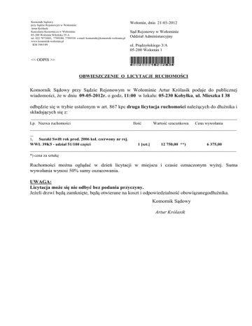 Komornik Sądowy przy Sądzie Rejonowym w Wołominie Artur Królasik Kancelaria Komornicza w Wołominie 05-200 Wołomin Wileńska 29 A tel. 022 7871003, 7789280, 7789310 e-mail: [email protected] www.komornik-wolomin.pl KM 3965/09 Wołomin, dnia 21-03-2012 << ODPIS >> *0020001820283* Sąd Rejonowy w Wołominie Oddział Administarcyjny ul. Prądzyńskiego 3/A 05-200 Wołomin 1 OBWIESZCZENIE O LICYTACJI RUCHOMOŚCI Komornik Sądowy przy Sądzie Rejonowym w Wołominie Artur Królasik podaje do publicznej wiadomości, że w dniu 09-05-2012r. o godz. 11:00 w lokalu: 05-230 Kobyłka, ul. Mieszka I 38 odbędzie się w trybie ustalonym w art. 867 kpc druga licytacja ruchomości należących do dłużnika i składających się z: _______________________________________________________________________________________________________________________ Lp. Nazwa ruchomości Ilość Wartość szacunkowa Cena wywołania _______________________________________________________________________________________________________________________ __ 1. Suzuki Swift rok prod. 2006 kol. czerwony nr rej. WWL 39K5 - udział 51/100 części 1 [szt.] 12 750,00 **) 6 375,00 _______________________________________________________________________________________________________________________ *) cena za sztukę Ruchomości można oglądać w dzień licytacji w miejscu i czasie oznaczonym wyżej. Suma wywołania wynosi 50% sumy oszacowania. UWAGA: Licytacja może się nie odbyć bez podania przyczyny. Jeżeli drzwi będą zamknięte, będą otwierane na koszt i odpowiedzialność obowiązanegodłużnika. Komornik Sądowy Artur Królasik