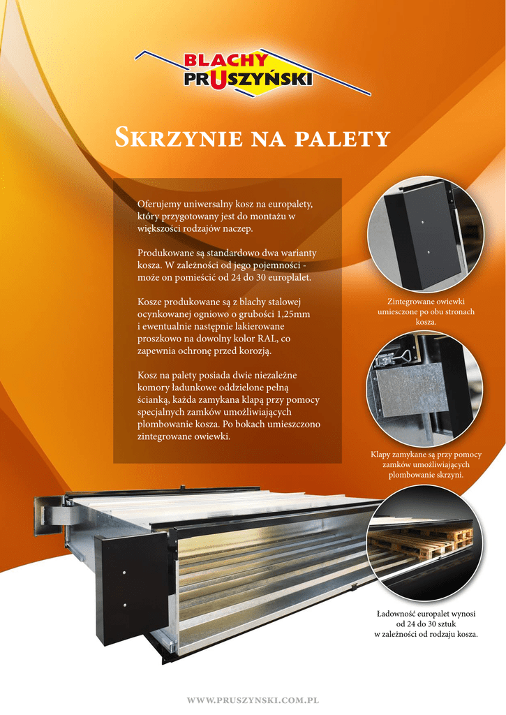 Skrzynie na palety Oferujemy uniwersalny kosz na europalety, który przygotowany jest do montażu w większości rodzajów naczep. Produkowane są standardowo dwa warianty kosza. W zależności od jego pojemności może on pomieścić od 24 do 30 europlalet. Kosze produkowane są z blachy stalowej ocynkowanej ogniowo o grubości 1,25mm i ewentualnie następnie lakierowane proszkowo na dowolny kolor RAL, co zapewnia ochronę przed korozją. Zintegrowane owiewki umiesczone po obu stronach kosza. Kosz na palety posiada dwie niezależne komory ładunkowe oddzielone pełną ścianką, każda zamykana klapą przy pomocy specjalnych zamków umożliwiających plombowanie kosza. Po bokach umieszczono zintegrowane owiewki. Klapy zamykane są przy pomocy zamków umożliwiających plombowanie skrzyni. Ładowność europalet wynosi od 24 do 30 sztuk w zależności od rodzaju kosza. www.pruszynski.com.pl Skrzynie na palety wymiary zewnętrzne kosza C B A warianty rozmiarowe A(mm) B (mm) C (mm) ładowność 24 europalety 2700 2450 520 ładowność 30 europalety 2700 2450 620 Wskazówka eksploatacyjna Transport mniejszej ilości palet niż przewiduje to ładowność kosza, w skutek niekontrolowanego przemieszczania, może doprowadzić do jego uszkodzenia. Zalecamy więc każdorazowo zabezpieczyć palety przed przemieszczaniem. Przetłoczenia krzyżowe na bocznych klapach zamykających nadają koszom estetyczny wygląd. Zsuwane klapy pod podłogę skrzyni łączą niezawodność działania, jak również wysoką trwałość i odporność na uszkodzenia. Pruszyński Sp. z o. o. ZAKŁAD PRODUKCYJNY 05-806 Komorów, Sokołów ul. Sokołowska 32B tel. 0-22 738 60 00, fax 0-22 738 61 01 www.pruszynski.com.pl e-mail: [email protected] www.pruszynski.com.pl