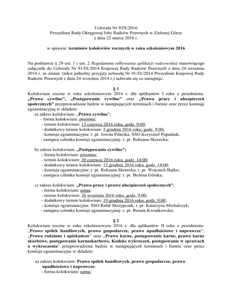 Uchwała Nr 9/IX/2016 Prezydium Rady Okręgowej Izby Radców Prawnych w Zielonej Górze z dnia 22 marca 2016 r. w sprawie: terminów kolokwiów rocznych w roku szkoleniowym 2016 Na podstawie § 29 ust. 1 i ust. 2 Regulaminu odbywania aplikacji radcowskiej stanowiącego załącznik do Uchwały Nr 91/IX/2014 Krajowej Rady Radców Prawnych z dnia 24 września 2014 r. ze zmian. (tekst jednolity przyjęty uchwałą Nr 91/IX/2014 Prezydium Krajowej Rady Radców Prawnych z dnia 24 września 2014 r.) uchwala się co następuje: §1 Kolokwium roczne w roku szkoleniowym 2016 r. dla aplikantów I roku z przedmiotu: „Prawo cywilne”, „Postępowanie cywilne” oraz „Prawo pracy i ubezpieczeń społecznych” przeprowadzone będzie w następujących terminach i formie oraz przez komisję egzaminacyjną w składzie: a) zakres kolokwium: „Prawo cywilne”; - forma kolokwium: pisemna; - termin kolokwium: 13 czerwca 2016 roku, godz. 9:00; - dodatkowy termin kolokwium: 5 grudnia 2016 roku, godz. 9:00; - komisja egzaminacyjna: r. pr. Jowita Pilarska, SSO Krzysztof Popadiuk; - zastępca członka komisji egzaminacyjnej: r. pr. Roksana Skorecka; b) zakres kolokwium: „Postępowanie cywilne”; - forma kolokwium: pisemna; - termin kolokwium: 20 czerwca 2016 roku, godz. 14:00; - dodatkowy termin kolokwium: 12 grudnia 2016 roku, godz. 14:00; - komisja egzaminacyjna: r. pr. Roksana Skorecka, r. pr. Wojciech Bujko; - zastępca członka komisji egzaminacyjnej: r. pr. Bożena Górska; c) zakres kolokwium: „Prawo pracy i prawo ubezpieczeń społecznych”; - forma kolokwium: ustna; - termin kolokwium: 26 września 2016 roku, godz. 9.00; - dodatkowy termin kolokwium: 19 grudnia 2016 roku, godz. 9.00; - komisja egzaminacyjna: SSO Rafał Skrzypczak, r. pr. Katarzyna Michalczyk; - zastępca członka komisji egzaminacyjnej: r. pr. Renata Kwiatkowska; §2 Kolokwium roczne w roku szkoleniowym 2016 r. dla aplikantów II roku z przedmiotu: „Prawo spółek handlowych, prawo gospodarcze, prawo upadłościowe i naprawcze”, „Prawo rodzinne i opiekuńcze” oraz „Prawo karne, postępowanie karne, prawo karne skarbowe, postępowanie karnoskarbowe, Kodeks wykroczeń, postępowanie w sprawach o wykroczenia” przeprowadzone będzie w następujących terminach i formie oraz przez komisje egzaminacyjne w składzie: a) zakres kolokwium: Prawo spółek handlowych, prawo gospodarcze, prawo upadłościowe i naprawcze; - forma kolokwium: ustna; - termin kolokwium: 12 grudnia 2016 roku, godz. 9:00; - dodatkowy termin kolokwium: 19 grudnia 2016 roku, godz. 9:00; - komisja egzaminacyjna: SSR Tomasz Biskup, r. pr. Jowita Pilarska-Korczak; - zastępca członka komisji egzaminacyjnej: r. pr. Roksana Skorecka; b) zakres kolokwium: „Prawo rodzinne i opiekuńcze”; - forma kolokwium: pisemne; - termin kolokwium: 20 czerwca 2016 roku, godz. 11.00; - dodatkowy termin kolokwium: 3 października 2016 roku, godz. 09.00; - komisja egzaminacyjna: r. pr. Elwira Szurmińska-Kamińska, SSR Wojciech Ciesielski; - zastępca członka komisji egzaminacyjnej: adw. Bogdan Kamiński c) zakres kolokwium: „Prawo karne, postępowanie karne, prawo karne skarbowe, postępowanie karnoskarbowe, Kodeks wykroczeń, postępowanie w sprawach o wykroczenia” - forma kolokwium: pisemne; - termin kolokwium: 13 czerwca 2016 roku, godz. 11.00; - dodatkowy termin kolokwium: 26 września 2016 roku, godz. 09.00; - komisja egzaminacyjna: SSR Grzegorz Krzemiński, SSO Dariusz Maj; - zastępca członka komisji egzaminacyjnej: r. pr. Andrzej Ksokowski §3 Kolokwium roczne w roku szkoleniowym 2016 r. dla aplikantów III roku z przedmiotu: „Zasady wykonywania zawodu radcy prawnego, etyka radcy prawnego oraz organizacja i funkcjonowanie samorządu radców prawnych” oraz „Prawo administracyjne, postępowanie administracyjne i postępowanie sądowoadministracyjne, prawo finansowe i podatkowe”, przeprowadzone będzie w następujących terminach i formie oraz przez komisje egzaminacyjne w składzie: a) zakres kolokwium: „Zasady wykonywania zawodu radcy prawnego, etyka radcy prawnego oraz organizacja i funkcjonowanie samorządu radców prawnych”; - forma kolokwium: ustna; - termin kolokwium: 22 listopada 2016 roku, godz. 09.00; - dodatkowy termin kolokwium: 6 grudnia 2016 roku, godz. 09.00; - komisja egzaminacyjna: r. pr. Bożena Górska, r. pr. Wojciech Bujko; - zastępca członka komisji egzaminacyjnej: r. pr. Roksana Skorecka; b) zakres kolokwium: „Prawo administracyjne, postępowanie administracyjne i postępowanie sądowoadministracyjne, prawo finansowe i podatkowe”; - forma kolokwium: pisemna; - termin kolokwium: 19 lipca 2016 roku, godz. 13.00; - dodatkowy termin kolokwium: 6 września 2016 roku, godz. 13.00; - komisja egzaminacyjna: r. pr. Przemysław Sztejna, r. pr. Adam Urbaniak; - zastępca członka komisji egzaminacyjnej: r. pr. Anna Tomiak §4 W sprawach nieuregulowanych w niniejszej uchwale, do przeprowadzenia kolokwiów, o których mowa w § 1- 3, zastosowanie ma Regulamin odbywania aplikacji radcowskiej. §5 Wykonanie uchwały powierza się Dziekanowi Rady. §6 Uchwała wchodzi w życie z dniem podjęcia.
