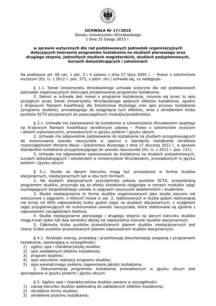 UCHWAŁA Nr 17/2015 Senatu Uniwersytetu Wrocławskiego z dnia 25 lutego 2015 r. w sprawie wytycznych dla rad podstawowych jednostek organizacyjnych dotyczących tworzenia programów kształcenia na studiach pierwszego oraz drugiego stopnia, jednolitych studiach magisterskich, studiach podyplomowych, kursach dokształcających i szkoleniach Na podstawie art. 68 ust. 1 pkt. 2 i 4 ustawy z dnia 27 lipca 2005 r. – Prawo o szkolnictwie wyższym (Dz. U. z 2012 r. poz. 572, z późn. zm.) uchwala się, co następuje: § 1.1. Senat Uniwersytetu Wrocławskiego uchwala wytyczne dla rad podstawowych jednostek organizacyjnych dotyczące projektowania programów kształcenia. 2. Ilekroć w uchwale jest mowa o programie kształcenia, rozumie się przez to opis przyjętych przez Senat Uniwersytetu Wrocławskiego spójnych efektów kształcenia, zgodny z Krajowymi Ramami Kwalifikacji dla Szkolnictwa Wyższego oraz opis procesu kształcenia (programu studiów), prowadzącego do osiągnięcia tych efektów, wraz z określeniem liczby punktów ECTS przypisanych do poszczególnych modułów/przedmiotów. § 2.1. Uchwała ma zastosowanie do kształcenia w Uniwersytecie Wrocławskim opartego na Krajowych Ramach Kwalifikacji określonych ustawą – Prawo o szkolnictwie wyższym i aktami wykonawczymi, prowadzonych w języku polskim i języku obcym. 2. Uchwała ma odpowiednie zastosowanie do kształcenia na studiach przygotowujących do wykonywania zawodu nauczyciela w oparciu o standardy kształcenia określone rozporządzeniem Ministra Nauki i Szkolnictwa Wyższego z dnia 17 stycznia 2012 r. w sprawie standardów kształcenia przygotowującego do zawodu nauczyciela (Dz. U. z 2012 r. poz. 131). 3. Uchwała ma odpowiednie zastosowanie do kształcenia na studiach podyplomowych, kursach dokształcających i szkoleniach w Uniwersytecie Wrocławskim, prowadzonych w języku polskim i języku obcym. § 3.1. Studia na danym kierunku mogą być prowadzone w formie studiów stacjonarnych, niestacjonarnych lub w obu tych formach. 2. Na studiach stacjonarnych przynajmniej połowę punktów ECTS, przewidzianą programem studiów, przyznaje się za efekty kształcenia osiągnięte w ramach modułów zajęć wymagających bezpośredniego udziału w zajęciach nauczycieli akademickich i studentów. 3. Studia niestacjonarne to forma studiów organizowanych jako studia zaoczne lub wieczorowe z zajęciami, o których mowa w ust. 2, realizowanych w liczbie godzin stanowiącej nie mniej niż 60% odpowiedniej liczby godzin zajęć na studiach stacjonarnych, z wyjątkiem zajęć przygotowujących do wykonywania zawodu nauczyciela, które realizowane są zgodnie z odpowiednim zarządzeniem Rektora. 4. Studia niestacjonarne pierwszego i drugiego stopnia na danym kierunku studiów mogą trwać jeden lub dwa semestry dłużej niż odpowiednie kierunki studiów stacjonarnych. 5. Całkowita liczba punktów przewidzianych planem studiów niestacjonarnych jest równa liczbie punktów przewidzianych planem odpowiednich studiów stacjonarnych. § 4.1. Wydziały tworzą, prowadzą i przechowują dokumentację związaną z programami kształcenia, zawierającą w szczególności: 1) ogólny opis i charakterystykę studiów; 2) opis zakładanych efektów kształcenia; 3) program studiów; 4) opis warunków realizacji programu studiów; 5) opis wewnętrznego systemu zapewniania jakości kształcenia. 2. Dokumentacja programów kształcenia prowadzonych w języku obcym jest sporządzana w języku polskim i języku obcym. 1) 2) 3) § 5. Ogólny opis i charakterystyka studiów zawiera w szczególności: nazwę kierunku studiów adekwatną do zakładanych efektów kształcenia; określenie formy studiów; określenie poziomu kształcenia; 4) 5) 6) 7) 8) 9) określenie profilu kształcenia; przyporządkowanie kierunku studiów do właściwego obszaru kształcenia i wskazanie dziedzin nauki lub sztuki i dyscyplin naukowych lub artystycznych, do których odnoszą się efekty kształcenia; opis oczekiwanych kompetencji kandydata na studia; określenie zasad rekrutacji; wskazanie tytułu zawodowego uzyskiwanego przez absolwenta i uprawnienia zawodowe, ogólne cele kształcenia oraz typowe miejsca pracy absolwentów; możliwości kontynuacji kształcenia; § 6. Opisy zakładanych efektów kształcenia dla określonych kierunków studiów wydziały opracowują z uwzględnieniem następujących zasad: 1) opis zakładanych efektów kształcenia odnosi się do określonego poziomu kształcenia i profilu kształcenia; 2) opis zakładanych efektów kształcenia uwzględnia efekty wybrane z efektów kształcenia dla obszaru lub obszarów kształcenia, do których należy kierunek studiów; 3) opis zakładanych efektów kształcenia przedstawia się w formie tabeli odniesień efektów kierunkowych do efektów obszarowych, a także w formie tabeli przedstawiającej pokrycie efektów obszarowych przez zakładane efekty kierunkowe, wraz z krótkim uzasadnieniem ewentualnego pominięcia efektów obszarowych; 4) na studiach stacjonarnych i niestacjonarnych obowiązują identyczne opisy zakładanych efektów kształcenia. § 7.1. Opis programu studiów określa w szczególności: liczbę punktów ECTS niezbędną dla uzyskania kwalifikacji (tytułu zawodowego, świadectwa ukończenia studiów podyplomowych); 2) liczbę punktów ECTS, wymiar i zasady odbywania praktyk oraz efekty kształcenia, które student powinien osiągnąć po odbyciu praktyk - jeśli program je przewiduje; 3) macierz efektów kształcenia wiążącą zakładane dla kierunku efekty kształcenia z modułami zajęć (zajęcia lub grupy zajęć), w których efekty te są osiągane; 4) plan studiów (z zaznaczeniem modułów zajęć obowiązkowych i podlegających wyborowi studenta) - z zachowaniem zasady, że program umożliwia studentowi wybór modułów zajęć w wymiarze nie mniejszym niż 30% liczby punktów ECTS, o których mowa w pkt 1; 5) zajęcia ogólnouczelniane (lektoraty, zajęcia z wycho