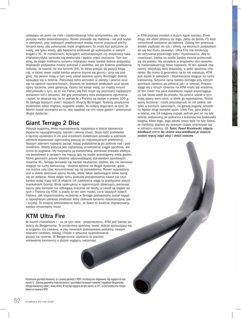 odstający od ziemi na metr i siedemdziesiąt kilka centymetrów, jak i tacy powyżej metra osiemdziesięciu. Rower prowadzi się stabilnie i nie jest szybki w zakrętach, przy większych prędkościach trzeba mocno pracować pochyleniami ramy, aby pokonywać kręte singletracki. To może być policzone za wadę, ale tylko wtedy, gdy będziemy próbowali go wykorzystać w ostrym ściganiu XC. W maratonach, wyścigach wieloetapowych czy eksploracji taka charakterystyka sprawdzi się doskonale i będzie wręcz pomocna. Tym bardziej, że dzięki krótkiemu tylnemu trójkątowi rower bardzo dobrze podjeżdża. Większość podjazdów można pokonać z siodełka, ale jak braknie przełożenia (szkoda, że kaseta nie ma koronki 34), to łatwo przejść do pozycji stojącej, w której rower nadal bardzo pewnie trzyma się gruntu i pnie się pod górę. Na pewno mają w tym swój udział szerokie opony Bontrager dobrze spisujące się w terenie. Pozwalają ostro wchodzić w zakręty i pewnie czuć się na sypkich nawierzchniach. Dopiero na twardych podłożach czuć spore opory toczenia, jakie generują. Opony też swoje ważą, co między innymi zdecydowało o tym, że to nie Fisher, ale Felt może się pochwalić najlżejszym zestawem kół z tarczami. Ale gdy porównamy koła pozbawione ogumienia i kaset, to okazuje się, że to jednak te z Fishera są lżejsze o prawie 100 g. To zasługa lepszych piast i lżejszych obręczy Bontrager. Testerzy pozytywnie podkreślali także miękkie, wygodne siodło. To kolejny argument za tym, że Marlin został stworzony po to, aby spędzać na nim wiele godzin i pokonywać długie dystanse. Giant Terrago 2 Disc Pozycja wygodna, lekko wyprostowana, najszersza w teście kierownica zapewnia najwygodniejszy, szeroki i pewny chwyt. Duża ilość podkładek o łącznej wysokości 4 cm pod mostkiem dodatkowo pozwala w szerokim zakresie dopasować zajmowaną pozycję do indywidualnych preferencji. Naszym zdaniem najlepiej zacząć mając podzielone je po połowie nad i pod mostkiem. Wtedy pozycja jest najbardziej uniwersalna: ciągle sportowa, ale mimo to wygodna. My nazywamy ją maratońską, ponieważ pozwala efektywnie pedałować a zarazem nie męczy, gdy na siodle pozostajemy wiele godzin. Mimo geometrii prawie idealnie odpowiadającej standardom sportowych rowerów XC, Terrago prowadzi się bardzo neutralnie, szybko, ale nie nerwowo reaguje na ruchy kierownicą - idealna sprawa na długie dystanse, gdzie nie można cały czas koncentrować się na prowadzeniu. Rower wyposażony jest w dobre terenowe opony Kenda, które także zadziwiająco lekko toczą się po asfalcie. Może dzięki temu podczas przyspieszania nawet nie czuć bardzo dużej masy kół. A właśnie ich nadmierna waga to praktycznie jedyny mankament Gianta. Winę upatrujemy w tajemniczych obręczach, ponieważ opony jako komplet nie odbiegają znacznie od reszty, a nawet są lżejsze od tych z Fishera czy KTM. a piasty to ten sam model, co w lżejszych kołach Fishera. Jak wspominaliśmy wcześniej w Terrago zastosowany został napęd o największym zakresie przełożeń który zadowoli zarówno maratończyka, jak i turystę. To kolejne potwierdzenie faktu, że Giant to świetnie dopracowany, bardzo uniwersalny rower. KTM Ultra Fire W swoim charakterze i - co za tym idzie - przeznaczeniu, KTM jest bardzo podobny do Bergamonta. To ewidentnie sportowy rower, dobrze sprawiający się w ściganiu. Co ciekawe, w obu rowerach zastosowano podobny, naszym zdaniem niedobry, zabieg. Chodzi o sztuczne wyprostowanie pozycji na rowerze. W Bergamoncie uzyskano to poprzez wstawienie kierownicy o dużym wygięciu natomiast Porównanie geometrii kierownic, ta z prawej pochodzi z KTM i ma klasyczne ukątowanie. Kąt wygięcia do tyłu wynosi 5°. Zbliżoną geometrię miały kierownice z pozostałych testowych rowerów z wyjątkiem Bergamonta, którego kierownicę widać z lewej strony. W niej kąt wygięcia do tyłu wynosi aż 20°, co jest praktycznie niespotykane w rowerach MTB 52 bi k eB oar d #5 maj 2008 w KTM poprzez mostek o dużym kącie wznosu. Dwie drogi, ale efekt zbliżony do tego, jakby do bolidu F1 ktoś wmontował siedzenie od traktora. Zabieg ten przesuwa środek ciężkości do tyłu i efekty na stromych podjazdach da się bez trudu zauważyć. Ultra Fire ma tendencję do odrywania przedniego koła i myszkowania. Aby to niwelować, trzeba na siodle bardzo mocno przesuwać się do przodu. Na szczęście w przypadku obu rowerów tę niekonsekwencję łatwo naprawić. W ten sposób oba rowery odzyskają swój drapieżny, w pełni sportowy charakter. Bo mimo iż geometria na to nie wskazuje, KTM jest szybki w zakrętach i błyskawicznie reaguje na ruchy kierownicą. Sztywna rama bardzo pomaga przy ostrych sprintach zarówno po asfalcie jak i w terenie. Przesiadając się z innych rowerów na KTM miało się wrażenie, że ten rower ma jakiś dodatkowy napęd wspomagający, tak łatwo szedł do przodu. Na pewno udział w tym mają opony semi-slick, w które go wyposażono. Niskie opory toczenia i niezła przyczepność to ich zaleta, ale tylko w suchych warunkach, na gorszą pogodę potrzebny będzie drugi komplet opon. Ultra Fire, jako jedyny w teście, ma 24-biegowy napęd, jednak jest on na tyle dobrze zestawiony, że żadnemu z testerów nie brakowało biegów. Mało tego, jego jakość pracy była na tyle dobra, że niektórzy dopiero po pewnym czasie orientowali się Tekst: Paweł Kisielewski, zdjęcia: w istnieniu różnicy. bikeBoard Na stronie www.bikeBoard.pl możecie znaleźć więcej zdjęć akcji i detali rowerów.