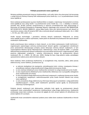 Polityka prywatności www.cppfakt.pl Niniejsza polityka prywatności dotyczy Użytkowników, czyli osób, które chcą skorzystać lub korzystają z usług Centrum Pomocy Prawnej Fakt realizowanych przez Availo Sp. z o.o. za pośrednictwem strony www.cppfakt.pl Dane osobowe przekazywane są przez Użytkowników w związku z rejestracją i korzystaniem ze strony www.cppfakt.pl oraz usług Availo i są przetwarzane przez Availo Sp. z o.o. z siedzibą w Jasionce, Jasionka 954, 36-002 Jasionka zarejestrowaną w rejestrze przedsiębiorców Sądu Rejonowego w Rzeszowie XII Wydział Gospodarczy Krajowego Rejestru Sądowego pod numerem KRS 0000416198, NIP 8133671973, REGON 18083121, zwaną dalej Availo, która jest administratorem tych danych w rozumieniu ustawy z dnia 29 sierpnia 1997 roku o ochronie danych osobowych (tekst jedn.: Dz. U. 2002 r., Nr 101, poz. 926 z późn. zm.). Availo stosuje technologie i procedury ochrony danych osobowych. Połączenie ze stroną www.cppfakt.pl jest w całości szyfrowane, nawet jeżeli nie dochodzi do przekazania lub użycia danych osobowych Użytkownika. Availo przechowuje dane osobowe w bazie danych, co do której zastosowano środki techniczne i organizacyjne zapewniające ochronę przetwarzanych danych zgodne z wymaganiami określonymi przez powszechnie obowiązujące przepisy prawa dotyczące ochrony danych osobowych, w tym rozporządzenie Ministra Spraw Wewnętrznych i Administracji z dnia 29 kwietnia 2004 r. w sprawie dokumentacji przetwarzania danych osobowych oraz warunków technicznych i organizacyjnych, jakim powinny odpowiadać urządzenia i systemy informatyczne służące do przetwarzania danych osobowych (Dz. U. z 2004r., Nr 100, poz. 1024). Dostęp do bazy mają jedynie osoby, posiadające upoważnienia nadane przez administratora danych. Dane osobowe, które przekazują Użytkownicy, w szczególności imię, nazwisko, adres, adres poczty elektronicznej, numer telefonu, przetwarzane są: w zakresie niezbędnym do nawiązania, ukształtowania treści, zmiany, rozwiązania Umowy i prawidłowej realizacji usług świadczonych drogą elektroniczną przez Availo w celu realizacji składanych przez Użytkownika zamówień na usługi świadczone przez Availo w celu rozpatrywania składanych przez Użytkownika reklamacji oraz w przypadku odstąpienia przez Użytkownika od umowy w celu przesyłania drogą elektroniczną informacji związanych z realizacją Umowy przez Availo, w szczególności związanych z administrowaniem przez Availo Kontem Klienta oraz stroną www.cppfakt.pl w celu przesyłania drogą elektroniczną informacji dotyczących produktów i usług podmiotów współpracujących z Availo, jeżeli Użytkownik uprzednio wyrazi zgodę na otrzymywanie informacji marketingowych. Podanie danych osobowych jest dobrowolne, jednakże brak zgody na przetwarzanie danych osobowych może uniemożliwić świadczenie Użytkownikowi usług drogą elektroniczną. Użytkownik przekazując swoje dane osobowe, ma prawo do wglądu do nich, prawo żądania ich aktualizacji oraz prawo żądania ich usunięcia. Użytkownik może samodzielnie edytować podane przez siebie dane osobowe Użytkownika w Koncie Klienta Użytkownik może zwrócić się do Availo z żądaniem usunięcia całego Konta Klienta poprzez wysłanie stosownej prośby na adres e-mail: [email protected]. Availo zastrzega sobie prawo do wystąpienia o potwierdzenie żądania usunięcia Konta Klienta przez Użytkownika. Usunięcie Konta Klienta uniemożliwia świadczenie usługi Użytkownikowi. Availo Sp. z o.o. zapewnia bezpieczeństwo danych osobowych dzięki odpowiednim środkom technicznym oraz organizacyjnym, mającym na celu zapobieganie bezprawnemu przetwarzaniu danych oraz ich przypadkowej utracie, zniszczeniu oraz uszkodzeniu. Availo dokłada szczególnej staranności, żeby dane osobowe były: przetwarzane w sposób zgodny z prawem, uzyskane tylko dla określonych celów i nieprzetwarzane dalej w sposób niezgodny z tymi celami, adekwatne, odpowiednie i nie nadmiarowe, dokładne i aktualne, nieprzechowywane dłużej niż to konieczne, przetwarzane zgodnie z prawami przysługującymi osobom, których dotyczą, w tym zgodnie z prawem do zastrzeżenia udostępniania, bezpiecznie przechowywane, Polityka cookies www.cppfakt.pl Podczas korzystania przez Użytkownika ze strony www.cppfakt.pl, na urządzeniu Użytkownika zapisywane są niewielkie pliki zawierające informacje niezbędne do prawidłowego korzystania ze strony www.cppfakt.pl, tzw. pliki cookie. Dzięki zapisaniu tych plików na urządzeniu Użytkownika możliwe jest m. in. zapamiętanie danych logowania, zapamiętanie usług, które Użytkownik chce zakupić, itp. Dzięki plikom cookie możliwe jest zbieranie danych statystycznych, które umożliwiają rozwój strony www.cppfakt.pl zgodnie z preferencjami Użytkowników.Na podstawie plików cookie zapisywanych na urządzeniu Użytkownika w trakcie wizyty na stronie www.cppfakt.pl nie można ustalić danych identyfikujących Użytkownika. Pliki cookie nie są szkodliwe dla urządzenia, nie zmieniają ustawień urządzenia ani ustawień zainstalowanego na nim oprogramowania. Odczytanie zawartości tych plików możliwe jest jedynie przez serwer, który je utworzył, co znaczy, że ich treść może zostać wykorzystana tylko i wyłącznie przez stronę www.cppfakt.pl Przeglądarki internetowe, takie jak Internet Explorer, Mozilla Firefox, Google Chrome, Apple Safari i inne, domyślnie dopuszczają zapisywanie plików cookie na urządzeniu Użytkownika. Jeżeli Użytkownik nie zgadza się na zapisywanie plików na swoim urządzeniu, powinien odpowiednio zmienić ustawienia swojej przeglądarki internetowej. Przeglądarki internetowe co do zasady oferują następujące opcje: niezapisywania plików cookie na urządzeniu, każdorazowego informowania o zapisaniu pliku cookie na urządzeniu, zapisywania plików cookie jedynie z wybranych stron internetowych, zapisywania plików cookie