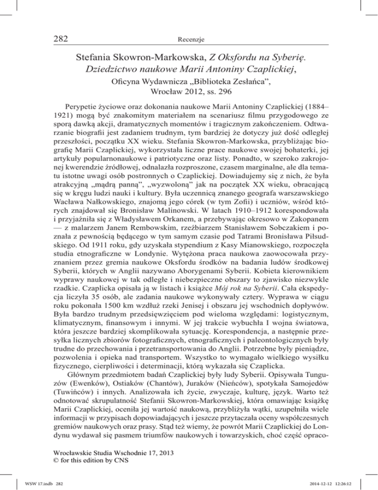 282 Recenzje Stefania Skowron-Markowska, Z Oksfordu na Syberię. Dziedzictwo naukowe Marii Antoniny Czaplickiej, Oficyna Wydawnicza „Biblioteka Zesłańca”, Wrocław 2012, ss. 296 Perypetie życiowe oraz dokonania naukowe Marii Antoniny Czaplickiej (1884– 1921) mogą być znakomitym materiałem na scenariusz filmu przygodowego ze sporą dawką akcji, dramatycznych momentów i tragicznym zakończeniem. Odtwarzanie biografii jest zadaniem trudnym, tym bardziej że dotyczy już dość odległej przeszłości, początku XX wieku. Stefania Skowron-Markowska, przybliżając biografię Marii Czaplickiej, wykorzystała liczne prace naukowe swojej bohaterki, jej artykuły popularnonaukowe i patriotyczne oraz listy. Ponadto, w szeroko zakrojonej kwerendzie źródłowej, odnalazła rozproszone, czasem marginalne, ale dla tematu istotne uwagi osób postronnych o Czaplickiej. Dowiadujemy się z nich, że była atrakcyjną „mądrą panną”, „wyzwoloną” jak na początek XX wieku, obracającą się w kręgu ludzi nauki i kultury. Była uczennicą znanego geografa warszawskiego Wacława Nałkowskiego, znajomą jego córek (w tym Zofii) i uczniów, wśród których znajdował się Bronisław Malinowski. W latach 1910–1912 korespondowała i przyjaźniła się z Władysławem Orkanem, a przebywając okresowo w Zakopanem — z malarzem Janem Rembowskim, rzeźbiarzem Stanisławem Sobczakiem i poznała z pewnością będącego w tym samym czasie pod Tatrami Bronisława Piłsudskiego. Od 1911 roku, gdy uzyskała stypendium z Kasy Mianowskiego, rozpoczęła studia etnograficzne w Londynie. Wytężona praca naukowa zaowocowała przyznaniem przez gremia naukowe Oksfordu środków na badania ludów środkowej Syberii, których w Anglii nazywano Aborygenami Syberii. Kobieta kierownikiem wyprawy naukowej w tak odległe i niebezpieczne obszary to zjawisko niezwykle rzadkie. Czaplicka opisała ją w listach i książce Mój rok na Syberii. Cała ekspedycja liczyła 35 osób, ale zadania naukowe wykonywały cztery. Wyprawa w ciągu roku pokonała 1500 km wzdłuż rzeki Jenisej i obszaru jej wschodnich dopływów. Była bardzo trudnym przedsięwzięciem pod wieloma względami: logistycznym, klimatycznym, finansowym i innymi. W jej trakcie wybuchła I wojna światowa, która jeszcze bardziej skomplikowała sytuację. Korespondencja, a następnie przesyłka licznych zbiorów fotograficznych, etnograficznych i paleontologicznych były trudne do przechowania i przetransportowania do Anglii. Potrzebne były pieniądze, pozwolenia i opieka nad transportem. Wszystko to wymagało wielkiego wysiłku fizycznego, cierpliwości i determinacji, którą wykazała się Czaplicka. Głównym przedmiotem badań Czaplickiej były ludy Syberii. Opisywała Tunguzów (Ewenków), Ostiaków (Chantów), Juraków (Nieńców), spotykała Samojedów (Tuwińców) i innych. Analizowała ich życie, zwyczaje, kulturę, język. Warto też odnotować skrupulatność Stefanii Skowron-Markowskiej, która omawiając książkę Marii Czaplickiej, oceniła jej wartość naukową, przybliżyła wątki, uzupełniła wiele informacji w przypisach dopowiadających i jeszcze przytaczała oceny współczesnych gremiów naukowych oraz prasy. Stąd też wiemy, że powrót Marii Czaplickiej do Londynu wydawał się pasmem triumfów naukowych i towarzyskich, choć część opracoWrocławskie Studia Wschodnie 17, 2013 © for this edition by CNS WSW 17.indb 282 2014-12-12 12:26:12 Recenzje 283 wanych badań zaginęła po drodze. Po roku Czaplicka wydała książkę o tej wyprawie. Ukazały się również liczne artykuły. Występowała z odczytami w Anglii i Szkocji, próbując zarobić na spłatę kredytów, zaciągniętych na wyprawę. Angażowała się też bardzo w wyjaśnianie sprawy polskiej u schyłku wojny i w 1919 roku. Jednocześnie wciąż poszukiwała stałego zatrudnienia, a nie mogąc znaleźć go w Anglii, odbyła w 1920 roku podróż po polskich uczelniach. Mimo znacznego naukowego, publicystycznego, patriotycznego i — jak pisze autorka książki — dorobku najwyższej jakości „żaden z uniwersytetów nie zdecydował się jej zatrudnić”. Na jesieni 1920 roku wróciła do Anglii, do Bristolu, gdzie otwierały się mgliste możliwości stałej pracy. Konkurs na stanowisko akademickie wygrała jednak Angielka, May Stavelay, znajoma Marii z o wiele mniejszym dorobkiem naukowym. Wśród licznych przyczyn samobójczej śmierci Marii Czaplickiej w maju 1921 roku wymieniła autorka kłopoty finansowe, przemęczenie, przegraną w konkursie na stanowisko uniwersyteckie, a także zawód miłosny. Nie wskazała jednak na szalone trudności cudzoziemki i kobiety podziwianej, ale przez wielu traktowanej też z drwiną i bezdusznością, obojętnością i wyższością charakterystyczną dla wyspiarzy. Samobójstwo było próbą ratowania honoru czy też „samozachowania” pamięci naukowej, jak napisała Joanna Tokarska-Bahin („Wysokie Obcasy” 31.01.2003 r.). Zasadnicza i najobszerniejsza część pracy Stefanii Skowron-Markowskiej jest biografią obejmującą 139 stron. Choć biografia z pewnością nie jest pełna, to znakomite wrażenie robi zgromadzenie tak licznych i tak bardzo rozproszonych materiałów, które ją umożliwiły. Jednakże o wartości naukowej badań Marii Czaplickiej świadczą jej prace naukowe, które w kolejnej części książki zostały przeanalizowane i opatrzone komentarzem. To jest pionierskie dzieło w zakresie historii etnologii, świadczące o wielkiej erudycji i pracowitości Autorki książki. Odwołania do ówczesnej i obecnej literatury naukowej i komentarze własne pozwalają uznać i tę część pracy za poważne osiągnięcie naukowe. Perspektywę historyczną autorka umiejętnie w narracji połączyła ze współczesnymi ocenami dziedzictwa naukowego polskiej badaczki. Ten zabieg pokazał jego wyjątkową wartość, predestynując Marię Czaplicką do grona najwybitniejszych polskich uczonych. 
