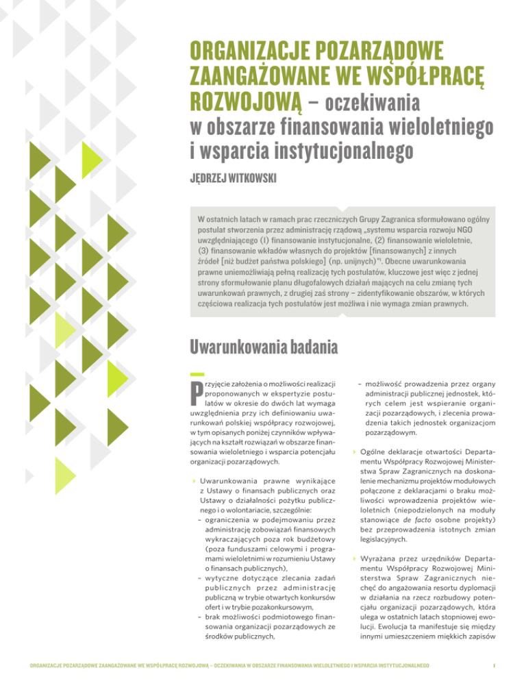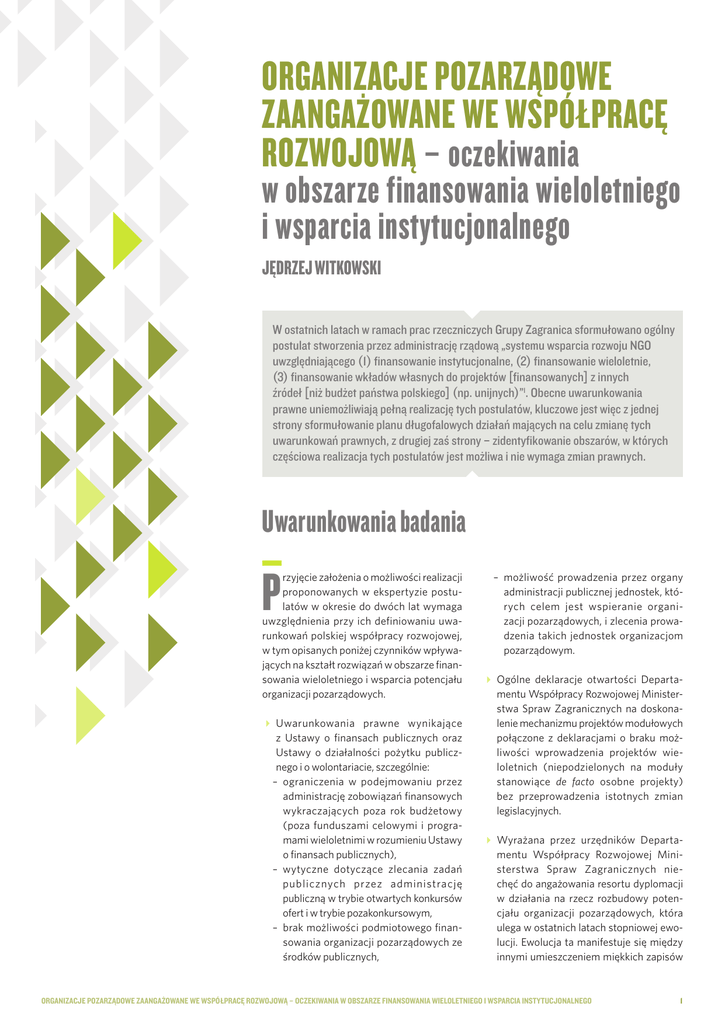 ORGANIZACJE POZARZĄDOWE ZAANGAŻOWANE WE WSPÓŁPRACĘ ROZWOJOWĄ – oczekiwania w obszarze finansowania wieloletniego i wsparcia instytucjonalnego JĘDRZEJ WITKOWSKI W ostatnich latach w ramach prac rzeczniczych Grupy Zagranica sformułowano ogólny postulat stworzenia przez administrację rządową „systemu wsparcia rozwoju NGO uwzględniającego (1) finansowanie instytucjonalne, (2) finansowanie wieloletnie, (3) finansowanie wkładów własnych do projektów [finansowanych] z innych źródeł [niż budżet państwa polskiego] (np. unijnych)”1. Obecne uwarunkowania prawne uniemożliwiają pełną realizację tych postulatów, kluczowe jest więc z jednej strony sformułowanie planu długofalowych działań mających na celu zmianę tych uwarunkowań prawnych, z drugiej zaś strony – zidentyfikowanie obszarów, w których częściowa realizacja tych postulatów jest możliwa i nie wymaga zmian prawnych. Uwarunkowania badania P rzyjęcie założenia o możliwości realizacji proponowanych w ekspertyzie postulatów w okresie do dwóch lat wymaga uwzględnienia przy ich definiowaniu uwarunkowań polskiej współpracy rozwojowej, w tym opisanych poniżej czynników wpływających na kształt rozwiązań w obszarze finansowania wieloletniego i wsparcia potencjału organizacji pozarządowych. Uwarunkowania prawne wynikające z Ustawy o finansach publicznych oraz Ustawy o działalności pożytku publicznego i o wolontariacie, szczególnie: – o graniczenia w podejmowaniu przez administrację zobowiązań finansowych wykraczających poza rok budżetowy (poza funduszami celowymi i programami wieloletnimi w rozumieniu Ustawy o finansach publicznych), – w ytyczne dotyczące zlecania zadań publicznych przez administrację publiczną w trybie otwartych konkursów ofert i w trybie pozakonkursowym, – brak możliwości podmiotowego finansowania organizacji pozarządowych ze środków publicznych, – możliwość prowadzenia przez organy administracji publicznej jednostek, których celem jest wspieranie organizacji pozarządowych, i zlecenia prowadzenia takich jednostek organizacjom pozarządowym. Ogólne deklaracje otwartości Departamentu Współpracy Rozwojowej Ministerstwa Spraw Zagranicznych na doskonalenie mechanizmu projektów modułowych połączone z deklaracjami o braku możliwości wprowadzenia projektów wieloletnich (niepodzielonych na moduły stanowiące de facto osobne projekty) bez przeprowadzenia istotnych zmian legislacyjnych. Wyrażana przez urzędników Departamentu Współpracy Rozwojowej Ministerstwa Spraw Zagranicznych niechęć do angażowania resortu dyplomacji w działania na rzecz rozbudowy potencjału organizacji pozarządowych, która ulega w ostatnich latach stopniowej ewolucji. Ewolucja ta manifestuje się między innymi umieszczeniem miękkich zapisów ORGANIZACJE POZARZĄDOWE ZAANGAŻOWANE WE WSPÓŁPRACĘ ROZWOJOWĄ – OCZEKIWANIA W OBSZARZE FINANSOWANIA WIELOLETNIEGO I WSPARCIA INSTYTUCJONALNEGO1 ORGANIZACJE POZARZĄDOWE dotyczących wspierania organizacji pozarządowych w Wieloletnim Programie Współpracy Rozwojowej na lata 2016–2020 oraz Programie współpracy Ministra Spraw Zagranicznych z organizacjami pozarządowymi i innymi podmiotami wymienionymi w art. 3 ust. 3 Ustawy o działalności pożytku publicznego i o wolontariacie na lata 2016– –2017 (por. ramka poniżej). WIELOLETNI PROGRAM WSPÓŁPRACY ROZWOJOWEJ NA LATA 2016–2020 zawiera ogólny zapis: „Konstrukcja systemu polskiej współpracy rozwojowej, w tym w szczególności tryb dystrybuowania środków publicznych na inicjatywy pomocowe, sprzyja podnoszeniu efektywności realizowanych projektów, a pośrednio służy wzmacnianiu potencjału partnerów polskiej współpracy rozwojowej. W ramach Wieloletniego Programu Współpracy Rozwojowej na lata 2016–2020 podjęte zostaną działania zmierzające do budowania potencjału organizacji pozarządowych, a także organizowane będą szkolenia i doradztwo dla podmiotów uczestniczących w realizowaniu współpracy rozwojowej”. Przyjęty w czerwcu 2016 roku Program współpracy Ministra Spraw Zagranicznych z organizacjami pozarządowymi i innymi podmiotami wymienionymi w art. 3 ust. 3 Ustawy o działalności pożytku publicznego i o wolontariacie na lata 2016–2017 powtarza zapis Wieloletniego Programu Współpracy Rozwojowej na lata 2016–2020, wymieniając „organizowanie szkoleń i doradztwa dla podmiotów uczestniczących w realizowaniu współpracy rozwojowej” jako jedną z form współpracy z organizacjami pozarządowymi aktywnymi w obszarze współpracy rozwojowej. Metodologia gromadzenia danych Ekspertyza powstała na podstawie danych zastanych i wywołanych. W pierwszej kolejności analizie desk research poddano oficjalne stanowiska Grupy Zagranica i korespondencję platformy z Ministerstwem Spraw Zagranicznych dotyczącą obszarów badania. W drugiej kolejności wykorzystano odpowiedzi nadesłane przez przedstawicieli organizacji pozarządowych za pośrednictwem ankiety internetowej. Ankieta była podzielona na trzy bloki pytań. Pierwszy dotyczył finansowania wieloletniego: ankietowani kolejno odpowiadali w nim na pytania o optymalne, ich zdaniem, warunki finansowania wieloletniego, uwarunkowania obecnych projektów modułowych, które w największym stopniu utrudniają realizację projektu, i o ocenę użyteczności wybranych rozwiązań opisanych przez autora ankiety. W drugim bloku analogicznie pytano o oczekiwane sposoby wspierania potencjału organizacji przez Ministerstwo Spraw Zagranicznych, obecne uwarunkowania, które najbardziej utrudniają ten proces, ocenę wybranych rozwiązań w tym obszarze, dodatkowo zaś o to, kto powinien prowadzić takie działania. Ostatni blok pytań dotyczył samej organizacji i zakresu jej współpracy z Ministerstwem Spraw Zagranicznych. Treść ankiety stanowi załącznik A. Uzupełniającym źródłem danych były wcześniejsze badania jakościowe prowadzone przez autora eksp