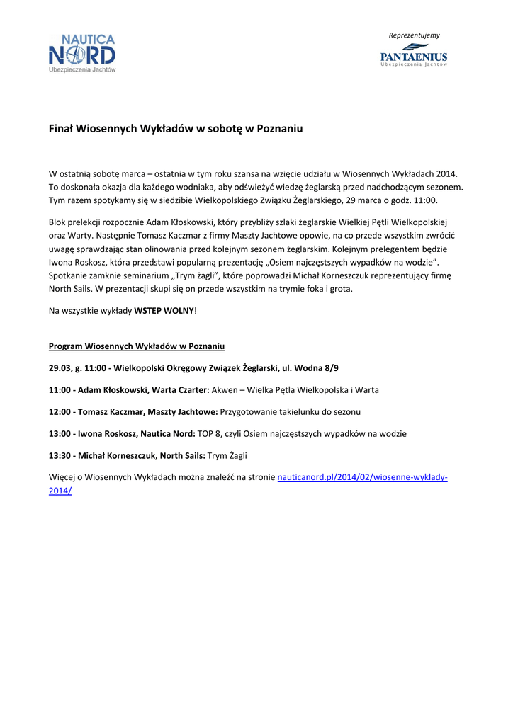 Reprezentujemy Finał Wiosennych Wykładów w sobotę w Poznaniu W ostatnią sobotę marca – ostatnia w tym roku szansa na wzięcie udziału w Wiosennych Wykładach 2014. To doskonała okazja dla każdego wodniaka, aby odświeżyć wiedzę żeglarską przed nadchodzącym sezonem. Tym razem spotykamy się w siedzibie Wielkopolskiego Związku Żeglarskiego, 29 marca o godz. 11:00. Blok prelekcji rozpocznie Adam Kłoskowski, który przybliży szlaki żeglarskie Wielkiej Pętli Wielkopolskiej oraz Warty. Następnie Tomasz Kaczmar z firmy Maszty Jachtowe opowie, na co przede wszystkim zwrócić uwagę sprawdzając stan olinowania przed kolejnym sezonem żeglarskim. Kolejnym prelegentem będzie Iwona Roskosz, która przedstawi popularną prezentację „Osiem najczęstszych wypadków na wodzie”. Spotkanie zamknie seminarium „Trym żagli”, które poprowadzi Michał Korneszczuk reprezentujący firmę North Sails. W prezentacji skupi się on przede wszystkim na trymie foka i grota. Na wszystkie wykłady WSTEP WOLNY! Program Wiosennych Wykładów w Poznaniu 29.03, g. 11:00 - Wielkopolski Okręgowy Związek Żeglarski, ul. Wodna 8/9 11:00 - Adam Kłoskowski, Warta Czarter: Akwen – Wielka Pętla Wielkopolska i Warta 12:00 - Tomasz Kaczmar, Maszty Jachtowe: Przygotowanie takielunku do sezonu 13:00 - Iwona Roskosz, Nautica Nord: TOP 8, czyli Osiem najczęstszych wypadków na wodzie 13:30 - Michał Korneszczuk, North Sails: Trym Żagli Więcej o Wiosennych Wykładach można znaleźć na stronie nauticanord.pl/2014/02/wiosenne-wyklady2014/