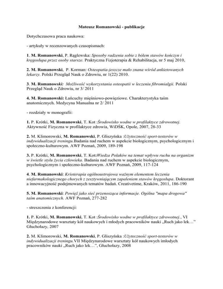 Mateusz Romanowski - publikacje Dotychczasowa praca naukowa: - artykuły w recenzowanych czasopismach: 1. M. Romanowski, P. Rąglewska: Sposoby radzenia sobie z bólem stawów kończyn i kręgosłupa przez osoby starsze. Praktyczna Fizjoterapia & Rehabilitacja, nr 5 maj 2010, 2. M. Romanowski, P. Korman: Osteopatia-jeszcze mało znana wśród ankietowanych lekarzy. Polski Przegląd Nauk o Zdrowiu, nr 1(22) 2010. 3. M. Romanowski: Możliwość wykorzystania osteopatii w leczeniu fibromialgii. Polski Przegląd Nauk o Zdrowiu, nr 3/ 2011 4. M. Romanowski: Łańcuchy mięśniowo-powięziowe. Charakterystyka taśm anatomicznych. Medycyna Manualna nr 2/ 2011 - rozdziały w monografii: 1. P. Krótki, M. Romanowski, T. Kot :Środowisko wodne w profilaktyce zdrowotnej. Aktywność Fizyczna w profilaktyce zdrowia, WiDŚK, Opole, 2007, 28-33 2. M. Klimorowski, M. Romanowski, P. Gliszyńska :Użyteczność sport-testerów w indywidualizacji treningu.Badania nad ruchem w aspekcie biologicznym, psychologicznym i społeczno-kulturowym. AWF Poznań, 2009, 189-198 3. P. Krótki, M. Romanowski, T. Kot:Wiedza Polaków na temat wpływu ruchu na organizm w świetle stylu życia człowieka. Badania nad ruchem w aspekcie biologicznym, psychologicznym i społeczno-kulturowym. AWF Poznań, 2009, 117-124 4. M. Romanowski: Krioterapia ogólnoustrojowa ważnym elementem leczenia niefarmakologicznego chorych z zesztywniającym zapaleniem stawów kręgosłupa. Doktorant a innowacyjność podejmowanych tematów badań. Creativetime, Kraków, 2011, 186-190 5. M. Romanowski: Powięź jako sieć przenosząca informacje. Ogólna "mapa drogowa" taśm anatomicznych. AWF Poznań, 277-282 - streszczenia z konferencji: 1. P. Krótki, M. Romanowski, T. Kot :Środowisko wodne w profilaktyce zdrowotnej., VI Międzynarodowe warsztaty kół naukowych i młodych pracowników nauki „Ruch jako lek…” Głuchołazy, 2007 2. M. Klimorowski, M. Romanowski, P. Gliszyńska :Użyteczność sport-testerów w indywidualizacji treningu.VII Międzynarodowe warsztaty kół naukowych imłodych pracowników nauki „Ruch jako lek…”, Głuchołazy, 2008 3. P. Krótki, M. Romanowski, T. Kot:Wiedza Polaków na temat wpływu ruchu na organizm w świetle stylu życia człowieka. II Festiwal Nauki i Kultury Studenckiej AWF Poznań FENIKS, 2008 4. M. Romanowski, P. Rąglewska: Sposoby radzenia sobie z bólem stawów kończyn i kręgosłupa przez osoby starsze. II Wiosna z fizjoterapią, Warszawa, 2008 5. M. Romanowski, P. Korman: Osteopatia-jeszcze mało znana wśród ankietowanych lekarzy. Perspektywy rozwoju rehabilitacji w Polsce, Pabianice, 2009 6. M. Romanowski:Wpływ terapii manualnej na funkcję stawu kolanowego u chorych z reumatoidalnym zapaleniem stawów.Rola osteopatii i terapii manualnej w procesie rehabilitacji,Poznań, 2010 7. M. Romanowski: Wpływ terapii manualnej na odczuwanie bólu stawu kolanowego u chorych z reumatoidalnym zapaleniem stawów. XXVII Konferencja Naukowo-Szkoleniowa Ortopedów Wojska Polskiego,Szczyrk, 2010 8. M. Romanowski :Możliwość wykorzystania osteopatii w leczeniu fibriomialgii. VIII Międzynarodowe warsztaty kół naukowych i młodych pracowników nauki „Ruch jako lek…”,Głuchołazy, 2010 9. M. Romanowski: Wpływ terapii manualnej na funkcję stawu kolanowego u chorych z reumatoidalnym zapaleniem stawów. II Krajowe Spotkanie Reumatologiczne Sopot, 2010. 10. M. Romanowski: Wykorzystanie technik terapii manualnej w celu usprawnienia stawu kolanowego chorych z reumatoidalnym zapaleniem stawów.VII Ogólnopolska Konferencja Naukowa: „Perspektywy rozwoju rehabilitacji w Polsce”, Pabianiace, 2010 11. M. Romanowski: Powięź jako sieć przenosząca informacje. Ogólna „mapa drogowa” taśm anatomicznych.IV FENIKS:” Nowe idee w badaniach nad rehabilitacją”,Poznań, 2010. 12. M. Romanowski Wpływ masażu głębokiego na funkcję i odczuwanie bólu na przykładzie chorego z zesztywniającym zapaleniem stawów kręgosłupa(ZZSK) – opis przypadku. Międzynarodowy Dzień Inwalidy, XVII-Edycja, Zgorzelec 2011. 13. W. Romanowski , Z. Brenda, R. Lorenc, A. Straburzyńska-Lupa , M. Romanowski, Z. Świetlik: Wpływ wybranych zabiegów fizykoterapeutycznych na miejscowy stan zapalny u chorych z RZS. Międzynarodowy Dzień Inwalidy, XVII-Edycja, Zgorzelec 2011. 14. W. Romanowski , Z. Brenda, A. Straburzyńska-Lupa , M. Romanowski: Efekt przeciwbólowy wybranych zabiegów fizykalnych. XXI Zjazd Polskiego Towarzystwa Reumatologicznego, Mikołajki 2011 15. M. Romanowski: Wstępna ocena wpływu masażu głębokiego na funkcję i odczuwanie bólu chorych z zesztywniającym zapaleniem stawów kręgosłupa(ZZSK). II Krajowa Konferencja Naukowa Doktorantów Akademii Wychowania Fizycznego, Poznań 2011 16. M. Romanowski: Stabilizacja statyczna i dynamiczna barku w toku postępowania rehabilitacyjnego po jednokrotnym zwichnięciu przednim stawu ramiennego. Leczenie zachowawcze. Fizjoterapia Polska vol. 11 sup. 1, Łódź 2011 17. M. Romanowski: Osteopatia w uszkodzeniach pierścienia rotatorów. 6th international Poznań Course in Shoulder, Elbow and Wrist Surgery, Poznań 2012