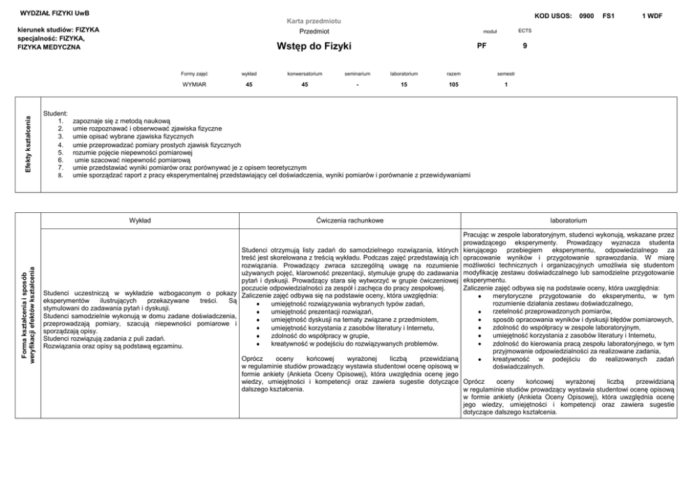 WYDZIAŁ FIZYKI UwB KOD USOS: Karta przedmiotu Efekty kształcenia kierunek studiów: FIZYKA specjalność: FIZYKA, FIZYKA MEDYCZNA Student: 1. 2. 3. 4. 5. 6. 7. 8. Wstęp do Fizyki PF 1 WDF 9 Formy zajęć wykład konwersatorium seminarium laboratorium razem semestr WYMIAR 45 45 - 15 105 1 zapoznaje się z metodą naukową umie rozpoznawać i obserwować zjawiska fizyczne umie opisać wybrane zjawiska fizycznych umie przeprowadzać pomiary prostych zjawisk fizycznych rozumie pojęcie niepewności pomiarowej umie szacować niepewność pomiarową umie przedstawiać wyniki pomiarów oraz porównywać je z opisem teoretycznym umie sporządzać raport z pracy eksperymentalnej przedstawiający cel doświadczenia, wyniki pomiarów i porównanie z przewidywaniami Wykład Forma kształcenia i sposób weryfikacji efektów kształcenia FS1 ECTS moduł Przedmiot 0900 Studenci uczestniczą w wykładzie wzbogaconym o pokazy eksperymentów ilustrujących przekazywane treści. Są stymulowani do zadawania pytań i dyskusji. Studenci samodzielnie wykonują w domu zadane doświadczenia, przeprowadzają pomiary, szacują niepewności pomiarowe i sporządzają opisy. Studenci rozwiązują zadania z puli zadań. Rozwiązania oraz opisy są podstawą egzaminu. Ćwiczenia rachunkowe Studenci otrzymują listy zadań do samodzielnego rozwiązania, których treść jest skorelowana z treścią wykładu. Podczas zajęć przedstawiają ich rozwiązania. Prowadzący zwraca szczególną uwagę na rozumienie używanych pojęć, klarowność prezentacji, stymuluje grupę do zadawania pytań i dyskusji. Prowadzący stara się wytworzyć w grupie ćwiczeniowej poczucie odpowiedzialności za zespół i zachęca do pracy zespołowej. Zaliczenie zajęć odbywa się na podstawie oceny, która uwzględnia: umiejętność rozwiązywania wybranych typów zadań, umiejętność prezentacji rozwiązań, umiejętność dyskusji na tematy związane z przedmiotem, umiejętność korzystania z zasobów literatury i Internetu, zdolność do współpracy w grupie, kreatywność w podejściu do rozwiązywanych problemów. laboratorium Pracując w zespole laboratoryjnym, studenci wykonują, wskazane przez prowadzącego eksperymenty. Prowadzący wyznacza studenta kierującego przebiegiem eksperymentu, odpowiedzialnego za opracowanie wyników i przygotowanie sprawozdania. W miarę możliwości technicznych i organizacyjnych umożliwia się studentom modyfikację zestawu doświadczalnego lub samodzielne przygotowanie eksperymentu. Zaliczenie zajęć odbywa się na podstawie oceny, która uwzględnia: merytoryczne przygotowanie do eksperymentu, w tym rozumienie działania zestawu doświadczalnego, rzetelność przeprowadzonych pomiarów, sposób opracowania wyników i dyskusji błędów pomiarowych, zdolność do współpracy w zespole laboratoryjnym, umiejętność korzystania z zasobów literatury i Internetu, zdolność do kierowania pracą zespołu laboratoryjnego, w tym przyjmowanie odpowiedzialności za realizowane zadania, kreatywność w podejściu do realizowanych zadań doświadczalnych. Oprócz oceny końcowej wyrażonej liczbą przewidzianą w regulaminie studiów prowadzący wystawia studentowi ocenę opisową w formie ankiety (Ankieta Oceny Opisowej), która uwzględnia ocenę jego wiedzy, umiejętności i kompetencji oraz zawiera sugestie dotyczące Oprócz oceny końcowej wyrażonej liczbą przewidzianą dalszego kształcenia. w regulaminie studiów prowadzący wystawia studentowi ocenę opisową w formie ankiety (Ankieta Oceny Opisowej), która uwzględnia ocenę jego wiedzy, umiejętności i kompetencji oraz zawiera sugestie dotyczące dalszego kształcenia. HARMONOGRAM ZAJĘĆ Semestr 1 Wykład Konwersatorium TREŚCI KSZTAŁCENIA Treści kształcenia dobrane są w celu zaprezentowania wybranych zjawisk i zasad w fizyce, pokazania ich uniwersalnego charakteru Obserwacja świata, zjawiska fizyczne, pomiary wielkości fizycznych, niepewność pomiarowa, powtarzalność . Podstawowe wielkości fizyczne i ich jednostki, definicje. Prezentacja wyników eksperymentalnych. Ruch, opory ruchu i ich eliminacja, układ izolowany, ruch ciała swobodnego, układ inercjalny, fenomenologiczny opis oporów ruchu. Opis ruchu w układach inercjalnych, koncepcja zdarzeń, synchronizacja zegarów, wektor położenia i prędkości, transformacja Galileusza. Zasada względności i transformacja Lorentza, prędkość graniczna, elementy szczególnej teorii względności: dylatacja czasu, skrócenie lorentzowskie, względność równoczesności. Zjawisko bezwładności, pojęcie masy, zasady dynamiki Newtona, pojęcie przyspieszenia i siły. Ruch pod wpływem sił, ruch po okręgu, składanie ruchów. Zasady zachowania w fizyce. Zjawisko drgań, oscylator klasyczny i kwantowy, rezonans. Zjawisko fal, rozchodzenie się fal, odbicie, polaryzacja fal, interferencja, fale stojące. Prawa fizyki dla układu wielu ciał, sukces i kryzys fizyki klasycznej. Układy wielu ciał – sukces fizyki kwantowej. Fizyka klasyczna i kwantowa, dualizm korpuskularno falowy. Fizyka jako nauka doświadczalna, specyfika badań. Podstawowe jednostki stosowane w fizyce (układ SI), przedrostki. Skalarne i wektorowe wielkości fizyczne. Podstawy rachunku wektorowego w zastosowaniu do prostych zagadnień z mechaniki. Transformacja Galileusza. Prędkość światła prędkością graniczną - transformacja Lorentza. Ruch w polu grawitacyjnym. Opory ruchu Ruch drgający - zależność wychylenia, prędkości oraz przyspieszenia ciała zawieszonego na sprężynie od czasu. Oscylator harmoniczny. Zjawiska falowe, fala dźwiękowa, efekt Dopplera. Fale stojące. Załamanie i odbicie światła na granicy ośrodków, rozszczepienie światła Polaryzacja światła, skręcenie płaszczyzny polaryzacji. Laboratorium Badanie korelacji (lub jej braku) pomiędzy wychyleniem wahadła a położeniem naczynia z wodą - eksperyment „Operacja stodoła” wykonany w warunkach laboratoryjn