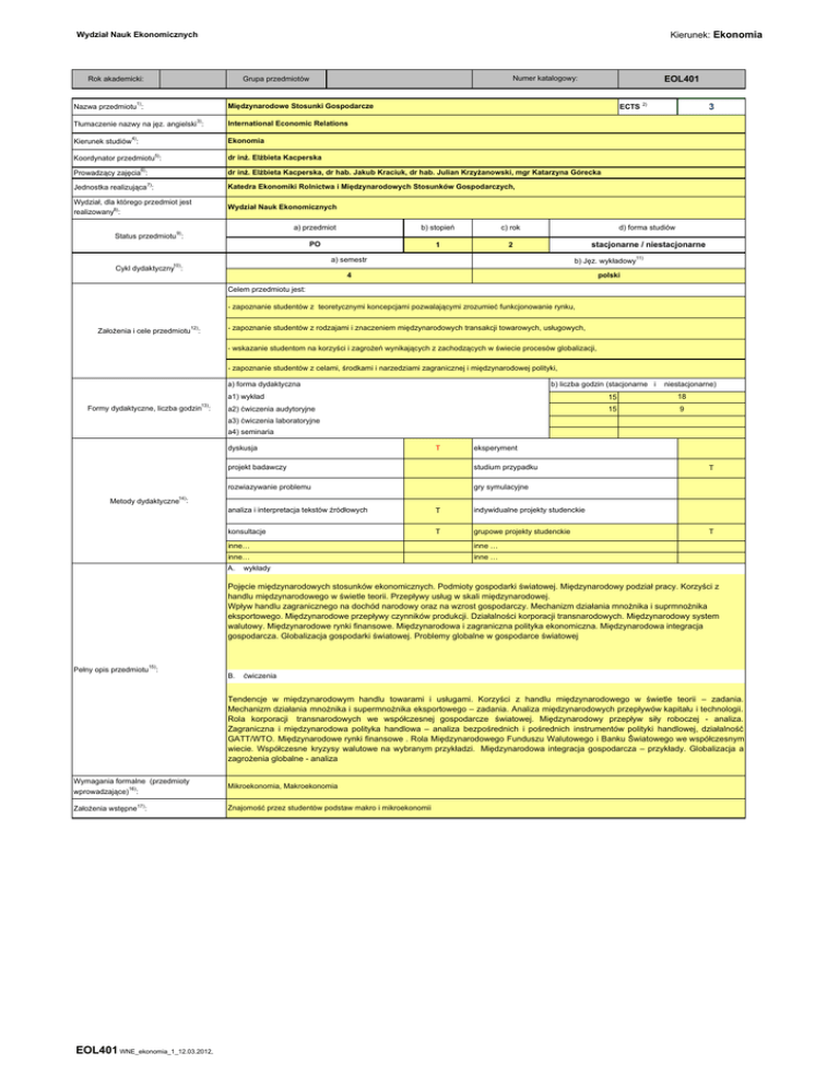 Kierunek: Ekonomia Wydział Nauk Ekonomicznych Rok akademicki: Nazwa przedmiotu1): EOL401 Numer katalogowy: Grupa przedmiotów Międzynarodowe Stosunki Gospodarcze 3) Tłumaczenie nazwy na jęz. angielski : International Economic Relations Kierunek studiów 4): Ekonomia 5) ECTS Koordynator przedmiotu : dr inż. Elżbieta Kacperska Prowadzący zajęcia6): dr inż. Elżbieta Kacperska, dr hab. Jakub Kraciuk, dr hab. Julian Krzyżanowski, mgr Katarzyna Górecka Jednostka realizująca7): Katedra Ekonomiki Rolnictwa i Międzynarodowych Stosunków Gospodarczych, Wydział, dla którego przedmiot jest realizowany8): Wydział Nauk Ekonomicznych Status przedmiotu 9): 3 2) a) przedmiot b) stopień c) rok d) forma studiów PO 1 2 stacjonarne / niestacjonarne Cykl dydaktyczny10): a) semestr b) Jęz. wykładowy11) 4 polski Celem przedmiotu jest: - zapoznanie studentów z teoretycznymi koncepcjami pozwalającymi zrozumieć funkcjonowanie rynku, Założenia i cele przedmiotu12): - zapoznanie studentów z rodzajami i znaczeniem międzynarodowych transakcji towarowych, usługowych, - wskazanie studentom na korzyści i zagrożeń wynikających z zachodzących w świecie procesów globalizacji, - zapoznanie studentów z celami, środkami i narzedziami zagranicznej i międzynarodowej polityki, a) forma dydaktyczna Formy dydaktyczne, liczba godzin13): b) liczba godzin (stacjonarne i niestacjonarne) a1) wykład 15 18 a2) ćwiczenia audytoryjne 15 9 a3) ćwiczenia laboratoryjne a4) seminaria dyskusja T eksperyment projekt badawczy studium przypadku rozwiazywanie problemu gry symulacyjne T Metody dydaktyczne14): analiza i interpretacja tekstów źródłowych T indywidualne projekty studenckie konsultacje T grupowe projekty studenckie inne… inne … inne… inne … A. T wykłady Pojęcie międzynarodowych stosunków ekonomicznych. Podmioty gospodarki światowej. Międzynarodowy podział pracy. Korzyści z handlu międzynarodowego w świetle teorii. Przepływy usług w skali międzynarodowej. Wpływ handlu zagranicznego na dochód narodowy oraz na wzrost gospodarczy. Mechanizm działania mnożnika i suprmnożnika eksportowego. Międzynarodowe przepływy czynników produkcji. Działalności korporacji transnarodowych. Międzynarodowy system walutowy. Międzynarodowe rynki finansowe. Międzynarodowa i zagraniczna polityka ekonomiczna. Międzynarodowa integracja gospodarcza. Globalizacja gospodarki światowej. Problemy globalne w gospodarce światowej Pełny opis przedmiotu15): B. ćwiczenia Tendencje w międzynarodowym handlu towarami i usługami. Korzyści z handlu międzynarodowego w świetle teorii – zadania. Mechanizm działania mnożnika i supermnożnika eksportowego – zadania. Analiza międzynarodowych przepływów kapitału i technologii. Rola korporacji transnarodowych we współczesnej gospodarcze światowej. Międzynarodowy przepływ siły roboczej - analiza. Zagraniczna i międzynarodowa polityka handlowa – analiza bezpośrednich i pośrednich instrumentów polityki handlowej, działalność GATT/WTO. Międzynarodowe rynki finansowe . Rola Międzynarodowego Funduszu Walutowego i Banku Światowego we współczesnym wiecie. Współczesne kryzysy walutowe na wybranym przykładzi. Międzynarodowa integracja gospodarcza – przykłady. Globalizacja a zagrożenia globalne - analiza Wymagania formalne (przedmioty wprowadzające)16): Mikroekonomia, Makroekonomia Założenia wstępne17): Znajomość przez studentów podstaw makro i mikroekonomii EOL401 WNE_ekonomia_1_12.03.2012, Kierunek: Ekonomia Wydział Nauk Ekonomicznych 01 - W wyniku przeprowadzonych zajęć student powinien potrafić interpretować i wyjaśniać zjawiska i procesy ekonomiczne dokonujące się w obrębie grup krajów, regionów, ugrupowań integracyjnych, jak również w całej gospodarce światowej. Efekty kształcenia18): (z kolejnymi numerami, 01, 02, 03 itd.) 05 - 02 -W wyniku przeprowadzonych zajęć student powinien być w stanie zdefiniować istotę stosunków międzynarodowych, objaśnić teorie 06 korzyści z handlu międzynarodowego i przepływów czynników produkcji w skali międzynarodowej. 03 - Student powinien poznać najważniejsze procesy dokonujące się w 07 gospodarce światowej, jakimi są globalizacja i integracja ekonomiczna. 04 - Student powinien posiadać świadomość zmian zachodzacych w 08 gospodarkach poszczególnych regionów oraz w gospodarce światowej. kolokwium na zajęciach ćwiczeniowych Sposób weryfikacji efektów kształcenia 19): 01, 02, 03 ocena wykonanie zadania projektowego na zdefiniowany temat praca pisemna przygotowywana w ramach pracy własnej studenta ocena wynikająca z obserwacji w trakcie zajęć ocena eksperymentów wykonywanych w trakcie zajęć przygotowanie zespołowej analizy zdefiniowanego problemu ocena wystąpień i prezentacji w trakcie zajęć egzamin pisemny 01,02,03,04 01,02,03,04 egzamin ustny inne.. 01,02,03,04 imienne karty oceny studenta złożone projekty 01,02,03,04 treść pytań egzaminacyjnych z oceną inne… kolokwium na zajęciach ćwiczeniowych inne.. Waga w % 25% Element oceny ocena wynikająca z obserwacji w trakcie zajęć ocena eksperymentów wykonywanych w trakcie zajęć przygotowanie zespołowej analizy zdefiniowanego problemu 10% 10% obserwacja w trakcie dyskusji zdefiniowanego problemu (aktywność) 5% 50% test egzamin pisemny egzamin ustny inne… Miejsce realizacji zajęć22): inne.. inne.. Sala dydaktyczna Literatura podstawowa i uzupełniająca 23): a) podstawowa 1. Bożyk P. 2008. Międzynarodowe Stosunki Ekonomiczne, PWE, Warszawa 2. Bożyk P. (red.). 2004. Egzemplifikacja międzynarodowych stosunków gospodarczych. WSHIP, Warszawa b) uzupełniająca 3. Rymarczyk J. 2010. Międzynarodowe Stosunki Gospodarcze, PWE, Warszawa 4. Budnikowski A. 2006. Międzynarodowe Stosunki Gospodarcze, PWE, Warszawa 5. Budnikowski A. 2000. Kawecka –Wyrzykowska E., Międzynarodowe Stosunki Gospodarcze, PWE, Warszawa 6. Rynarzewski T. 2008. Zielińska-Głębocka 