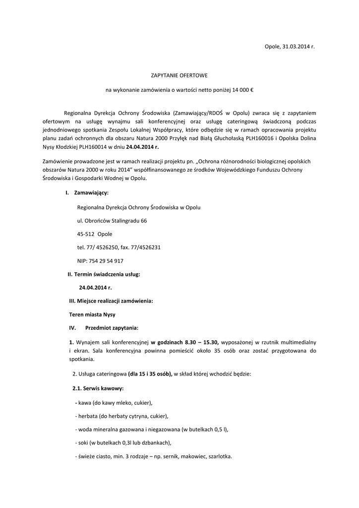 Opole, 31.03.2014 r. ZAPYTANIE OFERTOWE na wykonanie zamówienia o wartości netto poniżej 14 000 € Regionalna Dyrekcja Ochrony Środowiska (Zamawiający/RDOŚ w Opolu) zwraca się z zapytaniem ofertowym na usługę wynajmu sali konferencyjnej oraz usługę cateringową świadczoną podczas jednodniowego spotkania Zespołu Lokalnej Współpracy, które odbędzie się w ramach opracowania projektu planu zadań ochronnych dla obszaru Natura 2000 Przyłęk nad Białą Głuchołaską PLH160016 i Opolska Dolina Nysy Kłodzkiej PLH160014 w dniu 24.04.2014 r. Zamówienie prowadzone jest w ramach realizacji projektu pn. „Ochrona różnorodności biologicznej opolskich obszarów Natura 2000 w roku 2014” współfinansowanego ze środków Wojewódzkiego Funduszu Ochrony Środowiska i Gospodarki Wodnej w Opolu. I. Zamawiający: Regionalna Dyrekcja Ochrony Środowiska w Opolu ul. Obrońców Stalingradu 66 45-512 Opole tel. 77/ 4526250, fax. 77/4526231 NIP: 754 29 54 917 II. Termin świadczenia usług: 24.04.2014 r. III. Miejsce realizacji zamówienia: Teren miasta Nysy IV. Przedmiot zapytania: 1. Wynajem sali konferencyjnej w godzinach 8.30 – 15.30, wyposażonej w rzutnik multimedialny i ekran. Sala konferencyjna powinna pomieścić około 35 osób oraz zostać przygotowana do spotkania. 2. Usługa cateringowa (dla 15 i 35 osób), w skład której wchodzić będzie: 2.1. Serwis kawowy: - kawa (do kawy mleko, cukier), - herbata (do herbaty cytryna, cukier), - woda mineralna gazowana i niegazowana (w butelkach 0,5 l), - soki (w butelkach 0,3l lub dzbankach), - świeże ciasto, min. 3 rodzaje – np. sernik, makowiec, szarlotka. Zestaw kawowy powinien być dostępny dla wszystkich uczestników spotkania (pierwsza i druga grupa warsztatowa) od godziny 8.30 do 15.30 i być uzupełniany podczas spotkania. 2.2. Zimny poczęstunek: - kanapki dekoracyjne (wegetariańskie i niewegetariańskie) - 3 rodzaje (co najmniej 3 szt./osobę), - zimne przekąski - (wegetariańskie i niewegetariańskie) - 3 rodzaje (łącznie co najmniej 100 g/os.). Zimny poczęstunek powinien zostać podany do godz. 11.30 (przerwa między warsztatami). Spotkanie będzie się odbywać w dwóch grupach warsztatowych. W godz. 9.00-11.30 – pierwsza grupa 15 osobowa, od godz. 12.00 – 15.30 – druga grupa 35 osobowa. Zimny poczęstunek powinien zostać podany w ilości dla obu grup. V. Szczegółowe wymagania odnośnie usługi cateringowej. 1.Zimne przystawki oraz serwis kawowy powinny zostać podane na zastawie ceramicznej lub szklanej wraz z serwetkami i sztućcami. 2.Stoły przygotowane przez Zamawiającego do serwowania należy przykryć obrusami. VI. Sposób oraz termin składania ofert: 1. Ofertę należy złożyć na załączonym do zapytania formularzu ofertowym, zgodnie z podaną specyfikacją. Oferty należy przesyłać e-mailem na adres [email protected] lub faxem na numer 77/4526231. Termin składania ofert: 04.04.2014 r. godz. 15.30. Przesłanie oferty po wyznaczonym terminie będzie skutkowało jej odrzuceniem. 2. Ofertę należy przedstawić na wypełnionym formularzu ofertowym stanowiącym załącznik nr 1 do niniejszego zapytania. 3. Formularz ofertowy powinien zawierać całkowity koszt wykonania usługi. Należy podać cenę brutto. 4. Zaleca się aby wypełniony formularz ofertowy: • został opatrzony pieczęcią firmową oferenta, • został podpisany czytelnie przez osobę upoważnioną w imieniu oferenta, • posiadał datę sporządzenia. 5. Zamawiającemu przysługuje prawo do odwołania zapytania ofertowego bez podania przyczyny. 6. Do formularza ofertowego należy załączyć menu (załącznik nr 2), które będzie stanowiło załącznik do umowy. VII. Wymogi w stosunku do Wykonawcy: Na zapytanie mogą odpowiedzieć podmioty zdolne do wykonania zamówienia, tj. do zapewnienia usługi wynajmu sali konferencyjnej i usługi cateringowej. VIII. Kryteria wyboru oferty. Spośród ofert spełniających wymogi Zamawiającego, zostanie wybrana oferta najkorzystniejsza cenowo na podstawie przedstawionych cen jednostkowych. • Cena 100 % IX. Płatności. 1. Faktura VAT za wykonaną usługę zostanie wystawiona na Regionalną Dyrekcję Ochrony Środowiska w Opolu. 2. Oryginał faktury Wykonawca przekaże do siedziby Zamawiającego. 3. Formą płatności będzie przelew na rachunek bankowy wykonawcy z co najmniej 21- dniowym terminem płatności wystawionym na fakturze sprzedaży. 4. Płatności będą dokonywane na podstawie łącznej ceny brutto podanej na formularzu ofertowym. 5. Zamawiający nie przewiduje płatności na podstawie faktur częściowych oraz wypłacania zaliczki. Zamawiający nie przewiduje, zmian w drodze aneksu do uzgodnionej ceny za wykonaną usługę. X. Uwagi końcowe. 1. Na podstawie art. 4 ust 8 ustawy z dnia 29 stycznia 2004 r. Prawo zamówień publicznych (Dz. U z 2010 r. Nr 113, poz.759 z późn. zm.), w prowadzonym postępowaniu nie stosuje się przepisów niniejszej ustawy. 2. Niniejsze zapytanie nie stanowi zobowiązania Zamawiającego do zawarcia umowy. Załączniki: 1. Formularz ofertowy. 2. Menu. Załącznik nr 1 FORMULARZ OFERTY Regionalna Dyrekcja Ochrony Środowiska w Opolu ul. Obrońców Stalingradu 66 45-512 Opole ………………………………………………………………….. …………………………………………………………………… (Wykonawca) W odpowiedzi na zapytanie ofertowe dotyczące świadczenia usługi cateringowej podczas spotkania organizowanego przez RDOŚ w Opolu w dniu 24.04.2014 r. w godzinach 8.30 – 15.30 dla 15 i 35 osób, oferuję wykonanie zamówienia za niżej podane kwoty: Przedmiot wyceny Ilość usług Usługa wynajmu sali konferencyjnej i usługa cateringowa (zgodnie ze specyfikacją podaną w zapytaniu ofertowym) 1 Kwota brutto za usługę Termin płatności: ……………………. Jednocześnie oświadczam, że posiadam odpowiedni potencjał techniczny oraz niezbędne zasoby do realizacji niniejszego zamów