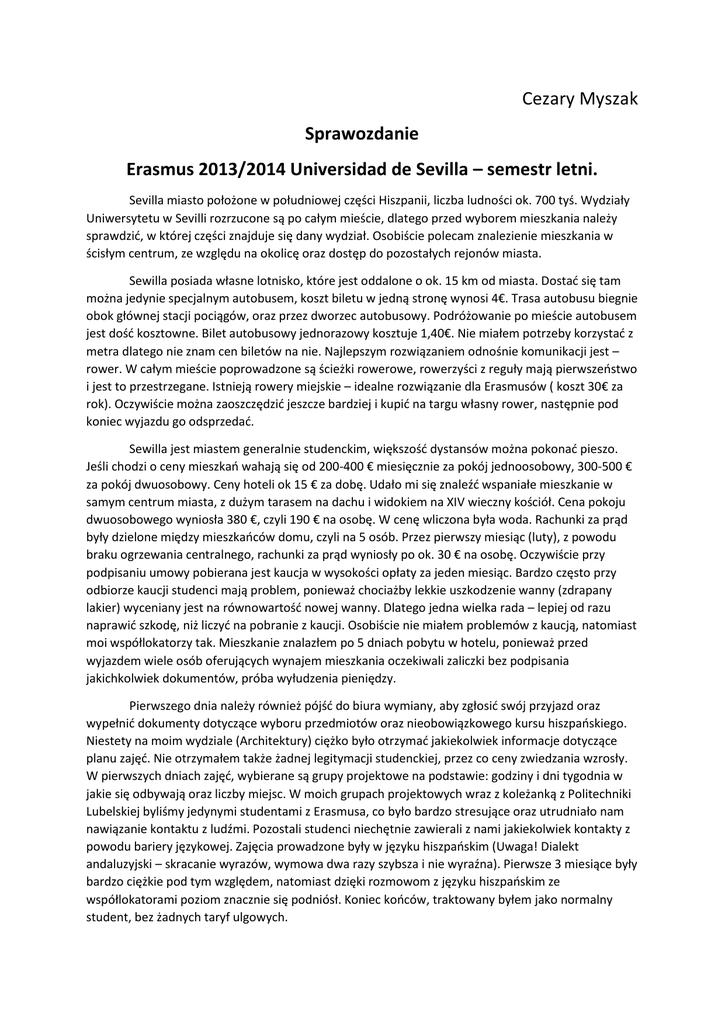 Cezary Myszak Sprawozdanie Erasmus 2013/2014 Universidad de Sevilla – semestr letni. Sevilla miasto położone w południowej części Hiszpanii, liczba ludności ok. 700 tyś. Wydziały Uniwersytetu w Sevilli rozrzucone są po całym mieście, dlatego przed wyborem mieszkania należy sprawdzić, w której części znajduje się dany wydział. Osobiście polecam znalezienie mieszkania w ścisłym centrum, ze względu na okolicę oraz dostęp do pozostałych rejonów miasta. Sewilla posiada własne lotnisko, które jest oddalone o ok. 15 km od miasta. Dostać się tam można jedynie specjalnym autobusem, koszt biletu w jedną stronę wynosi 4€. Trasa autobusu biegnie obok głównej stacji pociągów, oraz przez dworzec autobusowy. Podróżowanie po mieście autobusem jest dość kosztowne. Bilet autobusowy jednorazowy kosztuje 1,40€. Nie miałem potrzeby korzystać z metra dlatego nie znam cen biletów na nie. Najlepszym rozwiązaniem odnośnie komunikacji jest – rower. W całym mieście poprowadzone są ścieżki rowerowe, rowerzyści z reguły mają pierwszeństwo i jest to przestrzegane. Istnieją rowery miejskie – idealne rozwiązanie dla Erasmusów ( koszt 30€ za rok). Oczywiście można zaoszczędzić jeszcze bardziej i kupić na targu własny rower, następnie pod koniec wyjazdu go odsprzedać. Sewilla jest miastem generalnie studenckim, większość dystansów można pokonać pieszo. Jeśli chodzi o ceny mieszkań wahają się od 200-400 € miesięcznie za pokój jednoosobowy, 300-500 € za pokój dwuosobowy. Ceny hoteli ok 15 € za dobę. Udało mi się znaleźć wspaniałe mieszkanie w samym centrum miasta, z dużym tarasem na dachu i widokiem na XIV wieczny kościół. Cena pokoju dwuosobowego wyniosła 380 €, czyli 190 € na osobę. W cenę wliczona była woda. Rachunki za prąd były dzielone między mieszkańców domu, czyli na 5 osób. Przez pierwszy miesiąc (luty), z powodu braku ogrzewania centralnego, rachunki za prąd wyniosły po ok. 30 € na osobę. Oczywiście przy podpisaniu umowy pobierana jest kaucja w wysokości opłaty za jeden miesiąc. Bardzo często przy odbiorze kaucji studenci mają problem, ponieważ chociażby lekkie uszkodzenie wanny (zdrapany lakier) wyceniany jest na równowartość nowej wanny. Dlatego jedna wielka rada – lepiej od razu naprawić szkodę, niż liczyć na pobranie z kaucji. Osobiście nie miałem problemów z kaucją, natomiast moi współlokatorzy tak. Mieszkanie znalazłem po 5 dniach pobytu w hotelu, ponieważ przed wyjazdem wiele osób oferujących wynajem mieszkania oczekiwali zaliczki bez podpisania jakichkolwiek dokumentów, próba wyłudzenia pieniędzy. Pierwszego dnia należy również pójść do biura wymiany, aby zgłosić swój przyjazd oraz wypełnić dokumenty dotyczące wyboru przedmiotów oraz nieobowiązkowego kursu hiszpańskiego. Niestety na moim wydziale (Architektury) ciężko było otrzymać jakiekolwiek informacje dotyczące planu zajęć. Nie otrzymałem także żadnej legitymacji studenckiej, przez co ceny zwiedzania wzrosły. W pierwszych dniach zajęć, wybierane są grupy projektowe na podstawie: godziny i dni tygodnia w jakie się odbywają oraz liczby miejsc. W moich grupach projektowych wraz z koleżanką z Politechniki Lubelskiej byliśmy jedynymi studentami z Erasmusa, co było bardzo stresujące oraz utrudniało nam nawiązanie kontaktu z ludźmi. Pozostali studenci niechętnie zawierali z nami jakiekolwiek kontakty z powodu bariery językowej. Zajęcia prowadzone były w języku hiszpańskim (Uwaga! Dialekt andaluzyjski – skracanie wyrazów, wymowa dwa razy szybsza i nie wyraźna). Pierwsze 3 miesiące były bardzo ciężkie pod tym względem, natomiast dzięki rozmowom z języku hiszpańskim ze współlokatorami poziom znacznie się podniósł. Koniec końców, traktowany byłem jako normalny student, bez żadnych taryf ulgowych. Istnieje wiele organizacji studenckich dla Erasmusów, organizują oni rozmaite wycieczki zorganizowane, imprezy i spotkania. Ja osobiście rzadko z nich korzystałem, było to spowodowane po pierwsze większą ceną niż normalny wyjazd, po drugie wolałem spędzać czas z bliskim poznanymi osobami. W okresie mojego pobytu w Sewilli odbywały się: Semana Santa, Feria de Abril. Ceny w barach, restauracjach rosną z powodu napływającej masy turystów. Podróżowanie po samej Andaluzji najbardziej opłacalne jest, gdy korzysta się z dwóch portali społecznościowych – www.blablacar.es oraz www.couchsurfing.org. Pierwszy dotyczący przejazdów, drugi odnośnie noclegów. Rozliczanie z uczelnią odbyło się bardzo sprawnie, bez większych problemów. Generalnie ten wyjazd uznaję za bardzo udany, z racji ogromnej ilości poznanych kultur, ludzi, przyzwyczajeń oraz możliwości w bardzo krótkim czasie poznania języka hiszpańskiego.