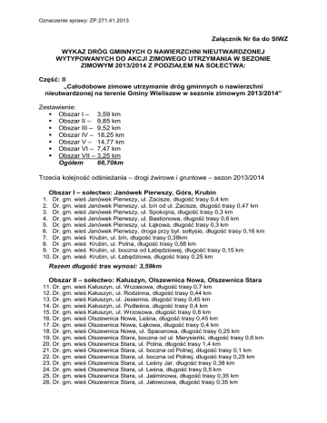 Oznaczenie sprawy: ZP.271.41.2013 Załącznik Nr 6a do SIWZ WYKAZ DRÓG GMINNYCH O NAWIERZCHNI NIEUTWARDZONEJ WYTYPOWANYCH DO AKCJI ZIMOWEGO UTRZYMANIA W SEZONIE ZIMOWYM 2013/2014 Z PODZIAŁEM NA SOŁECTWA: Część: II „Całodobowe zimowe utrzymanie dróg gminnych o nawierzchni nieutwardzonej na terenie Gminy Wieliszew w sezonie zimowym 2013/2014” Zestawienie: Obszar I – 3,59 km Obszar II – 9,85 km Obszar III – 9,52 km Obszar IV – 18,25 km Obszar V – 14,77 km Obszar VI – 7,47 km Obszar VII – 3,25 km Ogółem 66,70km Trzecia kolejność odśnieżania – drogi żwirowe i gruntowe – sezon 2013/2014 Obszar I – sołectwo: Janówek Pierwszy, Góra, Krubin 1. Dr. gm. wieś Janówek Pierwszy, ul. Zacisze, długość trasy 0,4 km 2. Dr. gm. wieś Janówek Pierwszy, ul. b/n od ul. Zacisze, długość trasy 0,47 km 3. Dr. gm. wieś Janówek Pierwszy, ul. Spokojna, długość trasy 0,3 km 4. Dr. gm. wieś Janówek Pierwszy, ul. Bastionowa, długość trasy 0,6 km 5. Dr. gm. wieś Janówek Pierwszy, ul. Łąkowa, długość trasy 0,3 km 6. Dr. gm. wieś Janówek Pierwszy, droga przy był. sołtysie, długość trasy 0,16 km 7. Dr. gm. wieś Krubin, ul. b/n, długość trasy 0,38km 8. Dr. gm. wieś Krubin, ul. Polna, długość trasy 0,58 km 9. Dr. gm. wieś Krubin, ul. boczna od Łabędziowej, długość trasy 0,15 km 10. Dr. gm. wieś Krubin, ul. Łabędziowa, długość trasy 0,25 km Razem długość tras wynosi: 3,59km Obszar II – sołectwo: Kałuszyn, Olszewnica Nowa, Olszewnica Stara 11. Dr. gm. wieś Kałuszyn, ul. Wczasowa, długość trasy 0,7 km 12. Dr. gm. wieś Kałuszyn, ul. Rodzinna, długość trasy 0,44 km 13. Dr. gm. wieś Kałuszyn, ul. Jesienna, długość trasy 0,45 km 14. Dr. gm. wieś Kałuszyn, ul. Podleśna, długość trasy 0,4 km 15. Dr. gm. wieś Kałuszyn, ul. Wrzosowa, długość trasy 0,6 km 16. Dr. gm. wieś Olszewnica Nowa, Leśna, długość trasy 0,45 km 17. Dr. gm. wieś Olszewnica Nowa, Łąkowa, długość trasy 0,4 km 18. Dr. gm, wieś Olszewnica Nowa, ul. Spacerowa, długość trasy 0,25 km 19. Dr. gm. wieś Olszewnica Stara, boczna od ul. Marysieńki, długość trasy 0,6 km 20. Dr. gm. wieś Olszewnica Stara, ul. Polna, długość trasy 1,4 km 21. Dr. gm. wieś Olszewnica Stara, ul. boczna od Polnej, długość trasy 0,1 km 22. Dr. gm. wieś Olszewnica Stara, ul. boczna od Polnej, długość trasy 0,25 km 23. Dr. gm. wieś Olszewnica Stara, ul. Leśny Jar, długość trasy 0,38 km 24. Dr. gm. wieś Olszewnica Stara, ul. Leśna, długość trasy 0,5 km 25. Dr. gm. wieś Olszewnica Stara, ul. Jaśminowa, długość trasy 0,35 km 26. Dr. gm. wieś Olszewnica Stara, ul. Jałowcowa, długość trasy 0,35 km Oznaczenie sprawy: ZP.271.41.2013 27. Dr. gm. wieś Olszewnica Stara, ul. Słoneczna Polana, długość trasy 0,4 km 28. Dr. gm. wieś Olszewnica Stara, ul. Zorzy, długość trasy 0,6 km 29. Dr. gm. wieś Olszewnica Stara, ul. Jasna, długość trasy 0,3 km 30. Dr. gm. wieś Olszewnica Stara, ul. b/n od Wa-wskiej do granicy z obrębem Kałuszyn (ul. Podleśna), długość trasy 0,3 km 31. Dr. gm. wieś Olszewnica Stara, ul. boczna od Wa-wskiej, długość trasy 0,1 km 32. Dr. gm. wieś Olszewnica Stara, ul. b/n do skupu złomu, długość trasy 0,53 km Razem długość tras wynosi: 9,85km Obszar III – sołectwo: Topolina, Sikory 33. Dr. gm. wieś Topolina, ul. Szlachecka, długość trasy 0,62 km 34. Dr. gm. wieś Topolina, ul. Sarmacka, długość trasy 0,65 km 35. Dr. gm. wieś Topolina, ul. Staropolska, długość trasy 0,4 km 36. Dr. gm. wieś Topolina, ul. Debowy Tor (w stronę wału), długość trasy 0,65 km 37. Dr. gm. wieś Topolina, ul. Żabi Chór, długość trasy 0,75 km 38. Dr. gm. wieś Topolina, ul. Retmańska, długość trasy 0,3 km 39. Dr. gm. wieś Topolina, ul. Podwale, długość trasy 1,1 km 40. Dr. gm. wieś Topolina – Sikory, długość trasy 2,3 km 41. Dr. gm. wieś Sikory, ul. Główna, długość trasy 1,0 km 42. Dr.. gm. wieś Sikory, ul. Świerkowa (do wału), długość trasy 0,1 km 43. Dr. gm. wieś Sikory, ul. Kanałowa, długość trasy 0,8 km 44. Dr. gm. wieś Sikory – Kępa Kikolska, długość trasy 0,85 km Razem długość tras wynosi: 9,52km Obszar IV – sołectwo: Poddębie, Skrzeszew 45. Dr. gm. wieś Poddębie, ul. Spacerowa, długość trasy 0,5 km 46. Dr. gm. wieś Poddębie, ul. Promowa, długość trasy 1,15 km 47. Dr. gm. wieś Poddębie, ul. Słoneczna, długość trasy 0,45 km 48. Dr. gm. wieś Poddębie, ul. Wesoła, długość trasy 1,0 km 49. Dr. gm. wieś Poddębie, ul. Żarłocznego Szczupaka, długość trasy 0,45 km 50. Dr. gm. wieś Poddębie, ul. Brzozowa, długość trasy 0,7 km 51. Dr. gm. wieś Poddębie, ul. Radosna, długość trasy 0,2 km 52. Dr. gm. wieś Skrzeszew, ul. Spokojna, długość trasy 1,5 km 53. Dr. gm. wieś Skrzeszew, ul. Rozwojowa, długość trasy 0,4 km 54. Dr. gm. wieś Skrzeszew, ul. Polna (od Szkolnej w prawo), długość trasy 0,5 km 55. Dr. gm. wieś Skrzeszew, ul. od Polnej przy sklepie, długość trasy 0,25 km 56. Dr. gm. wieś Skrzeszew, ul. osiedle za szkołą, długość trasy 0,35 km 57. Dr. gm. wieś Skrzeszew, ul. Graniczna, długość trasy 1,2 km 58. Dr. gm. wieś Skrzeszew, ul. Leśna – Legionowo (Al. Róż), długość trasy 4,2 km 59. Dr. gm. wieś Skrzeszew, ul. Brygady Pościgowej, długość trasy 0,65 km 60. Dr. gm. Wieś Skrzeszew, ul. hr. Grocholskiego i Różana, długość trasy 0,45 km 61. Dr. gm. wieś Skrzeszew, ul. Janiny, długość trasy 2,0 km 62. Dr. gm. wieś Skrzeszew, ul. Słowackiego, długość trasy 0,7 km 63. Dr. gm. wieś Skrzeszew, ul. Wczasowa, długość trasy 0,45 km 64. Dr. gm. wieś Skrzeszew, ul. Łączna, długość trasy 0,9 km 65. Dr. gm. wieś Skrzeszew, ul. Górna, długość trasy 0,25 km Razem długość tras wynosi: 18,25km Obszar V – sołectwo: Komornica, Wieliszew 66. Dr. gm. wieś Komornica, ul. Słoneczna, długość trasy 0,65 km 67. Dr. gm. wieś Komornica, ul. boczna o Wspólnej, d