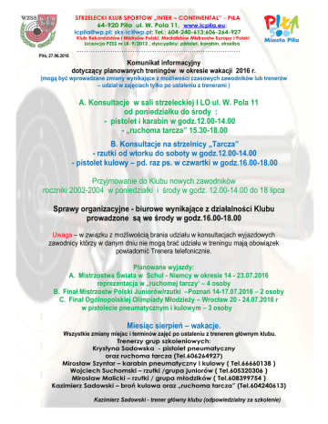 STRZELECKI KLUB SPORTOW „INTER – CONTINENTAL” - PIŁA 64-920 Piła ul. W. Pola 11, www.icpila.eu; [email protected]; [email protected]; Tel.: 604-240-613;606-264-927 Klub Rekordzistów i Mistrzów Polski, Medalistów Mistrzostw Europy i Polski Licencja PZSS nr LK-9/2012 , dyscypliny: pistolet, karabin, strzelba Piła, 27.06.2016 ...……………………………………………………………… Komunikat informacyjny dotyczący planowanych treningów w okresie wakacji 2016 r. (mogą być wprowadzane zmiany wynikające z możliwości czasowych zawodników lub trenerów – udział w zajęciach tylko po ustaleniu z trenerami ) A. Konsultacje w sali strzeleckiej I LO ul. W. Pola 11 od poniedziałku do środy : - pistolet i karabin w godz.12.00-14.00 - „ruchoma tarcza” 15.30-18.00 B. Konsultacje na strzelnicy „Tarcza” - rzutki od wtorku do soboty w godz.12.00-14.00 - pistolet kulowy – pd. raz ps. w czwartki w godz.16.00-18.00 Przyjmowanie do Klubu nowych zawodników roczniki 2002-2004 w poniedziałki i środy w godz. 12.00-14.00 do 18 lipca Sprawy organizacyjne - biurowe wynikające z działalności Klubu prowadzone są we środy w godz.16.00-18.00 Uwaga – w związku z możliwością brania udziału w konsultacjach wyjazdowych zawodnicy którzy w danym dniu nie mogą brać udziału w treningu mają obowiązek powiadomić Trenera telefonicznie. Planowane wyjazdy: A. Mistrzostwa Świata w Schul - Niemcy w okresie 14 - 23.07.2016 reprezentacja w „ruchomej tarczy’ – 4 osoby B. Finał Mistrzostw Polski Juniorów/rzutki –Poznań 14-17.07.2016 – 2 osoby C. Finał Ogólnopolskiej Olimpiady Młodzieży – Wrocław 20 - 24.07.2016 r w pistolecie pneumatycznym i kulowym – 3 osoby Miesiąc sierpień – wakacje. Wszystkie zmiany miejsc i terminów zajęć po ustaleniu z trenerem głównym klubu. Trenerzy grup szkoleniowych: Krystyna Sadowska - pistolet pneumatyczny oraz ruchoma tarcza (Tel.606264927) Mirosław Szyntar – karabin pneumatyczny i kulowy ( Tel.66660138 ) Wojciech Suchomski – rzutki /grupa juniorów ( Tel.605320306 ) Mirosław Malicki – rzutki / grupa młodzików ( Tel.608399754 ) Kazimierz Sadowski – broń kulowa oraz „ruchoma tarcza” (Tel.604240613) Kazimierz Sadowski - trener główny klubu (odpowiedzialny za szkolenie)