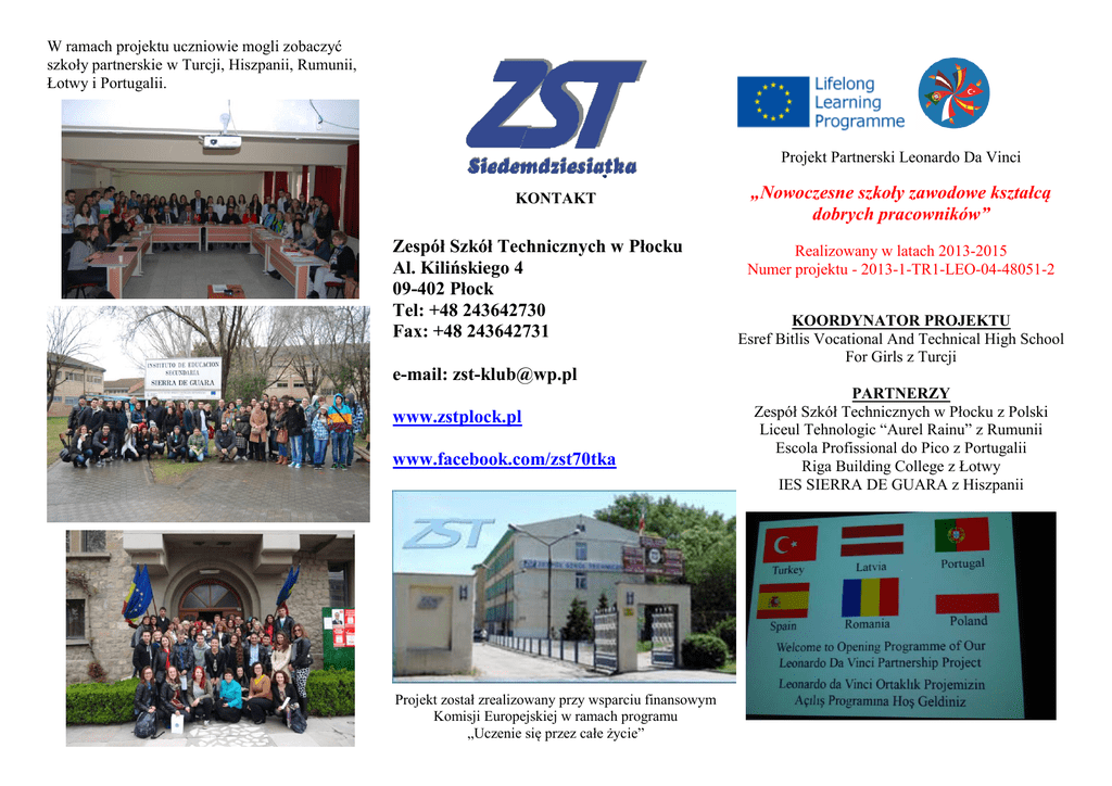 W ramach projektu uczniowie mogli zobaczyć szkoły partnerskie w Turcji, Hiszpanii, Rumunii, Łotwy i Portugalii. Projekt Partnerski Leonardo Da Vinci KONTAKT Zespół Szkół Technicznych w Płocku Al. Kilińskiego 4 09-402 Płock Tel: +48 243642730 Fax: +48 243642731 „Nowoczesne szkoły zawodowe kształcą dobrych pracowników” Realizowany w latach 2013-2015 Numer projektu - 2013-1-TR1-LEO-04-48051-2 KOORDYNATOR PROJEKTU Esref Bitlis Vocational And Technical High School For Girls z Turcji e-mail: [email protected] www.zstplock.pl www.facebook.com/zst70tka Projekt został zrealizowany przy wsparciu finansowym Komisji Europejskiej w ramach programu „Uczenie się przez całe życie” PARTNERZY Zespół Szkół Technicznych w Płocku z Polski Liceul Tehnologic “Aurel Rainu” z Rumunii Escola Profissional do Pico z Portugalii Riga Building College z Łotwy IES SIERRA DE GUARA z Hiszpanii Ogólny cel projektu: - poznanie systemów edukacji zawodowej w różnych krajach europejskich Cele szczegółowe projektu: - zwiększenie współpracy między nauczycielami przedmiotów praktycznych i teoretycznych - rozwój współpracy z lokalnymi przedsiębiorstwami - porównanie metod nauczania w szkołach zawodowych w Europie - zwiększenie użycia nowoczesnych technologii przez nauczycieli zawodu - rozwój umiejętności z języka angielskiego i ICT Spotkania Projekt zakładał 6 wizyt roboczych w ciągu 2 lat: Kraj Data spotkania Turcja 25-30.11.2013 Hiszpania Rumunia 8-15.02.2014 27.04-03.05.2014 Łotwa 28.09.-04.10.2014 Polska Portugalia 19-25.04.2015 24-30.05.2015 Korzyści Dzięki udziałowi w projekcie 20 uczniów ZST uczestniczyło w wyjazdach zagranicznych. Poznali język, kulturę i tradycje danego kraju. Nawiązali nowe znajomości. Poznali problemy młodzieży w innych krajach europejskich. Stali się bardziej otwarci i tolerancyjni. Poprawili swoje umiejętności językowe, gdyż musieli się porozumiewać po angielsku. Poznali szkoły w innych krajach europejskich. Uczestniczyli w lekcjach oraz wspólny uchy zajęciach, na których tworzyli różne produkty. Koordynatorzy projektu W trakcie wizyt roboczych koordynatorzy projektu spotykali się, by omawiać plany i działania na następny etap projektu. - - Realizując międzynarodowy projekt szkół zawodowych koordynator projektu, 8 nauczycieli oraz dyrektor mieli możliwość poznania innej szkoły zawodowej oraz systemu szkolnictwa zawodowego w różnych krajach europejskich. W trakcie wizyt roboczych zwiedzali szkołę, warsztaty szkolne oraz firmy współpracujące ze szkołą i zajmujące się organizacją praktyk uczniowskich. Obserwowali lekcje zajęć praktycznych oraz praktyk zawodowych. PRODUCTY KOŃCOWE prezentacje multimedialne o szkole, Płocku, Polsce, systemie edukacji w Polsce prezentacje multimedialne zawierające wyniki badań ankietowych przeprowadzanych wśród uczniów, nauczycieli, nauczycieli zawodu odpowiedzi na pytania dotyczące szkolnictwa zawodowego w Polsce analiza SWOT szkoły analiza SWOT współpracy z firmami film o wizycie na Łotwie scenariusz lekcji spawania film z lekcji spawania broszura 1 - systemy edukacji w krajach partnerskich broszura 2 – podobieństwa i różnice w szkolnictwie zawodowym broszura 3 – współpraca z firmami broszura 4 – absolwenci szkół zawodowych broszura 5 – efektywne materiały edukacyjne (6 scenariuszy lekcji zajęć praktycznych) konferencja dot. szkolnictwa zawodowego publikacja podsumowująca projekt
