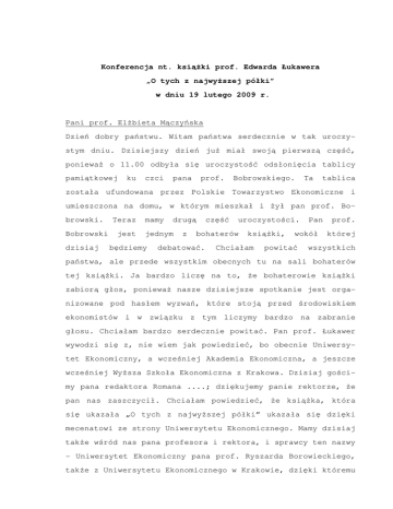 Konferencja nt. książki prof. Edwarda Łukawera „O tych z najwyższej półki” w dniu 19 lutego 2009 r. Pani prof. Elżbieta Mączyńska Dzień dobry państwu. Witam państwa serdecznie w tak uroczystym dniu. Dzisiejszy dzień już miał swoją pierwszą część, ponieważ o 11.00 odbyła się uroczystość odsłonięcia tablicy pamiątkowej ku czci pana prof. Bobrowskiego. Ta tablica została ufundowana przez Polskie Towarzystwo Ekonomiczne i umieszczona na domu, w którym mieszkał i żył pan prof. Bobrowski. Teraz Bobrowski jest dzisiaj mamy drugą jednym będziemy z część uroczystości. bohaterów debatować. książki, Chciałam Pan wokół powitać prof. której wszystkich państwa, ale przede wszystkim obecnych tu na sali bohaterów tej książki. Ja bardzo liczę na to, że bohaterowie książki zabiorą głos, ponieważ nasze dzisiejsze spotkanie jest organizowane pod hasłem wyzwań, które stoją przed środowiskiem ekonomistów i w związku z tym liczymy bardzo na zabranie głosu. Chciałam bardzo serdecznie powitać. Pan prof. Łukawer wywodzi się z, nie wiem jak powiedzieć, bo obecnie Uniwersytet Ekonomiczny, a wcześniej Akademia Ekonomiczna, a jeszcze wcześniej Wyższa Szkoła Ekonomiczna z Krakowa. Dzisiaj gościmy pana redaktora Romana ....; dziękujemy panie rektorze, że pan nas zaszczycił. Chciałam powiedzieć, że książka, która się ukazała „O tych z najwyższej półki” ukazała się dzięki mecenatowi ze strony Uniwersytetu Ekonomicznego. Mamy dzisiaj także wśród nas pana profesora i rektora, i sprawcy ten nazwy - Uniwersytet Ekonomiczny pana prof. Ryszarda Borowieckiego, także z Uniwersytetu Ekonomicznego w Krakowie, dzięki któremu 2 Konferencja nt. książki prof. E. Łukawera „O tych z najwyższej półki- 19.02.2009 r. też mogło dojść do wydania tej książki przez PTE Oddział w Krakowie. Proszę państwa, chciałabym. Ta książka miała swoją dość długą historię i o tym będzie opowiadał, o tym poinformuje pan prezes dr Artur Pollok, prezes, wiceprezes Zarządu Krajowego i równocześnie prezes Oddziału PTE w Krakowie. Ja tylko chciałam powiedzieć, że traktowałam od początku fakt przygotowania tej książki jako wielkie ważne wydarzenie, które wiąże się z uwagą pana profesora na temat tego, że właściwie nie ma środowiska ekonomistów. Są ekonomiści, a obecnie nie ma środowiska ekonomistów. Chciałam państwu na początku przeczytać list od pani prof. Hubner, która jest nieobecna, nie tylko zresztą ona, właściwie bohaterowie książki spośród 31 bohaterów, mamy żyjących niestety tylko 18. Niedawno jeszcze było 19. Jak wiadomo pan prof. Wilczyński już nie żyje, ale wśród tych wszyscy z żyjących bohaterów książki chcieli tutaj być z nami. Pan prof. Balcerowicz jest w Brukseli; pan prof. Kołodko we Włoszech; część osób choruje, niestety grypa przetrzebiła szeregi, natomiast zarówno pani prof. Hubner jak i pan prof. Rosati mają dzisiaj w Brukseli ważne posiedzenie. Chciałam państwu przeczytać jeden tylko z listów, który napłynął do nas w związku z tą dzisiejszą uroczystością, ale symptomatyczny, więc proszę mi pozwolić przeczytać. Pani prof. Hubner pisze: Szanowni państwo. Bruksela, 19 lutego, czyli list z dzisiejszego dnia. Szanowni Państwo. Na wstępnie pragnę wyrazić głęboki żal, iż nie mogę dzisiaj towarzyszyć państwu podczas prezentacji książki prof. Edwarda Łukawera o wybitnych polskich ekonomistach ostatniego półwiecza. Czuję się niezwykle zaszczycona, że mogłam się znaleźć w gronie 31 ekonomistów z górnej półki. Jednocześnie smuci fakt, że autor tej książki prof. Edward Łukawer, który 3 Konferencja nt. książki prof. E. Łukawera „O tych z najwyższej półki- 19.02.2009 r. wiele włożył trudu w przygotowanie tego ... ekonomistów polskich, nie może dziś razem z nami cieszyć się z efektów swojej pracy. Profesor Łukawer napisał we wstępie do swojej książki, że mamy obecnie w kraju ekonomistów, ale nie mamy środowiska ekonomicznego. Myślę, że jest w tych słowach wiele prawdy. Ekonomiści, o których pisze pan profesor, tworzyli takie środowisko, w którym żywa była dyskusja, w której wymienialiśmy się poglądami i pomysłami na przyszłość. Chyba warto powrócić do takiej idei. Dlatego mam głęboką nadzieję, że książka Edwarda Łukawera będzie cieszyć się dużym powodzeniem nie tylko w środowisku ekonomicznym, lecz trafi również do młodych ludzi poprzez ukazanie powojennej historii rozwoju ekonomii w Polsce, zachęci ich do zainteresowania się tą dziedziną nauki i wpływu na nasze życie. Podpisane: Danuta Hubner. Proszę państwa, my w PTE próbujemy ożywić dyskusję wśród środowiska ekonomistów. Znajdą państwo rezultaty na stronie internetowej, także ta debata jest nagrywana i wyniki będą prezentowane na stronie internetowej. Bardzo liczę na wypowiedzi na stojących przed temat najważniejszych ekonomistami w współczesnych kontekście obecnego wyzwań stanu gospodarki. Pan profesor pisał o przeszłości, a teraz jak wiemy sytuacja w gospodarce jest tak trudna, że ekonomiści mają wiele do zrobienia. Chciałabym poprosić na wstępie o wypowiedź pana rektora, pana rektora Romana ... Proszę bardzo. Pan rektor Roman Niestrój Dziękuję bardzo pani Prezes. Chciałbym serdecznie podziękować za zaproszenie do wzięcia udziału w tej uroczystości. Mam ku temu powody nie tylko formalne, mam zaszczyt kierować Uniwersytetem Ekonomicznym w Krakowie, ale również czysto osobiste. 4 Konferencja nt. książki prof. E. Łukawera „O tych z najwyższej półki- 19.02.2009 r. Pan prof. Edward Łukawer był opiekunem mojego roku, to zamierzchła historia już, ale mogę powiedzieć, że reprezentuję ... prof. Łukawera. Miałem z nim wykłady z ekonomii politycznej kapitalizmu na pierwszym roku. Dwukrotnie zdawałem egzamin co było dużym przeżyciem, wie