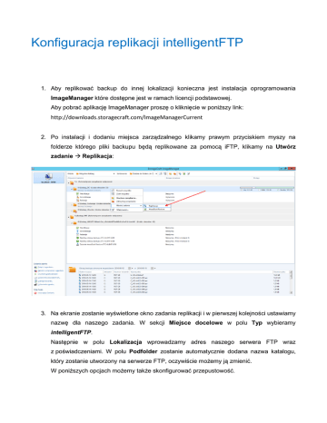 Konfiguracja replikacji intelligentFTP 1. Aby replikować backup do innej lokalizacji konieczna jest instalacja oprogramowania ImageManager które dostępne jest w ramach licencji podstawowej. Aby pobrać aplikację ImageManager proszę o kliknięcie w poniższy link: http://downloads.storagecraft.com/ImageManagerCurrent 2. Po instalacji i dodaniu miejsca zarządzalnego klikamy prawym przyciskiem myszy na folderze którego pliki backupu będą replikowane za pomocą iFTP, klikamy na Utwórz zadanie Replikacja: 3. Na ekranie zostanie wyświetlone okno zadania replikacji i w pierwszej kolejności ustawiamy nazwę dla naszego zadania. W sekcji Miejsce docelowe w polu Typ wybieramy intelligentFTP. Następnie w polu Lokalizacja wprowadzamy adres naszego serwera FTP wraz z poświadczeniami. W polu Podfolder zostanie automatycznie dodana nazwa katalogu, który zostanie utworzony na serwerze FTP, oczywiście możemy ją zmienić. W poniższych opcjach możemy także skonfigurować przepustowość. Przykładowe okno konfiguracji lokalizacji replikacji intelligentFTP: 4. Po kliknięciu przycisku Zapisz, w oknie konfiguracji lokalizacji następuje weryfikacja połączenia z serwerem FTP, a następnie zostanie rozpoczęty proces replikacji.