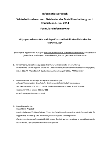 Informatiosvordruck Wirtschaftsmisson vom Ostcluster der Metallbearbeitung nach Deutschland. Juni 2014 Formularz informacyjny Misja gospodarcza Wschodniego Klastra Obróbki Metali do Niemiec czerwiec 2014 (niezbędne wypełnienie w języku polskim (ewentualnie również w niemieckim); wypełnione formularze posłużą do poszukiwania firm na spotkania w Niemczech) 1. Firma/nazwa, rok założenia przedsiębiorstwa, wielkośd (liczba pracowników); Firmenname, Gründungsjahr, Größe des Unternehmens (Anzahl der Mitarbeiter/Beschäftigten); P.U.H. CEWAR Więch&Więch Spółka Jawna, Grundungsjahr 1991, 70 Mitarbeiter 2. Dane adresowe, lokalizacja, dostępnośd komunikacyjna; Adresse/Kontaktdaten, Standort des Betriebes, mögliche Verkehrsanbindung; Str. Pancerniaków 1“B‘ 20-331 Lublin, Produktion Werk Str. Cisowa 9 20-703 Lublin Tel 815369427, m-phone 609 652 111 e-mail :[email protected] 3. Produkty w ofercie; Produkte im Angebot; Mechanische- und Fräsbearbeitung (5 und 3 achsige) Metallerzeugnisse, darin hauptsächlich für Luftfahrten, Werkzeug- und Vorrichtungausrüstung und Einspritzformen Obróbka mechaniczna frezarska (5-si i 3 osiowe Centra),wyroby metalowe w tym głównie części dla lotnictwa , oprzyrządowanie i formy wtryskowe 4. Usługi - oferowane procesy (możliwie szczegółowo np. z zakresami wymiarowymi, rodzajem obrabianych materiałów itp.), zdolności produkcyjne np. roczne, miesięczne; Dienstleistungen/Services – angebotene Prozesse (möglich detailliert: mit Abmessungsbereichen, Arten des Materials für Bearbeitung, usw.), Jahres- und Monatsproduktionskapazität; Fräsen, CNC achse X do 1050 mm,Y 600,Z 600, Drehen CNC do 300 mm, konwencjonalne do 600 mm, Elektrosenken, Flachschleifen von Wellen und Löchern, Harten, elektrodrązenie szlifowanie płaskie ,wałków i otworów hartowanie (1200X700X600) Materials: stal , aluminium,tytan,hardox, stale nierdzewne Monatsproduktion 7000 Stunden 5. Potencjał - park maszynowy, kubatura pomieszczeo produkcyjnych, możliwości rozbudowy itp.; Maschinen/Produktionsanlagen, Größe der Produktionshallen, Erweiterungsmöglichkeiten, usw.; 1 Fräszentrum – 5 achsige(Hermle), 5 Fräszentren – 3 achsige, 25 herkömmlichen Maschinen , 3 Elektrosenken, 2 Hartungofen, z.Z. Halle 1327 m2, nächstes Jahr Bau neuer Halle – 2500 m2 1 Centrum frezarskie 5 osiowe (Hermle) 5 centrów frezarskich 3-osiowych 25 maszyn konwencjonalnych (tokarki ,frezarki ,szlifierki,wiertarki współrzednościowe i zwykłe) 3 elektodrążarki 2 piece hartownicze Aktualnie dzierżawiona hala produkcyjna o pow.1327 m2 .W przyszłym roku rozpoczniemy budowe nowej hali o pow 2500 m2 6. Certyfikaty, systemy zapewnienia jakości itp.; Zertifikate, Qualitätssicherungssysteme, usw.; Lotniczy-AS-EN 9100 ISO 9001-2008 Posiadamy maszynę pomiarową Aberlink –Zenith 1100 7. Czy firma ma doświadczenie w eksporcie (jakie kraje), kooperacji międzynarodowej (przykłady), czy funkcjonuje w sieciach kooperacji przemysłowej itd.; Erfahrung: Export/Import (Länder), internationale industrielle Zusammenarbeit (Beispiele), Mitgliedschaft/Teilnahme an internationalen Kooperationsnetzwerken, usw.; Eksport- Deutschland ,Ukraine Import -Ganze Welt 8. Systemy CAD/CAE/CAM itp.; CAD/CAE/CAM-Systeme, usw. ; NX 8,5 Mach 3 Total ZW Cad CIMCO 9. Komunikacja – obsługiwane języki obce, osoby do kontaktu; Ansprechpartner, Kommunikationssprachen; Michał Wawerek e-mail; [email protected] –englich Adam Waryszak e-mail :[email protected] –deutsch,englich 10. Profil kontrahenta zagranicznego najbardziej pożądanego z punktu widzenia polityki rozwoju firmy Interesse für ausländische Partner/Auftragnehmer, gewünschte Branchen/Profile (Identifizierung Firmen), Ideen der internationalen Zusammenarbeit (z.B. aus der Sicht der Entwicklungspolitik); Wir suchen nach Abnehmern von Metalpräzisionerzeugnissen und von Dienstleistungen der mechanischen Bearbeitung und nach Kunden, die Einspritzformen und Werkzeugausrüstung benötigen. Poszukujemy odbiorców precyzyjnych wyrobów z metali i usług obróbki mechanicznej oraz klientów potrzebujacych form wtryskowych i oprzyrządowania 11. Dodatkowe informacje (wszelkie informacje uznane przez przedsiębiorcę za istotne z punktu widzenia charakterystyki firmy). Zusätzliche Informationen (alle Informationen, die hier relevant sind und berücksichtigt werden sollen).