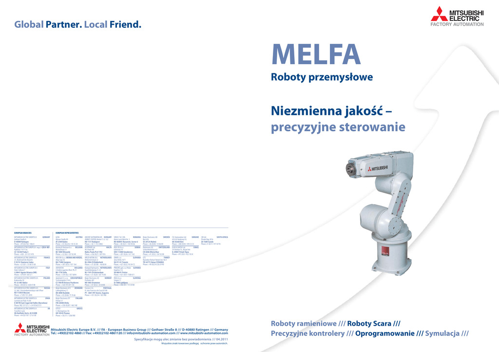 MITSUBISHI ELECTRIC Global Partner. Local Friend. FACTORY AUTOMATION MELFA Roboty przemysłowe Niezmienna jakość – precyzyjne sterowanie EUROPEAN BRANCHES EUROPEAN REPRESENTATIVES MITSUBISHI ELECTRIC EUROPE B.V. GERMANY Gothaer Straße 8 D-40880 Ratingen Phone: +49 (0)2102 / 486-0 MITSUBISHIELECTRICEUROPEB.V.-org.sl. CZECH REP. Radlická 714/113a CZ-158 00 Praha 5 Phone: +420 - 251 551 470 MITSUBISHI ELECTRIC EUROPE B.V. FRANCE 25, Boulevard des Bouvets F-92741 Nanterre Cedex Phone: +33 (0)1 / 55 68 55 68 MITSUBISHI ELECTRIC EUROPE B.V. ITALY Viale Colleoni 7 I-20041 Agrate Brianza (MB) Phone: +39 039 / 60 53 1 MITSUBISHI ELECTRIC EUROPE B.V. POLAND Krakowska 50 PL-32-083 Balice Phone: +48 (0)12 / 630 47 00 MITSUBISHI ELECTRIC EUROPE B.V. RUSSIA 52, bld. 3 Kosmodamianskaya nab 8 floor RU-115054 Мoscow Phone: +7 495 721-2070 MITSUBISHI ELECTRIC EUROPE B.V. SPAIN Carretera de Rubí 76-80 E-08190 Sant Cugat del Vallés (Barcelona) Phone: 902 131121 // +34 935653131 MITSUBISHI ELECTRIC EUROPE B.V. UK Travellers Lane UK-Hatfield, Herts. AL10 8XB Phone: +44 (0)1707 / 27 61 00 GEVA AUSTRIA Wiener Straße 89 AT-2500 Baden Phone: +43 (0)2252 / 85 55 20 Koning & Hartman b.v. BELGIUM Woluwelaan 31 BE-1800 Vilvoorde Phone: +32 (0)2 / 257 02 40 INEA BH d.o.o. BOSNIA AND HERZEG. Aleja Lipa 56 BA-71000 Sarajevo Phone: +387 (0)33 / 921 164 AKHNATON BULGARIA 4 Andrej Ljapchev Blvd. Pb 21 BG-1756 Sofia Phone: +359 (0)2 / 817 6044 AutoCont C.S. s.r.o. CZECH REPUBLIC Technologická 374/6 CZ-708 00 Ostrava-Pustkovec Phone: +420 595 691 150 Beijer Electronics A/S DENMARK Lykkegårdsvej 17 DK-4000 Roskilde Phone: +45 (0)46/ 75 76 66 Beijer Electronics OY FINLAND Peltoie 37 FIN-28400 Ulvila Phone: +358 (0)207 / 463 540 UTECO GREECE 5, Mavrogenous Str. GR-18542 Piraeus Phone: +30 211 / 1206 900 AXICONT AUTOMATIKA Kft. HUNGARY (ROBOT CENTER) Reitter F. U. 132 HU-1131 Budapest Phone: +36 1 / 412-0882 ALFATRADE Ltd. MALTA 99, Paola Hill Malta-Paola PLA 1702 Phone: +356 (0)21 / 697 816 HIFLEXAUTOM.B.V. NETHERLANDS Wolweverstraat 22 NL-2984 CD Ridderkerk Phone: +31 (0)180 – 46 60 04 Koning&Hartmanb.v. NETHERLANDS Haarlerbergweg 21-23 NL-1101 CH Amsterdam Phone: +31 (0)20 / 587 76 00 Beijer Electronics AS NORWAY Postboks 487 NO-3002 Drammen Phone: +47 (0)32 / 24 30 00 Fonseca S.A. PORTUGAL R. João Francisco do Casal 87/89 PT - 3801-997 Aveiro, Esgueira Phone: +351 (0)234 / 303 900 SIRIUS T & S SRL ROMANIA Aleea Lacul Morii Nr. 3 RO-060841 Bucuresti, Sector 6 Phone: +40 (0)21 / 430 40 06 INEA SR d.o.o. SERBIA Izletnicka 10 SER-113000 Smederevo Phone: +381 (0)26 / 617 163 SIMAPs.r.o. SLOVAKIA Jána Derku 1671 SK-911 01 Trencín Phone: +421 (0)32 743 04 72 PROCONT,spol.sr.o.Prešov SLOVAKIA Kúpelná 1/A SK-080 01 Prešov Phone: +421 (0)51 7580 611 INEA d.o.o. SLOVENIA Stegne 11 SI-1000 Ljubljana Phone: +386 (0)1 / 513 8100 Beijer Electronics AB SWEDEN Box 426 SE-20124 Malmö Phone: +46 (0)40 / 35 86 00 Robotronic AG SWITZERLAND Schlachthofstrasse 8 CH-8406 Winterthur Phone: +41 (0)52 / 267 02 00 TURKEY GTS Bayraktar Bulvari Nutuk Sok. No:5 TR-34775 Yukarı İSTANBUL Phone: +90 (0)216 526 39 90 CSC Automation Ltd. UKRAINE 4-B, M. Raskovoyi St. UA-02660 Kiev Phone: +380 (0)44 / 494 33 55 ILAN & GAVISH Ltd. ISRAEL 24 Shenkar St., Kiryat Arie IL-49001 Petah-Tiqva Phone: +972 (0)3 / 922 18 24 CBI Ltd. SOUTH AFRICA Private Bag 2016 ZA-1600 Isando Phone: 27 (0)11 / 977 0770 MITSUBISHI Mitsubishi Electric Europe B.V. /// FA - European Business Group /// Gothaer Straße 8 /// D-40880 Ratingen /// Germany ELECTRIC Tel.: +49(0)2102-4860 /// Fax: +49(0)2102-4861120 /// [email protected] /// www.mitsubishi-automation.com FACTORY AUTOMATION Specyfikacje mogą ulec zmianie bez powiadomienia /// 04.2011 Wszystkie znaki towarowe podlegaj ochronie praw autorskich. Roboty ramieniowe /// Roboty Scara /// Precyzyjne kontrolery /// Oprogramowanie /// Symulacja /// Roboty przemysłowe MELFA /// Roboty przemysłowe MELFA /// Roboty przemysłowe MELFA /// Roboty przemysłowe MELFA /// Roboty przemysłowe MELFA /// Roboty przemysłowe Roboty przemysłowe MELFA Roboty od 1,65 Euro na godzinę Biorąc pod uwagę średni czas eksploatacji robota, który w typowych zastosowaniach wynosi około 6 do 7 lat, roboty Mitsubishi charakteryzują się zaskakująco niskim Całkowitym Kosztem Własności (TCO) na poziomie 1,65 Euro na godzinę, włączając w to koszt nabycia i eksploatacji. Zastosowane w robotach silniki z drążonym wałem i przekładnie zapewniają maksymalną sztywność. Wszystkie chwytaki robotów z ramionami przegubowymi spełniają wymagania normy ISO 9409-1. Prowadzenie kabli i przewodów pneumatycznych wewnątrz robota zabezpiecza przed zaczepieniem o zewnętrzny sprzęt. Bardzo dokładne przekładnie harmoniczne pozwalają na niezwykle wysoki poziom powtarzalności. Funkcja bezczujnikowej detekcji zderzenia niezawodnie wykrywa i nie dopuszcza do powstania nieoczekiwanej kolizji. Ponad 30.000 instalacji Łatwe w programowaniu Rodzina robotów o potężnych możliwościach wymaga równie wydajnego i łatwego w użyciu oprogramowania. Mitsubishi oferuje pakiety oprogramowania RT ToolBox2 i MELFA WORKS, które są zaawansowanym narzędziem do konfiguracji i symulacji, przygotowanym dokładnie dla potrzeb Twoich aplikacji. Na całym świecie nowoczesna technologia Mitsubishi Electric jest gwarancją wzrostu rozwoju technologicznego i pomaga w odnoszeniu sukcesów rynkowych. Od 1978 roku, w różnych gałęziach przemysłu, zostało zainstalowanych ponad 30.000 aplikacji z kompaktowymi robotami Mitsubishi. Kompaktowy i ekonomiczny Mała wymagana przestrzeń do instalacji i wyjątkowa niezawodność są kluczowymi cechami wszystkich aplikacji. Szczególnie przydatny w aplikacjach dokładnego układania z powtarzalnością rzędu ±0,005 mm i czasem cyklu na poziomie 0,28 s. Tryb łagodnego sterowania osiami robota poprawia jakość procesu montażu i łączenia. Inteligentna konstrukcja Roboty Mitsubishi zawdzięczają swoją wyso