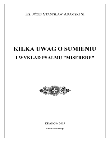 KS. JÓZEF STANISŁAW ADAMSKI SI KILKA UWAG O SUMIENIU I WYKŁAD PSALMU "MISERERE" KRAKÓW 2015 www.ultramontes.pl SPIS RZECZY Str. Wstęp ........................................................................................................................................ 3 I. Sumienie ............................................................................................................................... 3 1. Sumienie świadczy, że Bóg myśli o mnie ............................................................................. 4 2. Sumienie objawia nam wolę Bożą ........................................................................................ 7 3. Cóż to jest zgryzota? ............................................................................................................. 8 II. Psalm "Miserere" ............................................................................................................ 13 I. Część. Prośba o miłosierdzie ............................................................................................... 13 Wstęp ...................................................................................................................................... 14 Pobudki o wyjednanie miłosierdzia ........................................................................................ 15 Pobudka 1-sza "wyznanie grzechów" ..................................................................................... 15 Pobudka 2-ga "słabość natury ludzkiej" ................................................................................. 16 Pobudka 3-cia "zasługi obiecanego Zbawcy" ......................................................................... 17 II. Część. Prośba o łaskę pokuty ............................................................................................. 18 Skutki łaski pokuty .................................................................................................................. 19 Skutek 1-szy – pragnienie uwolnienia od winy ...................................................................... 19 Skutek 2-gi – nienawiść przedmiotu grzechu ......................................................................... 19 Skutek 3-ci – troskliwość o wytrwanie ................................................................................... 20 Skutek 4-ty – spokój i rącza wola ........................................................................................... 20 III. Część. Obietnica zadośćuczynienia .................................................................................. 21 1-sze Zadośćuczynienie ludowi .............................................................................................. 21 2-gie Uriaszowi ....................................................................................................................... 22 3-cie Bogu – ofiarę z nieustannego żalu ................................................................................. 23 Domówienie ............................................................................................................................ 24 –––––––––– 2 Kilka uwag o sumieniu i wykład psalmu "Miserere" KS. JÓZEF STANISŁAW ADAMSKI SI ––––––––– Po podwójnym upadku króla Dawida, uśpione chwilowym szałem sumienie, rozdziera mu serce zgryzotą. Niewysłowioną żałością skruszony Psalmista, pod natchnieniem Ducha Świętego, układa ten cudny, rzewny psalm, który po wszystkie wieki służyć będzie za wzór i modłę szczerą czyniącym pokutę. Zanim przystąpię do wyjaśnienia tego psalmu, podam kilka uwag o sumieniu i o zgryzocie czyli wyrzutach sumienia. I. SUMIENIE Gloria nostra haec est: testimonium conscientiae nostrae. "Pochwałą (chwałą) naszą, powiada Apostoł, jest świadectwo sumienia naszego" (II Kor. I, 12). Dusza ludzka jest żywym, świetlanym odblaskiem Stwórcy. Istota duszy, jak i jej władze przedstawiają głębie i bezbrzeżne wielkości... Atoli, jest w duszy ludzkiej pewien tajemniczy grunt, rzekłbym pryzmat, skupiający i streszczający całą naszą wielkość, jest nim sumienie. Jasne, promienne sumienie, to najświetlniejsza aureola chwały i wielkości człowieka; zamglone, ciemne, to jego obniżenie i hańba. Kiedy Psalmista śpiewał: "Naznamionowana jest nad nami świętość oblicza Twego, Panie" (Ps. IV, 7), chciał zaznaczyć rysy Boga w nas odbite: w umyśle, w sercu, w woli i w całym naszym jestestwie; rysy te najcudniej odzwierciedla sumienie. Bóg jest światłością oświecającą każdego 3 człowieka na ten świat przychodzącego; otóż sumienie, to słońce w duszy, to światłość zwycięska, opromieniająca nasze życie, wnikająca w najgłębsze jego tajnie. Bóg jest Prawodawcą najwyższym; Jego sprawiedliwość normuje i sankcjonuje nasze czyny, nimi kieruje i je ocenia. Boskie te prerogatywy podziela sumienie. Bóg jest nagrodzicielem i mścicielem etycznego prawa; dwie te własności cechują również tę żywą kopię Boga, sumienie. O rzeczach stworzonych napisano: "wszystkie jako szata zwietrzeją... i jako odzienie odmienią się", o Bogu zaś: Ty tenżeś jest (Ps. 101, 27. 28) niezmienny, wiekuisty; podobnie w życiu naszym wszystko się odmienia i ulega przemianom, tylko sumienie pozostaje w nas niezmienne w swej nadgranitowej stałości. Co to sumienie? Przez sumienie w ogóle rozumiemy wskazówkę (przestrogę) praktyczną rozumu o moralności czynu, dictamen practicum rationis de moralitate actionis. Pomijając dalsze wyjaśnienia, zaznaczam tylko, że sumienie: 1-o świadczy, że Bóg myśli o nas, 2-o objawia nam wolę Bożą, 3-o w duszy niewiernej wytwarza niepokój, czyli zgryzotę. 1. SUMIENIE ŚWIADCZY, ŻE BÓG MYŚLI O MNIE Bóg już teraz sądzi żywych, jak kiedyś sądzić będzie i umarłych. Judicat me. Sąd szczegółowy, pojedynczy już jest zaczęty i trwać będzie dopóki się n