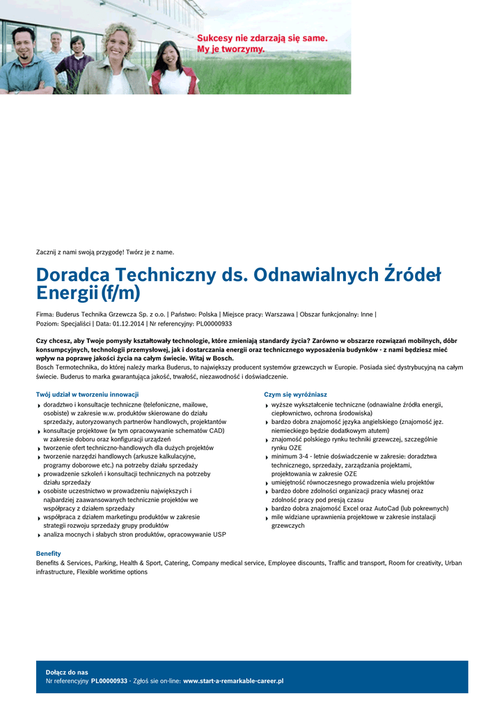 Zacznij z nami swoją przygodę! Twórz je z name. Doradca Techniczny ds. Odnawialnych Źródeł Energii (f/m) Firma: Buderus Technika Grzewcza Sp. z o.o. | Państwo: Polska | Miejsce pracy: Warszawa | Obszar funkcjonalny: Inne | Poziom: Specjaliści | Data: 01.12.2014 | Nr referencyjny: PL00000933 Czy chcesz, aby Twoje pomysły kształtowały technologie, które zmieniają standardy życia? Zarówno w obszarze rozwiązań mobilnych, dóbr konsumpcyjnych, technologii przemysłowej, jak i dostarczania energii oraz technicznego wyposażenia budynków - z nami będziesz mieć wpływ na poprawę jakości życia na całym świecie. Witaj w Bosch. Bosch Termotechnika, do której należy marka Buderus, to największy producent systemów grzewczych w Europie. Posiada sieć dystrybucyjną na całym świecie. Buderus to marka gwarantująca jakość, trwałość, niezawodność i doświadczenie. Twój udział w tworzeniu innowacji doradztwo i konsultacje techniczne (telefoniczne, mailowe, osobiste) w zakresie w.w. produktów skierowane do działu sprzedaży, autoryzowanych partnerów handlowych, projektantów konsultacje projektowe (w tym opracowywanie schematów CAD) w zakresie doboru oraz konfiguracji urządzeń tworzenie ofert techniczno-handlowych dla dużych projektów tworzenie narzędzi handlowych (arkusze kalkulacyjne, programy doborowe etc.) na potrzeby działu sprzedaży prowadzenie szkoleń i konsultacji technicznych na potrzeby działu sprzedaży osobiste uczestnictwo w prowadzeniu największych i najbardziej zaawansowanych technicznie projektów we współpracy z działem sprzedaży współpraca z działem marketingu produktów w zakresie strategii rozwoju sprzedaży grupy produktów analiza mocnych i słabych stron produktów, opracowywanie USP Czym się wyróżniasz wyższe wykształcenie techniczne (odnawialne źródła energii, ciepłownictwo, ochrona środowiska) bardzo dobra znajomość języka angielskiego (znajomość jęz. niemieckiego będzie dodatkowym atutem) znajomość polskiego rynku techniki grzewczej, szczególnie rynku OZE minimum 3-4 - letnie doświadczenie w zakresie: doradztwa technicznego, sprzedaży, zarządzania projektami, projektowania w zakresie OZE umiejętność równoczesnego prowadzenia wielu projektów bardzo dobre zdolności organizacji pracy własnej oraz zdolność pracy pod presją czasu bardzo dobra znajomość Excel oraz AutoCad (lub pokrewnych) mile widziane uprawnienia projektowe w zakresie instalacji grzewczych Benefity Benefits & Services, Parking, Health & Sport, Catering, Company medical service, Employee discounts, Traffic and transport, Room for creativity, Urban infrastructure, Flexible worktime options Dołącz do nas Nr referencyjny PL00000933 - Zgłoś sie on-line: www.start-a-remarkable-career.pl