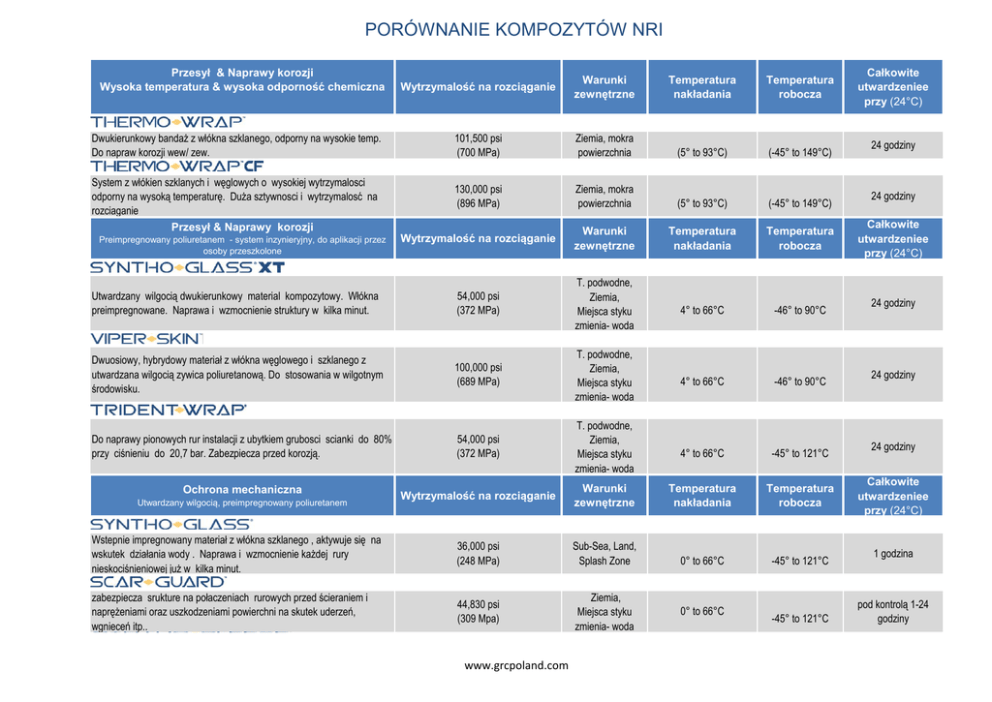 PORÓWNANIE KOMPOZYTÓW NRI Przesył & Naprawy korozji Wysoka temperatura & wysoka odporność chemiczna Wytrzymalość na rozciąganie Warunki zewnętrzne Temperatura nakładania Temperatura robocza 101,500 psi (700 MPa) Ziemia, mokra powierzchnia (5° to 93°C) (-45° to 149°C) 130,000 psi (896 MPa) Ziemia, mokra powierzchnia (5° to 93°C) (-45° to 149°C) Wytrzymalość na rozciąganie Warunki zewnętrzne Temperatura nakładania Temperatura robocza Utwardzany wilgocią dwukierunkowy material kompozytowy. Włókna preimpregnowane. Naprawa i wzmocnienie struktury w kilka minut. 54,000 psi (372 MPa) T. podwodne, Ziemia, Miejsca styku zmienia- woda 4° to 66°C -46° to 90°C Dwuosiowy, hybrydowy materiał z włókna węglowego i szklanego z utwardzana wilgocią zywica poliuretanową. Do stosowania w wilgotnym środowisku. 100,000 psi (689 MPa) T. podwodne, Ziemia, Miejsca styku zmienia- woda 4° to 66°C -46° to 90°C Do naprawy pionowych rur instalacji z ubytkiem grubosci scianki do 80% przy ciśnieniu do 20,7 bar. Zabezpiecza przed korozją. 54,000 psi (372 MPa) T. podwodne, Ziemia, Miejsca styku zmienia- woda 4° to 66°C -45° to 121°C Ochrona mechaniczna Wytrzymalość na rozciąganie Warunki zewnętrzne Temperatura nakładania Temperatura robocza Wstepnie impregnowany materiał z włókna szklanego , aktywuje się na wskutek działania wody . Naprawa i wzmocnienie każdej rury nieskociśnieniowej już w kilka minut. 36,000 psi (248 MPa) Sub-Sea, Land, Splash Zone 0° to 66°C -45° to 121°C zabezpiecza srukture na połaczeniach rurowych przed ścieraniem i naprężeniami oraz uszkodzeniami powierchni na skutek uderzeń, wgnieceń itp.. 44,830 psi (309 Mpa) Ziemia, Miejsca styku zmienia- woda Dwukierunkowy bandaż z włókna szklanego, odporny na wysokie temp. Do napraw korozji wew/ zew. System z włókien szklanych i węglowych o wysokiej wytrzymalosci odporny na wysoką temperaturę. Duża sztywnosci i wytrzymalosć na rozciaganie Przesył & Naprawy korozji Preimpregnowany poliuretanem - system inzynieryjny, do aplikacji przez osoby przeszkolone Utwardzany wilgocią, preimpregnowany poliuretanem www.grcpoland.com 0° to 66°C -45° to 121°C Całkowite utwardzeniee przy (24°C) 24 godziny 24 godziny Całkowite utwardzeniee przy (24°C) 24 godziny 24 godziny 24 godziny Całkowite utwardzeniee przy (24°C) 1 godzina pod kontrolą 1-24 godziny PORÓWNANIE KOMPOZYTÓW NRI Wytrzymalość na rozciąganie Warunki zewnętrzne 15,353 psi (106 MPa) Tereny podwodne, Ziemia, Miejsca styku zmienia- woda zaprojektowany do zapobiegania korozji lub zuzyciu sciernemu przewodow rurowych na podporach. Elimunuje potrzebe malowania rur. Swietna ochrona przeciw korozji. Impact Resistance 123 ft. lb. (167 J) Tereny podwodne, Ziemia, Miejsca styku zmienia- woda dwubiegowy materiał kompozytowy. Zapewnia doskonała ochronę przed uszkodzeniami mechanicznymi . 44,830 psi (309 Mpa) Tereny podwodne, Ziemia, Miejsca styku zmienia- woda Zapobiega działaniu korozji w miejcach narażonych na zalewanie i uderzenia fal . System składa się z Syntho Glassu oraz tasmy nasaczonej parafiną. Zapewnia zabezpieczenie machaniczne i przeciwkorozyjne rur . 36,000 psi (248 MPa) Tereny podwodne, Ziemia, Miejsca styku zmienia- woda Chroni przed działaniem promieni UV. Dwuskładnikowy material do ochrony machanicznej i przeciwdziałaniu korozji. 62,785 psi (433 MPa) Tereny podwodne, Ziemia, Miejsca styku zmienia- woda Ochrona Mechaniczna Utwardzane wilgocią, Preimpregnowane poliuretanem nieżółknący material kompozytowy zapewniajacy odpornosć na promienie UV . Do stosowania wszędzie tam gdzie problemem jest degradacja na stutek działani promieni UV. www.grcpoland.com Temperatura nakładania Temperatura robocza Całkowite utwardzeniee przy (24°C) 0° to 66°C -50° to 250°F (-45° to 121°C) 2 hrs 0° to 66°C -45° to 121°C 0° to 66°C -45° to 121°C 4° to 66°C -45° to 93°C -46° to 56°C -46° to 56°C 2 godziny 2 godziny 2 godziny 4-9 minut zalezy od ekspozycji na promienie UV PORÓWNANIE KOMPOZYTÓW NRI Wytrzymalość na rozciąganie Warunki zewnętrzne Służy do trwalego usuwania wyciekow na czynnej sieci dystrybucyjnej gazu ziemnego do cisnienia 60 psi ( 4 bary) 41,000 psi (283 MPa) Tereny podwodne, Ziemia, Miejsca styku zmienia- woda zastaw naprawczy do napraw nieszczelnosci rur z miedzi, stali nierdzewnej, PCV, FRP, betonu, gumy i innych. Naprawy wycieków na wyłączonych instalacjach lub o obniżonym ciśnieniu do 4 bar. 36,000 psi (248 MPa) Tereny podwodne, Ziemia, Miejsca styku zmienia- woda zastaw naprawczy do napraw nieszczelnosci rur z miedzi, stali nierdzewnej, PCV, FRP, betonu, gumy i innych. Naprawy wycieków na czynnych instalacjach do 21 bar. 36,000 psi (248 MPa) Tereny podwodne, Ziemia, Miejsca styku zmienia- woda Tamowanie wycieków Utwardzane wilgocia, Preimpregnowane poliuretanem www.grcpoland.com Temperatura nakładania Temperatura robocza 10° to 65°C -45° to 121°C 0° to 65°C -45° to 121°C 0° to 65°C -45° to 121°C Całkowite utwardzeniee przy (24°C) 1 godzina 1 godzina 1 godzina PORÓWNANIE KOMPOZYTÓW NRI Wypełniacze ( filery) Wytrzymalość na rozciąganie Warunki zewnętrzne dwuskłasdnikowy filer utwardzany masą epoksydową. Nie kapie. Łaczy się z wilgotnymi powierzchniami. Do stosowania z woda pitną. Odporny na działanie węglowodorów, alkoholi, ketonów, estrów,rozcieńczonych kwasów i zasad. 12,000 psi (82,7 MPa) 900 psi (6 MPa) Ziemia, Miejsca styku zmienia- woda Dwuskladnikowa wzmocniona tytanem szpachlówka epoksydowa. Do stosowania na wysokich temperaturach. Odporny na działanie węglowodorow, ketonów, alkoholi, estrow, haloweglowodorow, wodnych roztworow soli, rozcienczonych kwasów i zasad. 8,000 psi (55 MPa) 750 psi (5 MPa) Tereny podwodne, Ziemia, Miejsca styku zmienia- woda dwuskladnikowa, wzmocniona nanorurkami szpachlówka epoksydowa. Do stosowania do temperatury do 149°C. 9,700 psi (67 MPa) Ziemia 8,000 psi (55,2 MPa) 2,000 psi (14 MP