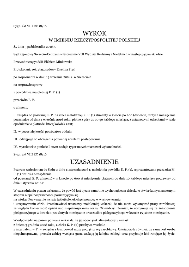 Sygn. akt VIII RC 18/16 WYROK W IMIENIU RZECZYPOSPOLITEJ POLSKIEJ S., dnia 3 października 2016 r. Sąd Rejonowy Szczecin-Centrum w Szczecinie VIII Wydział Rodzinny i Nieletnich w następującym składzie: Przewodniczący: SSR Elżbieta Minkowska Protokolant: sekretarz sądowy Ewelina Preś po rozpoznaniu w dniu 19 września 2016 r. w Szczecinie na rozprawie sprawy z powództwa małoletniej K. P. (1) przeciwko E. P. o alimenty I. zasądza od pozwanej E. P. na rzecz małoletniej K. P. (1) alimenty w kwocie po 200 (dwieście) złotych miesięcznie poczynając od dnia 1 września 2016 roku, płatne z góry do 10-go każdego miesiąca, z ustawowymi odsetkami w razie opóźnienia w płatności którejkolwiek z rat; II. w pozostałej części powództwo oddala; III. odstępuje od obciążenia pozwanej kosztami postępowania; IV. wyrokowi w punkcie I-szym nadaje rygor natychmiastowej wykonalności. Sygn. akt VIII RC 18/16 UZASADNIENIE Pozwem wniesionym do Sądu w dniu 11 stycznia 2016 r. małoletnia powódka K. P. (1), reprezentowana przez ojca M. P. (1), wniosła o zasądzenie od pozwanej E. P. alimentów w kwocie po 600 zł miesięcznie płatnych do dnia 10 każdego miesiąca począwszy od dnia 1 stycznia 2016 r. W uzasadnieniu pozwu wskazano, że powód jest ojcem samotnie wychowującym dziecko o stwierdzonym znacznym stopniu niepełnosprawności, poruszającym się na wózku. Pozwana nie wyraża jakiejkolwiek chęci pomocy w wychowywaniu i utrzymywaniu córki. Przedstawiciel ustawowy małoletniej wskazał, że nie może wykonywać pracy zarobkowej ze względu konieczność opieki nad niepełnosprawną córką. Oświadczył również, że utrzymuje się ze świadczenia pielęgnacyjnego w kwocie 1300 złotych miesięcznie oraz zasiłku pielęgnacyjnego w kwocie 153 złote miesięcznie. W odpowiedzi na pozew pozwana wskazała, że jej obowiązek alimentacyjny wygasł z dniem 3 grudnia 2008 roku, a córka K. P. (2) przebywa w szkole z internatem w P. w związku z tym powód może podjąć pracę zarobkową. Oświadczyła również, że sama jest osobą niepełnosprawną, przeszła zabieg wycięcia guza, czekają ją kolejne zabiegi oraz przyjmuje leki ratujące jej życie. Ponadto, pozwana wskazała, że sama wychowuje niepełnosprawne dziecko. Wniosła również o zwolnienie jej od obowiązku poniesienia kosztów sądowych. Na rozprawie w dniu 9 czerwca 2016 r. przedstawiciel małoletniej podtrzymał powództwo. Oświadczył ponadto, że postanowieniem z dnia 18 września 2007 roku władzę rodzicielską nad małoletnią K. P. (1) Sąd powierzył jemu, następnie wyrokiem rozwodowym z dnia 11 kwietnia 2008 roku Sąd podtrzymał orzeczenie o władzy rodzicielskiej, nadto zasądził od pozwanej na rzecz małoletniej alimenty w kwocie 200 złotych miesięcznie. Prawomocnym wyrokiem z dnia 24 stycznia 2011 roku Sąd ustalił, że powyższy obowiązek pozwanej wobec małoletniej wygasł z dniem 3 grudnia 2008 roku. Pozwana wniosła o oddalenie powództwa albowiem jej łączny dochód netto wynosi 1600 złotych, w tym renta 400 złotych i 1200 złotych wynagrodzenia. Ponadto jest osobą niepełnosprawną w stopniu umiarkowanym, może pracować, ale w niepełnym wymiarze czasu pracy. Pismem z dnia 20 czerwca 2016 r. pozwana ponownie nie wyraziła zgody na zapłatę alimentów na rzecz małoletniej K. P. (1). Wskazała, że jako osoba niepełnosprawna zmuszona jest przyjmować szereg leków, a przedstawiciel ustawowy małoletniej nie podejmuje pracy z chęci życia na koszt innych osób. Sąd ustalił następujący stan faktyczny: K. P. (1), urodzona dnia (...), jest dzieckiem M. P. (1) i E. P.. Rodzice żyją w rozłączeniu. Niesporne, a nadto: • odpis skrócony aktu urodzenia, akta sprawy o sygn. VII R Nsm 560/06, k. 5. K. P. (1) ma ukończone 17 lat, jest dzieckiem autystycznym wymagającym szczególnej opieki o orzeczonym na stałe znacznym stopniu niepełnosprawności, niezdolnym do pracy, ze znacznie ograniczoną zdolnością do samodzielnej egzystencji. Uczęszcza do Specjalnego Ośrodka Szkolno – (...) dla Dzieci Niepełnosprawnych Ruchowo w P. – aktualnie uczy się w klasie I gimnazjum. Dowód: • orzeczenie o stopniu niepełnosprawności, k. 6 • zeznania M. P. (1), k. 23, k. 53 • zaświadczenie ośrodka w P., k. 46. Postanowieniem z dnia 18 września 2007 roku Sąd Rejonowy w Szczecinie, VII Wydział Rodzinny i Nieletnich, powierzył wykonywanie władzy rodzicielskiej nad małoletnimi wówczas M. P. (2) i R. P. oraz małoletnią K. P. (1) ojcu M. P. (1), pozbawiając jednocześnie E. P. władzy rodzicielskiej. Dowód: • postanowienie Sądu Rejonowego w Szczecinie z dnia 18 września 2007 roku , VII Wydział Rodzinny i Nieletnich, akta sprawy o sygn. VII R Nsm 560/06, k. 36. Wyrokiem zaocznym z dnia 11 kwietnia 2008 roku Sąd Okręgowy w Szczecinie, X Wydział Cywilny Rodzinny, rozwiązał małżeństwo powoda M. P. (1) i pozwanej E. P. zawarte w dniu 5 stycznia 1991 roku w Urzędzie Stanu Cywilnego w S. poprzez rozwód z winy pozwanej. Wykonywanie władzy rodzicielskiej nad małoletnimi dziećmi stron, w tym nad K. P. (1), Sąd Okręgowy pozostawił bez zmian – całkowita władza rodzicielska przysługuje M. P. (1). W tymże wyroku Sąd Okręgowy obciążył ponadto oboje rodziców kosztami utrzymania i wychowania małoletnich dzieci stron – z tego tytułu zasądzając od pozwanej E. P. na rzecz małoletnich wówczas M. P. (2) i R. P. oraz małoletniej K. P. (1) rentę alimentacyjną w kwocie po 200 złotych na każde z małoletnich dzieci płatne z góry do dnia 10-ego każdego miesiąca wraz z odsetkami ustawowymi w razie opóźnienia płatności którejkolwiek z rat. Dowód: • wyrok Sądu Okręgowego z dnia 11 kwietnia 2008 roku, X Wydział Cywilny Rodzinny, akta sprawy o sygn. X RC 2863/07, k. 109. Pismem wniesionym do Sądu Rejonowego Szczecin – Centrum w Szczecinie dnia 11 października 2010 r. E. P. wniosła o uchylenie obowiązku alimentacyjnego. Swoją prośb