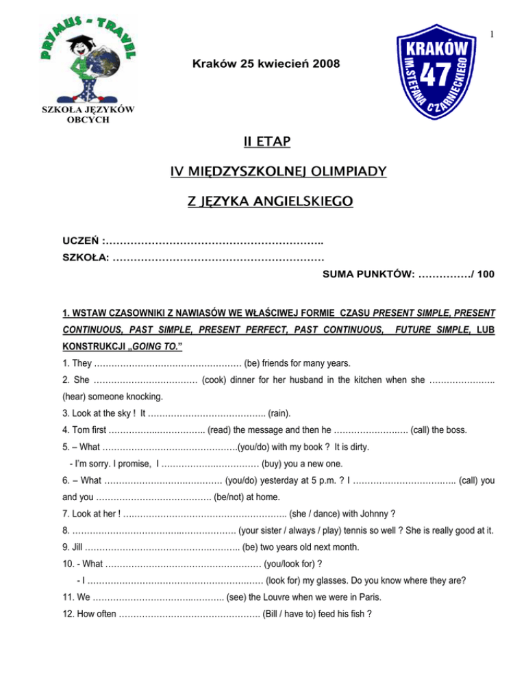 1 Kraków 25 kwiecień 2008 SZKOŁA JĘZYKÓW OBCYCH II ETAP IV MIĘDZYSZKOLNEJ OLIMPIADY Z JĘZYKA ANGIELSKIEGO UCZEŃ :…………………………………………………….. SZKOŁA: …………………………………………………… SUMA PUNKTÓW: ……………/ 100 1. WSTAW CZASOWNIKI Z NAWIASÓW WE WŁAŚCIWEJ FORMIE CZASU PRESENT SIMPLE, PRESENT CONTINUOUS, PAST SIMPLE, PRESENT PERFECT, PAST CONTINUOUS, FUTURE SIMPLE, LUB KONSTRUKCJI „GOING TO.” 1. They …………………………………………… (be) friends for many years. 2. She ……………………………… (cook) dinner for her husband in the kitchen when she ………………….. (hear) someone knocking. 3. Look at the sky ! It ………………………………….. (rain). 4. Tom first ……………..…………….. (read) the message and then he ………………….…. (call) the boss. 5. – What ……………………….……………….(you/do) with my book ? It is dirty. - I’m sorry. I promise, I ……………….…………… (buy) you a new one. 6. – What ……………………….…………. (you/do) yesterday at 5 p.m. ? I ………………………….….. (call) you and you …………………………………. (be/not) at home. 7. Look at her ! ….…………………………………………….. (she / dance) with Johnny ? 8. ………………………………..………………. (your sister / always / play) tennis so well ? She is really good at it. 9. Jill …………………………………….……….. (be) two years old next month. 10. - What ……………………………………………… (you/look for) ? - I ……………………………………………….…… (look for) my glasses. Do you know where they are? 11. We ……………………………..……….. (see) the Louvre when we were in Paris. 12. How often …………………………………………. (Bill / have to) feed his fish ? 2 13. Cities ……………………..………….. (become) bigger and busier nowadays. 14. The train …………………………….. (leave) at 3 p.m. ………..…./20 2. PODAJ POPRAWNE FORMY CZASOWNIKÓW WYRAśAJĄC JE W I LUB II ZDANIU WARUNKOWYM. 1. If I ……………………………………….…….. (not / find) a good job, I would move to the USA. 2. We are waiting for Alice. If she ……………………………….…………..(not/come) home early, we ……………………………………. (not/go) shopping today. 3. Unless you ……………………………….. (buy) a computer, you ………………………. (not/get) connection to the Internet. 4. If I …………….…………… (know) all the answers, I …………………….…… (be) the cleverest man in the world, but I am not. 5. If I find your keys, I ………………..…………… (let) you know. 6. I ………………………………… (not/help) you unless you ……………………..……… (be) kind to me. 7. If it ………………….... (be) sunny tomorrow, we ……………….…………..…. (have) a picnic. 8. What a pity this house doesn’t have a garden ! We …………………………….. (buy) it if it ………………….……… (have) a garden. 9. If you ……………………….………. (be) thirsty, drink some mineral water. 10. Where would you go on holiday if you …………………….…………….. (be) very rich ? ……………/16 3. WSTAW PRZYMIOTNIKI Z NAWIASÓW WE WŁAŚCIWEJ FORMIE. 1. This is …………………..……………… (bad) time to drive through the city. 2. This is ………………………..………….. (funny) book I have ever read. 3. The red book is ………………………………… (thick) than the blue one. 4. Mary was tall and thin. She was ……………………………………. (thin) than her sister, Alice. 5. You know the fairy tale ending : ‘and they lived ……………………………..…… (happy) ever after.’ 6. I think maths is …………………………………………… (difficult) than history. 7. We are not as ………………………………. (fat) as they are. 8. The …………………….……. (good) month to visit Greece is September. 9. On Friday I’ll be as ……………………..….. (busy) as on Thursday, but Wednesday is usually …………………….… (busy) day in my office. ……………/10 3 4. PRZETŁUMACZ FRAGMENTY ZDAŃ LUB WYRAZY Z NAWIASÓW NA JĘZYK ANGIELSKI. 1. (Ja mam) ……………………………………………….. a cat for three years. 2. What …………………………………….. (robiłeś) when I …………………….…….. (zadzwoniłem) you ? 3. I …………………………..…………….. (nie byłem) abroad since 2005. 4. I …………………………………….... (interesuję się) modern cinema. 5. …………………………………………………. (czy kiedykolwiek jadłeś) snails? 6. Old people …………………………………………. (nie muszą) work. 7. (Czy mogłaby mi Pani powiedzieć) …………………………………………………………. where the bank is ? 8. In Warsaw …………………………….. (są) some good restaurants. 9. I ……………………………………………………..( nie chciałbym rozmawiać z) Dr Smith tomorrow morning. ……………/20 5. UŁÓś PYTANIA DO NASTĘPUJĄCYCH ODPOWIEDZI, PYTAJĄC O PODKREŚLONĄ CZĘŚĆ ZDANIA. 1. ……………………………………………………………………………………………………………….. Last Saturday Sidi and Nobi walked to the mountains. 2. ………………………………………………………………………………………………………………. I have been here for two weeks. 3. …………………………