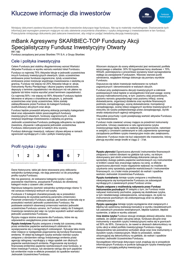 Kluczowe informacje dla inwestorów Niniejszy dokument zawiera kluczowe informacje dla inwestorów dotyczące tego funduszu. Nie są to materiały marketingowe. Dostarczenie tych informacji jest wymogiem prawnym mającym na celu ułatwienie zrozumienia charakteru i ryzyka związanego z inwestowaniem w ten fundusz. Przeczytanie niniejszego dokumentu jest zalecane inwestorowi, aby mógł on podjąć świadomą decyzję inwestycyjną. mBank Agresywny SKARBIEC-TOP Funduszy Akcji Specjalistyczny Fundusz Inwestycyjny Otwarty RFi 180 Fundusz zarządzany jest przez Skarbiec TFI S.A. z Grupy Skarbiec Cele i polityka inwestycyjna Celem Funduszu jest stabilny długoterminowy wzrost Wartości Aktywów Funduszu w wyniku wzrostu wartości lokat Funduszu. Fundusz co najmniej 75% Aktywów lokuje w jednostki uczestnictwa innych funduszy inwestycyjnych otwartych, tytułu uczestnictwa emitowane przez fundusze zagraniczne, tytuły uczestnictwa emitowane przez instytucje wspólnego inwestowania z siedzibą za granicą. Fundusz nie więcej niż 25% Aktywów lokuje w: akcje, Instrumenty Rynku Pieniężnego i dłużne papiery wartościowe, depozyty o terminie zapadalności nie dłuższym niż rok płatne na żądanie lub które można wycofać przed terminem zapadalności. Co najmniej 50% i nie więcej niż 95% Aktywów Funduszu będzie lokowane w aktywa o charakterze akcyjnym, tj. jednostki uczestnictwa oraz tytuły uczestnictwa, które zostały zaklasyfikowane przez Fundusz do kategorii funduszy (subfunduszy) akcyjnych oraz akcje. Fundusz będzie prowadził aktywną alokację pomiędzy kategoriami lokat oraz odpowiedni dobór poszczególnych funduszy inwestycyjnych otwartych, funduszy zagranicznych, a także instytucji wspólnego inwestowania z siedzibą za granicą. Jednostki uczestnictwa Funduszu podlegają odkupieniu na żądanie inwestora, zbywanie i odkupywanie jednostek uczestnictwa Funduszu dokonywane jest w każdym dniu wyceny. Fundusz dokonując inwestycji, nabywa i zbywa aktywa w ramach ograniczeń wynikających z celu i polityki inwestycyjnej. Wzorcem służącym do oceny efektywności jest rentowność portfela wzorcowego o składzie: 30% 52-tygodniowe bony skarbowe + 70% WIG20, pomniejszona o procentowo wyrażony koszt wynagrodzenia stałego za zarządzanie Funduszem. Wzorzec stanowi punkt odniesienia, względem którego dokonuje się pomiaru wyników Funduszu. Dopuszcza się także inwestycje realizowane na rynkach zagranicznych i denominowane w walutach obcych. Fundusz przy podejmowaniu decyzji inwestycyjnych w zakresie podstawowych lokat będzie w szczególności brał pod uwagę: ocenę sytuacji makroekonomicznej, w tym: poziomu stóp procentowych, poziomu wzrostu gospodarczego oraz poziomu inflacji, ocenę doświadczenia, organizacji działania oraz wyników finansowych podmiotu zarządzającego, ocenę doświadczenia i kompetencji zarządzającego, ocenę relacji osiąganych wyników inwestycyjnych w stosunku do ryzyka podejmowanego przez zarządzającego, wyniki analiz statystycznych agencji ratingowych. Wszystkie przychody i zyski powiększają wartość aktywów Funduszu i są reinwestowane. Fundusz może zawierać umowy mające za przedmiot instrumenty pochodne. Umowy zawierane w celu ograniczenia ryzyka inwestycyjnego będą miały za zadanie jego ograniczanie, natomiast w związku z umowami zawieranymi w celu zapewnienia sprawnego zarządzania portfelem ryzyko inwestycyjne może ulec zwiększeniu. Zalecenie: Fundusz może nie być odpowiedni dla inwestorów, którzy planują wycofać swoje środki w ciągu 2 - 3 lat. Profil ryzyka i zysku 1 2 3 Niższe ryzyko/potencjalnie niższe zyski 4 5 6 7 Wyższe ryzyko/potencjalnie wyższe zyski Dane historyczne, takie jak dane stosowane przy obliczaniu wskaźnika syntetycznego, nie dają pewności co do przyszłego profilu ryzyka Funduszu. Nie ma gwarancji, że wskazana kategoria ryzyka i zysku pozostanie niezmienna, przypisanie Funduszu do określonej kategorii może z czasem ulec zmianie. Najniższa kategoria (wartość wskaźnika syntetycznego równa 1) nie oznacza inwestycji wolnych od ryzyka. Fundusze z 5 kategorii charakteryzowały się w przeszłości umiarkowaną do wysokiej wartością parametru zmienności. Parametr zmienności Funduszu opisuje, jak bardzo zmieniała się w przeszłości wartość jednostki uczestnictwa Funduszu. Na podstawie ostatnich obserwacji zmienności wartości jednostki uczestnictwa Funduszu uznano, że Fundusz należy do 5 kategorii. Inwestycja narażona jest więc na ryzyko wysokich wahań wartości jednostki uczestnictwa Funduszu. Ryzyka mające istotne znaczenie dla Funduszu, które nie są odpowiednio uwzględnione przez wskaźnik: Ryzyko kredytowe Ryzyko związane z trwałą lub czasową utratą przez emitentów papierów wartościowych zdolności do wywiązywania się z zaciągniętych zobowiązań. Sytuacja taka może mieć miejsce w następstwie pogorszenia się kondycji finansowej emitenta. W skład tej kategorii ryzyka wchodzi również ryzyko związane z obniżeniem ratingu kredytowego emitenta przez agencję ratingową i wynikający z niego spadek cen dłużnych papierów wartościowych emitenta. Pogorszenie się kondycji finansowej emitentów papierów wartościowych oraz funduszy, w które inwestuje Fundusz, lub obniżenie ratingu dla tych papierów lub emitentów może w efekcie prowadzić do spadków wartości Jednostek Uczestnictwa Funduszu. Ryzyko płynności Ograniczona płynność instrumentów finansowych związana z niskimi obrotami na giełdzie lub rynku, na którym dokonywany jest obrót uniemożliwiają dokonanie zakupu lub sprzedaży dużego pakietu papierów wartościowych czy instrumentów w krótkim czasie bez znacznego wpływu na cenę, w efekcie ograniczona płynność może negatywnie wpływać na możliwe do uzyskania ceny sprzedaży papierów wartościowych i instrumentów finansowych, co z kolei może prowadzić do wahań i spadków wartości Jednostek Uczestnictwa Funduszu.