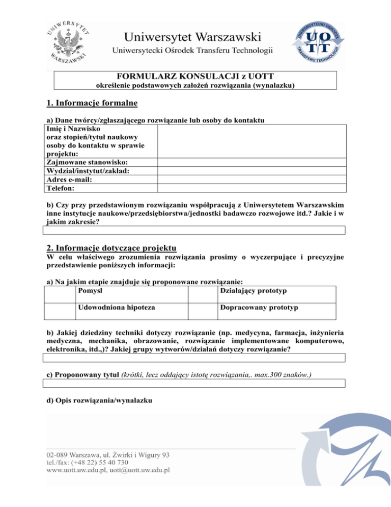 FORMULARZ KONSULACJI z UOTT określenie podstawowych założeń rozwiązania (wynalazku) 1. Informacje formalne a) Dane twórcy/zgłaszającego rozwiązanie lub osoby do kontaktu Imię i Nazwisko oraz stopień/tytuł naukowy osoby do kontaktu w sprawie projektu: Zajmowane stanowisko: Wydział/instytut/zakład: Adres e-mail: Telefon: b) Czy przy przedstawionym rozwiązaniu współpracują z Uniwersytetem Warszawskim inne instytucje naukowe/przedsiębiorstwa/jednostki badawczo rozwojowe itd.? Jakie i w jakim zakresie? 2. Informacje dotyczące projektu W celu właściwego zrozumienia rozwiązania prosimy o wyczerpujące i precyzyjne przedstawienie poniższych informacji: a) Na jakim etapie znajduje się proponowane rozwiązanie: Pomysł Działający prototyp Udowodniona hipoteza Dopracowany prototyp b) Jakiej dziedziny techniki dotyczy rozwiązanie (np. medycyna, farmacja, inżynieria medyczna, mechanika, obrazowanie, rozwiązanie implementowane komputerowo, elektronika, itd.,)? Jakiej grupy wytworów/działań dotyczy rozwiązanie? c) Proponowany tytuł (krótki, lecz oddający istotę rozwiązania,. max.300 znaków.) d) Opis rozwiązania/wynalazku UWAGA! Jeżeli niniejszy formularz ma służyć jedynie do wstępnego zapoznania się z projektem i/lub przedstawiania rozwiązania partnerom zewnętrznym można wypełnić jedynie część dotyczącą streszczenia (d2) pomijając części d1, e, f, g. W pozostałych przypadkach wskazane jest wypełnienie wszystkich części, w tym dotyczącej szczegółowego opisu projektu. d1) Szczegółowy opis rozwiązania (max. 5 tys. znaków, może być w języku angielskim): Należy przedstawić krótki opis istoty technicznej rozwiązania wykazujący jego przewagę nad znanymi rozwiązaniami technicznymi, które ściśle wiążą się z przedstawianym rozwiązaniem (rozwiązania podobne, alternatywne, zbliżone, rozwiązujące podobny problem techniczny, rozwiązania, dla których wynalazek jest ulepszeniem itd.) i wyjaśnić, na czym polega nowatorstwo prezentowanego rozwiązania. Należy przedstawić szczegółowo nowe i charakterystyczne cechy wynalazku (np. materiały, procesy i ich etapy, środki techniczne), które opisują rozwiązanie w sposób umożliwiający jasne zrozumienie jego istoty oraz wykazują jego nowość i nieoczywistość. Można przedstawić rysunki, schematy etc., i opatrzyć je odsyłaczami numerycznymi również zawartymi w opisie. Czy dla rozwiązania są już konkretne przykłady jego wykonania. Jeśli tak to prosimy opisać, choć jeden taki przykład. d2) Streszczenie rozwiązania (max. 2 tys. znaków, może być w języku angielskim): W streszczeniu należy opisać rozwiązanie bez ujawniania szczegółów technicznych (istoty wynalazku), tak aby streszczenie to można było wykorzystać do wstępnego zapoznania się z projektem i kontaktów z zewnętrznymi partnerami bez konieczności zawierania umowy o poufności. e) Jaki problem techniczny rozwiązuje przedstawione rozwiązanie? (max. 1500 znaków) f) Przedstaw w kilku punktach zalety rozwiązania/wynalazku. g) Przedstaw w kilku punktach wady rozwiązania/wynalazku. h) Lista wcześniejszych publikacji Należy wskazać listę wcześniejszych publikacji, doniesień zjazdowych i innych publicznych wypowiedzi, z których osoby postronne mogłyby odkryć istotę techniczną rozwiązania/wynalazku. Warto załączyć kopie takich publikacji czy streszczeń wypowiedzi, w których mogło dojść do ujawnienia. i) Planowane publikacje Proszę podać daty wszystkich planowanych publikacji, doniesień zjazdowych, kontaktów biznesowych itp., które będą w jakikolwiek sposób związane z wynalazkiem j) Prosimy podać słowa kluczowe po angielsku i po polsku dotyczące wynalazku. k) Prosimy podać nieprzekraczalny termin dokonania zgłoszenia patentowego. 3) Możliwości komercyjne projektu a) Kto może być potencjalnie zainteresowany wykorzystaniem/zastosowaniem rozwiązania w swojej działalności/przedsiębiorstwie? Czy potencjalne wykorzystanie rozwiązania będzie ograniczone do Polski czy może być ono wykorzystane w innych krajach/rynkach? b) Czy jakaś firma/instytucja/przedsiębiorstwo interesowało się przedstawionym rozwiązaniem? Kto i w jakim zakresie? UWAGA: Należy mieć świadomość, że zdolność patentowa wynalazku może zostać nieodwołalnie utracona nawet, jeśli został on prawidłowo zgłoszony do ochrony, jeśli przed datą zgłoszenia (pierwszeństwa) wynalazek został: opublikowany, użyty np. w celach handlowych, przedstawiony innej osobie bez zobowiązania jej do zachowania tajemnicy (najlepiej w formie pisemnej).