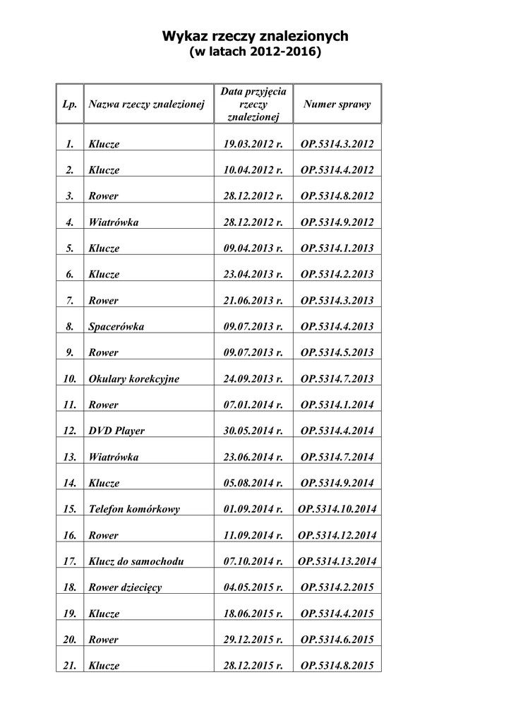 Wykaz rzeczy znalezionych (w latach 2012-2016) Lp. Nazwa rzeczy znalezionej Data przyjęcia rzeczy znalezionej Numer sprawy 1. Klucze 19.03.2012 r. OP.5314.3.2012 2. Klucze 10.04.2012 r. OP.5314.4.2012 3. Rower 28.12.2012 r. OP.5314.8.2012 4. Wiatrówka 28.12.2012 r. OP.5314.9.2012 5. Klucze 09.04.2013 r. OP.5314.1.2013 6. Klucze 23.04.2013 r. OP.5314.2.2013 7. Rower 21.06.2013 r. OP.5314.3.2013 8. Spacerówka 09.07.2013 r. OP.5314.4.2013 9. Rower 09.07.2013 r. OP.5314.5.2013 10. Okulary korekcyjne 24.09.2013 r. OP.5314.7.2013 11. Rower 07.01.2014 r. OP.5314.1.2014 12. DVD Player 30.05.2014 r. OP.5314.4.2014 13. Wiatrówka 23.06.2014 r. OP.5314.7.2014 14. Klucze 05.08.2014 r. OP.5314.9.2014 15. Telefon komórkowy 01.09.2014 r. OP.5314.10.2014 16. Rower 11.09.2014 r. OP.5314.12.2014 17. Klucz do samochodu 07.10.2014 r. OP.5314.13.2014 18. Rower dziecięcy 04.05.2015 r. OP.5314.2.2015 19. Klucze 18.06.2015 r. OP.5314.4.2015 20. Rower 29.12.2015 r. OP.5314.6.2015 21. Klucze 28.12.2015 r. OP.5314.8.2015 22. Portfel damski 30.12.2015r. OP.5314.9.2015 23. Telefon komórkowy 08.02.2016r. OP.5314.2.2016 24. Kosiarka 03.06.2016 r. OP.5314.4.2016 25. Klucze 22.07.2016 r. OP.5314.5.2016
