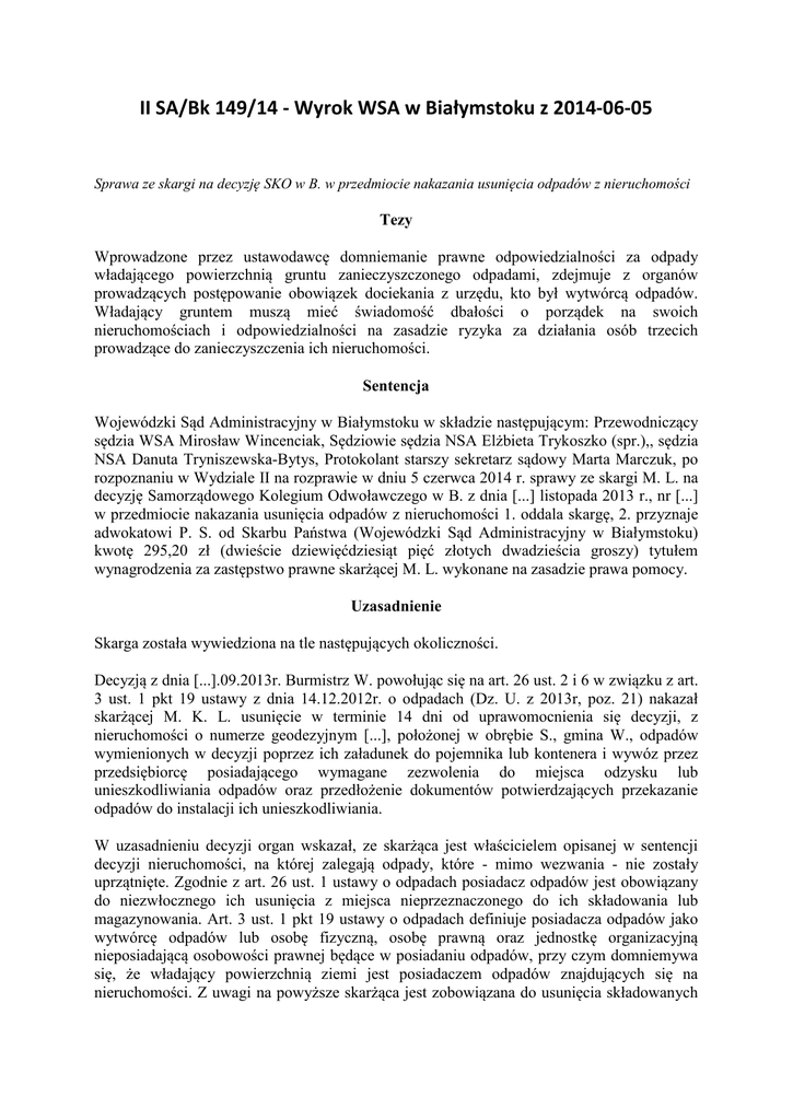 II SA/Bk 149/14 - Wyrok WSA w Białymstoku z 2014-06-05 Sprawa ze skargi na decyzję SKO w B. w przedmiocie nakazania usunięcia odpadów z nieruchomości Tezy Wprowadzone przez ustawodawcę domniemanie prawne odpowiedzialności za odpady władającego powierzchnią gruntu zanieczyszczonego odpadami, zdejmuje z organów prowadzących postępowanie obowiązek dociekania z urzędu, kto był wytwórcą odpadów. Władający gruntem muszą mieć świadomość dbałości o porządek na swoich nieruchomościach i odpowiedzialności na zasadzie ryzyka za działania osób trzecich prowadzące do zanieczyszczenia ich nieruchomości. Sentencja Wojewódzki Sąd Administracyjny w Białymstoku w składzie następującym: Przewodniczący sędzia WSA Mirosław Wincenciak, Sędziowie sędzia NSA Elżbieta Trykoszko (spr.),, sędzia NSA Danuta Tryniszewska-Bytys, Protokolant starszy sekretarz sądowy Marta Marczuk, po rozpoznaniu w Wydziale II na rozprawie w dniu 5 czerwca 2014 r. sprawy ze skargi M. L. na decyzję Samorządowego Kolegium Odwoławczego w B. z dnia [...] listopada 2013 r., nr [...] w przedmiocie nakazania usunięcia odpadów z nieruchomości 1. oddala skargę, 2. przyznaje adwokatowi P. S. od Skarbu Państwa (Wojewódzki Sąd Administracyjny w Białymstoku) kwotę 295,20 zł (dwieście dziewięćdziesiąt pięć złotych dwadzieścia groszy) tytułem wynagrodzenia za zastępstwo prawne skarżącej M. L. wykonane na zasadzie prawa pomocy. Uzasadnienie Skarga została wywiedziona na tle następujących okoliczności. Decyzją z dnia [...].09.2013r. Burmistrz W. powołując się na art. 26 ust. 2 i 6 w związku z art. 3 ust. 1 pkt 19 ustawy z dnia 14.12.2012r. o odpadach (Dz. U. z 2013r, poz. 21) nakazał skarżącej M. K. L. usunięcie w terminie 14 dni od uprawomocnienia się decyzji, z nieruchomości o numerze geodezyjnym [...], położonej w obrębie S., gmina W., odpadów wymienionych w decyzji poprzez ich załadunek do pojemnika lub kontenera i wywóz przez przedsiębiorcę posiadającego wymagane zezwolenia do miejsca odzysku lub unieszkodliwiania odpadów oraz przedłożenie dokumentów potwierdzających przekazanie odpadów do instalacji ich unieszkodliwiania. W uzasadnieniu decyzji organ wskazał, ze skarżąca jest właścicielem opisanej w sentencji decyzji nieruchomości, na której zalegają odpady, które - mimo wezwania - nie zostały uprzątnięte. Zgodnie z art. 26 ust. 1 ustawy o odpadach posiadacz odpadów jest obowiązany do niezwłocznego ich usunięcia z miejsca nieprzeznaczonego do ich składowania lub magazynowania. Art. 3 ust. 1 pkt 19 ustawy o odpadach definiuje posiadacza odpadów jako wytwórcę odpadów lub osobę fizyczną, osobę prawną oraz jednostkę organizacyjną nieposiadającą osobowości prawnej będące w posiadaniu odpadów, przy czym domniemywa się, że władający powierzchnią ziemi jest posiadaczem odpadów znajdujących się na nieruchomości. Z uwagi na powyższe skarżąca jest zobowiązana do usunięcia składowanych na jej działce odpadów. Załącznikiem decyzji organ uczynił fotografie obrazujące stan nieruchomości skarżącej. W odwołaniu od tej decyzji M. K. L. zarzuciła organowi brak ustalenia osoby posiadacza odpadów. Zaprzeczyła, by była posiadaczką odpadów składowanych nielegalnie na jej nieruchomości oddalonej od jej miejsca zamieszkania. Stwierdziła, że organy administracji publicznej i policja dysponują narzędziami organizacyjno - prawnymi pozwalającymi na ustalenie osób, które dopuszczają się naruszenia prawa urządzając na jej nieruchomości "dzikie wysypisko". Samorządowe Kolegium Odwoławcze w B. po rozpoznaniu powyższego odwołania decyzją z dnia [...].11.2013r. orzekło o uchyleniu decyzji organu I instancji w części stwierdzającej, że załącznikiem decyzji są fotografie a w pozostałym zakresie orzekło o utrzymaniu w mocy decyzji pierwszoinstancyjnej. W uzasadnieniu decyzji odwoławczej organ powtórzył treść art. 26 ust. 1 i ust. 2 ustawy o odpadach oraz art. 3 ust. 1 pkt 19 ustawy o odpadach definiującego posiadacza odpadów. Stwierdził, że skarżąca jako właściciel nieruchomości o numerze [...] położonej w obrębie S., gmina W., wobec braku innego podmiotu władającego nieruchomością, jest zobowiązana do usunięcia znajdujących się na niej odpadów, gdyż nie jest to teren przeznaczony do składowania lub magazynowania odpadów w rozumieniu przepisów ustawy. Kolegium stwierdziło, że postępowanie administracyjne przeprowadzone zostało bez naruszenia norm proceduralnych a ustalone przez organ fakty nie są kwestionowane przez odwołującą się. Podważanie istnienia obowiązku usunięcia odpadów w świetle faktów i treści przepisów prawa, jest niezasadne. W petitum skargi wywiedzionej do sądu administracyjnego na opisaną wyżej decyzję kolegium, M. K. L. zarzuciła decyzji naruszenie przepisów o postępowaniu administracyjnym dające podstawę do wznowienia postępowania administracyjnego. W uzasadnieniu skargi natomiast stwierdziła, że organ nie rozważył wnikliwie okoliczności mogących mieć znaczenie dla sprawy oraz nie wskazał, na jakich dowodach oparł domniemanie, że właściciel nieruchomości rolnej jest właścicielem śmieci. Podała, że likwidacja dzikich wysypisk śmieci należy do bieżących zadań gminy. Gdy wysypisko znajduje się na terenie gminy oraz nie jest możliwe określenie, kto jest właścicielem odpadów, obowiązek likwidacji wysypiska należy do gminy. Domniemanie, że posiadaczem śmieci jest właściciel nieruchomości może zostać obalone dowodem przeciwnym. Organ zaniechał przeprowadzenia takiego dowodu, przy czym organ I instancji nie przeprowadził żadnego postępowania w celu sprawdzenia kto jest właścicielem odpadów, mimo że wszelkie okoliczności wskazywały, że nie jest nim właściciel nieruchomości. Taka postawa organu prowadzi do bezkarności osób zanieczyszczających środowisko, nierespektowania 